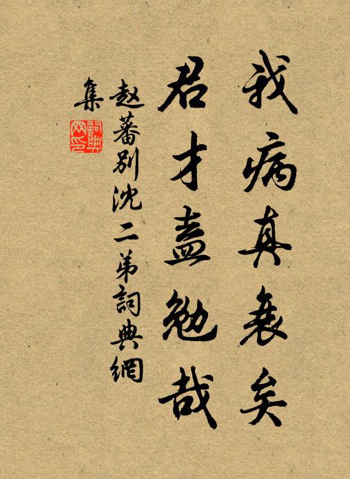 古詩文歷史字典書法欣賞書法字典國語詞典說文解字康熙字典古漢語字典我病真衰矣,君才盍勉哉趙蕃 《別沈二弟》名句出處出自宋代趙蕃的《別沈二弟》全文:一別動五載,此生能幾回。其間何不有,只是恐生哀。我病真衰矣,君才盍勉哉。要留還索去,風雨更漼漼。趙蕃詩詞大全名句書法欣賞我病真衰矣,君才盍勉哉書法作品趙蕃名句,別沈二弟名句名句推薦若非債主,便是冤家釋曇華《偈頌六十首》丈室安居,延賓不扃段成式《游長安諸寺聯句常樂坊趙景公寺題約公院》醉拍滿缸香雪,寫竭一池濃墨,逸氣正飄颻程珌《水調歌頭(於壁,一懷以歸)》眼睛不明,世界崢嶸釋德光《偈頌十首》終求郢妙雕金相,時獻香花禮粹顏釋契適《觀音詩》毒暑澄為冷,高塵滌還清皎然《同薛員外誼喜雨詩兼上楊使君》花深深,柳陰陰陳東甫《長相思·花深深》關山凌旦開,石路無塵埃王勃《散關晨度》新豐雞犬路終迷,廬下簾溪非故溪陳普《石堂》老去合為三徑計,就中聊借一枝棲朱岩伯《書延福寺壁》兒童與走卒,人人歌相國樓鑰《史少師賜第賞芍藥分韻得木字》雲旗廟貌拜行人,功罪千秋問鬼神嚴遂成《烏江項王廟》襟素倘相越,取捨誰為偏戴栩《寄題林上舍真意堂用其元和淵明韻二首》棟驤非玉鎮,朴斲僅塗茨宋理宗《重修復古殿紀事》絳囊團團余幾璧,因來送我公莫惜黃庭堅《奉謝劉景文送團茶》詩詞推薦剡中贈張卿侍御嚴維〔唐代〕辟疆年正少,公子貴初還。早列月卿位,新參柱史班。千夫馳驛道,駟馬入家山。深巷烏衣盛,高門畫戟閒。逶迤即事樓鑰〔宋代〕睡重不知曉,山高意得秋。風來已落葉,潦去忽中洲。幽閴素所願,登臨儘自由。瀕溪千萬壑,何日上扁舟。頌古三十八首釋慧方〔宋代〕日面月面,頭頭出現。捏聚放開,成團萬片。樂庵李先生居南床論張同知不行掛冠而歸賦二馬先覺〔宋代〕聞健即收身,歸耕躬饁餉。詩中句堂堂,床頭春盎盎。寒花晚更香,霜節老益壯。相對無俗情,端的羲皇上。赤壁詞/念奴嬌陸游〔宋代〕禁門鍾曉,憶君來朝路,初翔鸞鵠。西府中台推獨步,行對金蓮宮燭。蹙繡華韉,仙葩寶帶,看即飛騰速。人生難贈石工二首姚勉〔宋代〕削玉裁成巧自然,雲根水骨更無堅。不知可助媧皇否,補取人間缺處天。半隱詩廖行之〔宋代〕遠引未能忘世,端居且學灰心。定自隨時隱見,應非與俗浮湛。和黃充實榴花陳師道〔宋代〕春去花隨盡,紅榴暖欲然。後時何所恨,處獨不祈憐。葉葉自相偶,重重久更鮮。流珠沾暑雨,改色淡朝煙。著子題郭水堅畫美人二首張鎡〔宋代〕雪嚲釵梁倚鬢鴉,玉溫冰潔謝鉛華。欲知占斷人間韻,便是春風最後花。謁侍郎李先生程公許〔宋代〕賦就凌霄意欲仙,卻飛霞佩武陵源。桃花總是甘棠舊,重與郎君憩鹿轓。