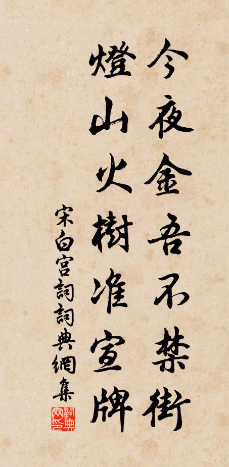 古詩文歷史字典書法欣賞書法字典國語詞典說文解字康熙字典古漢語字典今夜金吾不禁街,燈山火樹準宣牌宋白 《宮詞》名句出處出自宋代宋白的《宮詞》全文:今夜金吾不禁街,燈山火樹準宣牌。長安一片星河裡,丹鳳樓高眾樂諧。宋白詩詞大全名句書法欣賞今夜金吾不禁街,燈山火樹準宣牌書法作品宋白名句,宮詞名句名句推薦雨滴篷聲青雀舫,浪搖花影白蓮池白居易《池上小宴問程秀才》俯視九萬里,元氣青團團柯九思《送林彥清歸永嘉》低垂簾四面鄧肅《菩薩蠻(十之二)》一點無相真如,澄澄湛湛,內外難分別尹志平《無俗念 龍陽觀道眾索》玉盤大小亂珠迸張先《剪牡丹·舟中聞雙琵琶》棠枯絳葉盡,蘆凍白花輕陰鏗《和傅郎歲暮還湘洲詩》瑜玉在佩,綦組明兮佚名《寶祐二年皇子冠二十首》仍教百餘日,迎送直廳前元稹《直台》云何謂直,養此氣耶彭龜年《胡廣文以直養名堂余舉伊川之說問之往反數十》彼造物者,云何不為白居易《無可奈何歌》素娥閱人多矣,不怕雪添頭李曾伯《水調歌頭(自和)》五更人語起江城,歌笑喧喧天欲明張耒《冬至贈潘郎二首》寒塘鷗自聚,荒歲鶴同飢林景熙《雪後》溫泉暖滑留余香,芙蓉出水紅生光姚勉《題楊妃出浴圖》不與賢者俱,飽食何所學梅堯臣《同諸韓飲曼叔家》詩詞推薦明皇按樂圖劉克莊〔宋代〕鶯啼花開春晝遲,掖庭無事方遨嬉。廣平策免曲江去,十郎談笑居台司。屏間無逸不復睹,教雞能斗馬能舞。戲呼西上辭母墳陳去疾〔唐代〕高蓋山頭日影微,黃昏獨立宿禽稀。林間滴酒空垂淚,不見丁寧囑早歸。卜運算元陳師道〔宋代〕搖風影似凝,帶雪香如抱。開盡南枝到北枝,不道春將老。飄颻姑射仙,誰識冰肌好。會有青綾夢覺人,可愛池塘用韻酬翟曾二倅和章虞儔〔宋代〕那得朝朝瓊樹新,擁爐添炭費烏銀。試呵凍筆還搜句,淺酌香醪未計巡。過眼年華休恨晚,轉頭天令即行春。紛紛關下崔道融〔唐代〕百二山河壯帝畿,關門何事更開遲。應從漏卻田文後,每度聞雞不免疑。寧宗郊前朝獻景靈宮二十四首真宗〔宋代〕筆基駿命,蛩右鴻業。鼎 * 將,垂固萬葉。靈貺具臻,神光燁燁。暉祚無疆,規重矩疊。句劉望之〔宋代〕便作稽山看,犀湖五月涼。玉爐三澗雪 贈顯異觀王后堂王丹桂〔元代〕欲覓修行捷路,無令馬劣猿顛。頭頭物外絕縈牽。問甚龜蛇相纏。常使靈台瑩瑩,自然真息綿綿。箇中仙子貌嬋娟呈潘潭州十首趙蕃〔宋代〕臂膝真成具老形,每逢趨走嘆伶仃。故園松菊幸亡恙,何日扶藜得屢經。過八尺遇雨三首楊萬里〔宋代〕垂虹亭登劣歸船,又復毛空暗水天。節里無多好天色,闌風長雨餞殘年。