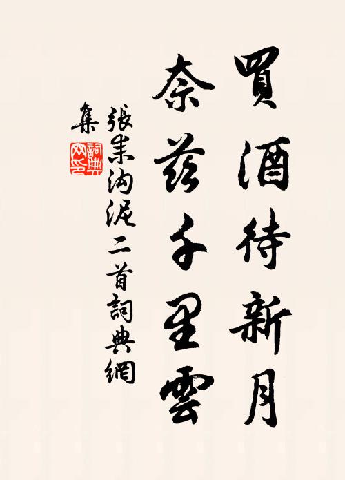古詩文歷史字典書法欣賞書法字典國語詞典說文解字康熙字典古漢語字典買酒待新月,奈茲千里雲張耒 《溝泥二首》名句出處出自宋代張耒的《溝泥二首》全文:溝泥不可步,況復雨清晨。下直休半日,閉門閒晚春。著書聊爾耳,隱市笑徒雲。買酒待新月,奈茲千里雲。張耒詩詞大全名句書法欣賞買酒待新月,奈茲千里雲書法作品張耒名句,溝泥二首名句名句推薦飲盡烏江見水府王哲《啄木兒》幽人得嘉蔭,露坐方獨酌蘇軾《十月十四日以病在告獨酌》山頭紅日生,山下蟻蛙爭車瑾《馬家山》人誰無口耳,寧不起欣慕曾幾《讀呂居仁舊詩有懷其人作詩寄之》獨此冒霜艷,芬郁滿中園梅堯臣《和壽州宋待制九題其五秋香亭》謂汝也幽,而豈其喬洪咨夔《春禽雜言》不必汾水上,秋風看雁群梅堯臣《送劉職方知汾州》彼以偷生,徒奄如鬼靖康小雅《太尉鎮洮軍節度使同知樞密院事種公》光陰已過意未過,齒髮雖頹志未頹邵雍《對花吟》浮生如此了,何必更凌煙!日者悲離索,公今又眇冥范成大《提刑察院王丈輓詞》我徒方嘯歌,弗為改豪習樓鑰《求仲抑招游山歸途遇雨》秋色盡為漁者占,山光多向道人濃葛天民《西湖泛舟入靈隱山》無限閒愁總未知王寂《減字木蘭花》身外百愁俱擲置,放歌沈飲且醺醺司馬光《送張太博知岳州》客中常少睡,歸夢若為成陸游《夢藤驛》詩詞推薦垂絲海棠二首楊萬里〔宋代〕不關殘醉未醒松,不為春愁懶散中。自是新晴生睡思起,來無力對東風。偈頌一百零四首釋紹曇〔宋代〕有一物,全機用。塵勞之儔,如來之種。輕若鴻毛輕,重若丘山重。乳峰信手拈來,點破勞生塵夢。剛被秋蟲落葉九日寄岑參杜甫〔唐代〕出門復入門,兩腳但如舊。所向泥活活,思君令人瘦。沉吟坐西軒,飲食錯昏晝。寸步曲江頭,難為一相就。吁嗟信筆再和二首辛棄疾〔宋代〕此心一似篆菸灰,好向君王早乞骸。何處幽人來問訊,橫擔竹杖過溪來。偶成葉茵〔宋代〕世事如今不可知,相逢茶罷且吟詩。無風古鼎香菸直,未午空庭樹影遲。袖手好看棋勝敗,論心休問酒醇醨。謀居明德皇太后輓歌詞五首楊億〔宋代〕世載河山誓,門無恩澤侯。公桑空趼館,仙藥阻蓬邱。憫冊藏幽壤,哀笳咽素秋。後宮彤管在,千古紀徽猷。小巷舒邦佐〔宋代〕蕭條一徑微,來往覺人稀。忽聽鄰家鬧,歡尋稚子歸。卷書真是懶,添火且相依。強起扶行處,斜陽正滿扉。摘紅英趙汝茪〔宋代〕東風冽。紅梅拆。畫簾幾片飛來雪。銀屏悄。羅裙小。一點相思,滿塘春草。空愁切。何年徹。不歸也合分明說。為僧賦梅庭衛宗武〔宋代〕奇絕生春五出花,僧居著此境尤嘉。一方寒月浸清影,幾度春風生素華。何必江頭千樹暗,未如屋角數枝斜。繙經送別陳秘丞古意釋重顯〔宋代〕悠悠層山雲,斷兮仍復續。離離雙岸草,變兮且兼綠。如何苦雪霜,後凋蠹松竹。松竹有節操,雪霜無伎倆。敢折