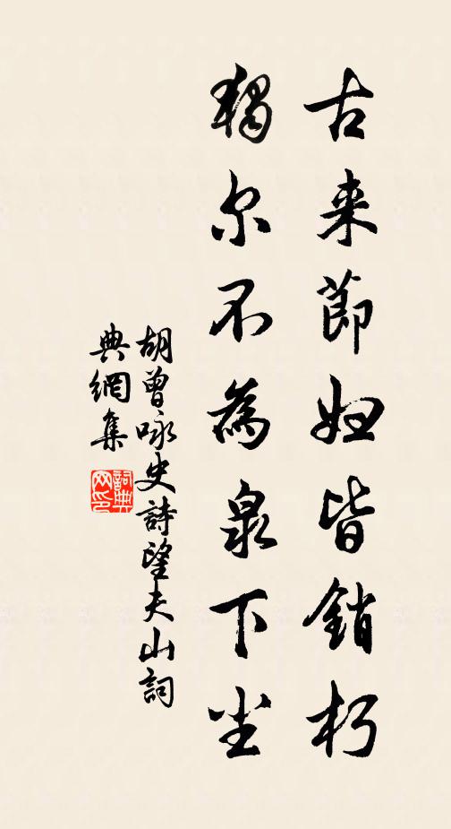 古詩文歷史字典書法欣賞書法字典國語詞典說文解字康熙字典古漢語字典古來節婦皆銷朽,獨爾不為泉下塵胡曾 《詠史詩望夫山》名句出處出自唐代胡曾的《詠史詩望夫山》全文:一上青山便化身,不知何代怨離人。古來節婦皆銷朽,獨爾不為泉下塵。胡曾詩詞大全名句書法欣賞古來節婦皆銷朽,獨爾不為泉下塵書法作品胡曾名句,詠史詩望夫山名句名句推薦台殿曾為貴主家,春風吹盡竹窗紗張籍《玉真觀》元祐明時,中朝司馬,記得邊人,歲問安否李曾伯《醉蓬萊(乙酉壽蜀帥)》相逢共問別來詩,作計君能似我痴趙蕃《在伯考試未歸有懷》帝擢平津策,曾知有用才翁卷《關陳郎中棅知嚴州》暗回微暖入江梅,何處荒榛掛麼鳳曹組《夜歸曲》念我有親頭雪白,雲龍追逐恨無由仇遠《送王仙麓使君赴道州暫歸三山》蒲柳質易朽,麋鹿心難馴白居易《自題寫真 時為翰林學士》料應坐席暖方生,雙赴九天紫泥詔洪咨夔《壽劉丞》日月景遐長姬翼《巫山一段雲》黃河幾度濁復清,此水如今未曾改皎然《兵後西日溪行》山橫杳靄有無中,疊觀層台一梵宮楊時《游光大寺示犀老》夕陽陪醉止,塘上鳥鹹遲嚴維《陪皇甫大夫謁禹廟》魚沉池水碧,鶴去松枝輕邵謁《贈鄭殷處士》門外山川供繪畫,堂前花鳥入吟謳張宜泉《題芹溪居士》厚德坐鎮之,近古翻易治樓鑰《餞李君亮著作守眉山分韻得翠字》詩詞推薦題潮州黃崗驛曹勛〔宋代〕旱作顛風日日吹,冬來渾似麥秋時。土人尚畏生炎瘴,北客聞時淚可知。念奴嬌趙善括〔宋代〕揚輝璧月,照層台縹緲,篷萊雲氣。玉宇清明仙語近,多少怨紅愁翠。問我殷勤,幾年塵土,依舊高標緻。廣寒別讀樂天集戲作五絕蘇轍〔宋代〕樂天種竹自成園,我亦牆陰數百竿。不共伊家斗多少,也能不畏雪霜寒。次韻杜安行見寄六首郭印〔宋代〕蝸居營蓋了,一色草茅新。庭砌才容馬,齋房可授賓。竹軒聊寄傲,蔬圃未全貧。鄰舍逢知己,過從豈厭頻。長安寒食邵謁〔唐代〕春日照九衢,春風媚羅綺。萬騎出都門,擁在香塵里。莫辭吊枯骨,千載長如此。安知今日身,不是昔時鬼。但看送玄泰禪師修睦〔唐代〕去去去何住,一盂兼一瓶。水邊寒草白,島外晚峰青。宿處林聞虎,行時天有星。回期誰可定,浮世重看經。鄱陽恭上人求語釋紹曇〔宋代〕鄱陽風鼓浪千尋,徹底探窮不顧身。塔主連聲呼莫莫,截流機峻恐驚人。虞美人(七夕悼亡)袁去華〔宋代〕娟娟缺月梧桐影。雲度銀潢靜。夜深檐隙下微涼。醒盡酒魂何處、藕花香。鵲橋初會明星上。執手還惆悵。莫嗟相鼓子復臨海縣齋樓鑰〔宋代〕乾道癸已冬,此邦我經行。郁修氣未殄,千家真赤城。來訪臨海令,瓦礫紛縱橫。翹然三尺高,問是戒石銘。徘徊采荔二絕劉克莊〔宋代〕日三百顆沃鑱涎,肘後丹方勿浪傳。晚與放翁爭曠達,荔枝顛向海棠顛。