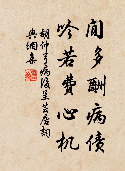 古詩文歷史字典書法欣賞書法字典國語詞典說文解字康熙字典古漢語字典閒多酬病債,吟若費心機胡仲弓 《病後呈芸居》名句出處出自宋代胡仲弓的《病後呈芸居》全文:病骨清於鶴,臨風直欲飛。閒多酬病債,吟若費心機。帶緩腰圍減,囊空藥裹稀。未能全謝客,扶杖掃林扉。名句書法欣賞閒多酬病債,吟若費心機書法作品胡仲弓名句,病後呈芸居名句名句推薦北海開尊,東山乘興,四樂偷閒贏取曹冠《喜遷鶯(上巳游涵碧)》花擁山頭白,雲翻日腳斜李彌遜《游梅坡席上雜酬》想漢影千年,荊江萬頃,槎信長通吳文英《木蘭花慢》邑中神明宰,有意效西門元稹《賽神》回頭嗤李郭,此外更無仙李覯《鑑湖夜泛》十年一見意匆匆,更寫瀟湘別離句袁說友《和董顯叔韻》昨夢騎白鳳,身到玉皇家吳存《水調歌頭 北上道別周明翁,遇雪》只道蜻蜓解餐水,元來照水不曾餐楊萬里《嘲蜻蜓》古榕蔽天罅,一瀑穿峽懸趙與檳《白鶴岩》懷我金石交,每瞻鴻雁行趙蕃《寄懷章衢州辛越州》曾聞飛將上,落日吊開平吳偉業《采石磯》秋後淒涼歸路遠,速躋攀侯善淵《辭百師》顧子百短拙,飽腹戇胮肛黃庭堅《送彥孚主簿》風勁初下葉,雲寒方護霜權德輿《送渾鄧州》盡日沖塵沙,解裘振裳裾張耒《宿合溜驛》詩詞推薦晚涼湖邊放步陳鑒之〔宋代〕暑氣湖山薄,晚風巾袂涼。蟬鳴便柳蔭,鷺立領荷香。大舸鼓聲遠,小軒茶味長。獨游元更好,細細踏斜陽。和梅溪歲晚所寄張埴〔宋代〕客里無魚未易禁,春風頗憶洞庭針。可能更問詼諧肉,發已如今不及心。贈醫博士范心齋舒岳祥〔宋代〕疾病之所生,風寒燥濕毒。浸淫侵臓腑,脈絡起絲粟。有藥所不攻,鍼砭功始錄。有如龍潛見,岩穴通隱伏。又如答原父歐陽修〔宋代〕炎歊郁然蒸,午景熾方焰。子來清風興,蕭蕭吹幾簟。又如沃瓊漿,遽飲不知厭。嗟予學苦晚,白首困鉛槧。危疑交翠亭方來〔宋代〕簾溪窗外草茸茸,生意春融我意同。為甚此園多翠草,也因曾識紫陽翁。臨江仙山主〔元代〕冷淡更闌交二鼓,蛩吟聲亂忙忙。紛紛黃葉落階場。萬林失色,雨露變銀霜。追念前秦並漢魏,英雄文武金璋。限春感釋文珦〔宋代〕一年春色已摧殘,水滿陂塘草樹寒。轉覺歸愁消不得,杜鵑聲里淚闌乾。西江月(十二之五)張伯端〔宋代〕二八誰家奼女,九三何處郎君。自稱木液與金精。遇土卻成三性。更假丁公煅煉,夫妻始結歡情。河車不敢暫留停見佳人負錢出路鄭世翼〔唐代〕獨負千金價,應從買笑來。只持難發口,經為幾人開。頌古十七首釋師觀〔宋代〕乾坤獨立,從者里入。風吹不著,雨打不濕。