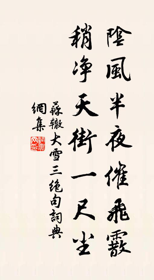 古詩文歷史字典書法欣賞書法字典國語詞典說文解字康熙字典古漢語字典陰風半夜催飛霰,稍淨天街一尺塵蘇轍 《大雪三絕句》名句出處出自宋代蘇轍的《大雪三絕句》全文:閏歲窮冬已是春,當寒卻暖未宜人。陰風半夜催飛霰,稍淨天街一尺塵。蘇轍詩詞大全名句書法欣賞陰風半夜催飛霰,稍淨天街一尺塵書法作品蘇轍名句,大雪三絕句名句名句推薦翰飛矯未極何遜《哭吳興柳惲詩》我與丹青兩幻身,世間流轉會成塵王安石《傳神自贊》小試經綸安鼎鼐,更恢韜略靖華戎李洪《陳丞相誕日》曉雲連幕卷,夜火雜星回宋之問《扈從登封途中作》立心不北向,特為三顧起衛宗武《孔明》興亡慨嘆終何益,愚知俱為百年客張鎡《宿吳江縣》採珠櫻在盤,剝玉筍登俎韓維《同晏著和飲薛園坐中賦》一澗潺潺瀉煙樹,流到溪莊平不度利登《董叔宏為予道溪莊勝趣賦古調》後夜再三撈摝得,碧天雲靜一輪高釋惟一《暫到》自憐三十未西遊,傍水尋山過卻秋崔道融《秋夕》欣喜前塵影,因緣文字多 * 《送蓬仙兄返里有感》聞道源中添一脈,莫交輕觸水精盤曹勛《沖嗇有新泉》欲去更徘徊,夕陽射峰頂朱渙《入山二首》暖寒誰掃徑,莫負紫金蕉葛立方《冬至後雪》慈福修齡八十春,微陽才動寶書新任希夷《德壽宮即事六首》詩詞推薦蘇幕遮 訓徒眾王哲〔元代〕弟兄懣,事下手。與世相逢,日日長鈐口。休論汞鉛並卯酉。開闡絳宮,自在逍遙走。二儀真,三耀秀。我欲親傳訪趙紫芝徐照〔宋代〕意欲尋君忘路遠,入城還又出城來。菊明紫色天霜下,魚沒圓痕水垢開。新背石碑藏素篋,凍研山硯滴香醅。竹林端午內中帖子詞皇帝閣王珪〔唐代〕禁幕無風日正亭,侍臣初賜玉盤冰。不知翠輦游何處,應在瑤台第一層。杏園即事王安石〔宋代〕蟠桃移種杏園初,紅抹燕脂嫩臉蘇。聞道飄零落人世,清香得似舊時無。系裙腰魏夫人〔宋代〕燈花耿耿漏遲遲。人別後、夜涼時。西風瀟灑夢初回。誰念我,就單枕,皺雙眉。錦屏繡幌與秋期。腸欲斷、淚偷太上皇帝靈駕發引輓歌詞六首范成大〔宋代〕紹運鍾陽九,興王撫半千。斷鰲媧立極,翔鳳漢中天。宵旰三星紀,希夷十閏年。聲容彌宇宙,浯石不勝鐫。送溫處士歸黃山白鵝峰舊居李白〔唐代〕黃山四千仞,三十二蓮峰。丹崖夾石柱,菡萏金芙蓉。伊昔升絕頂,下窺天目松。仙人煉玉處,羽化留餘蹤。亦聞友人惠酒殊佳用清光滑辣四字為韻以謝馮時行〔宋代〕冠豸取能觸,佩劍取能割。飲酒移氣體,我亦嗜清辣。舉白欲下咽,丹腑已通達。溫溫坎離間,正氣自旋斡。於焉筠溪王奉御寄詩次韻呈崖松盧奉御汪元量〔宋代〕新詩蒙遠寄,客路不勝秋。同谷歌臣甫,新豐醉客周。君今嫌作史,我已厭封侯。何日西湖曲,紅船上下游。漫尉黃庭堅〔宋代〕豫章黃魯直,既拙又狂痴。往在江湖南,漁樵乃其師。腰斧入白雲,揮車棹清溪。虎豹不亂行,鷗鳥相與嬉。遇人