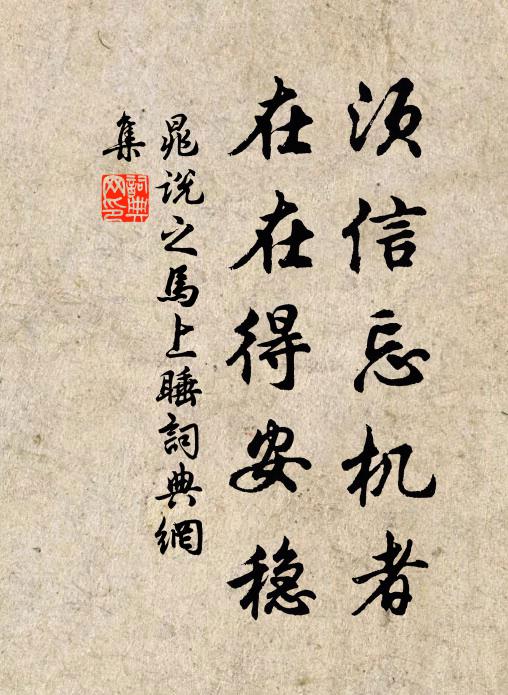 古詩文歷史字典書法欣賞書法字典國語詞典說文解字康熙字典古漢語字典須信忘機者,在在得安穩晁說之 《馬上睡》名句出處出自宋代晁說之的《馬上睡》全文:前驛得駑馬,據鞍可天隱。青山隨我行,夢寐亦清省。此樂世所無,蝶化猶未甚。須信忘機者,在在得安穩。晁說之詩詞大全名句書法欣賞須信忘機者,在在得安穩書法作品晁說之名句,馬上睡名句名句推薦寶賢不遺俊,台閣盡鵷鸞蘇頲《奉和聖制漕橋東送新除岳牧》故交今不見,流恨滿川光薛逢《雜曲歌辭何滿子》酒腸如海壽如山管鑒《浣溪沙(壽程將)》以智泉寧竭,其徐海自清宋璟璟《奉和聖制送張說巡邊》諠嘩燈火看如夢,關鎖官曹只寄聲蔡肇《和慎思初入試院》可堪客里送行人,家山空老春薺丘崈《西河(餞錢漕仲耕移知婺州奏事,用幼安韻)》此去誰家借蹇驢,偪仄終看飯山瘦毛滂《隋堤寫懷寄上右丞》橫笛能令孤客愁,淥波淡淡如不流劉長卿《聽笛歌留別鄭協律》不知兩掖客,何似扁舟人?尚想到郡日,且稱守土臣白居易《初下漢江,舟中作,寄兩省給舍》此去雋游縈客夢,夢陪笙鶴下瓊田陳造《楊侍郎召飯再用韻》汀洲相見春風起,白蘋吹花散煙水蘇軾《清遠舟中寄耘老》不得重陽節,虛將滿把看崔櫓《村路菊花》養蒙分四瀆,習坎奠三荊駱賓王《早發淮口望盱眙》飽食無功媿汗青,燈前顧影嘆伶俜陸游《飽食》隻影獨看西日落,滿城爭喜北人來丘葵《聞吳丞圖漳粹》詩詞推薦十月一日陪使君領客之湖莊曹彥約〔宋代〕鸛鳴雙櫓壓中流,斷送餘分不盡秋。石罅有聲轟壯語,風驕無計尼真游。江神自合供如願,艇子尤能送莫愁。卻笑行吟二首梅堯臣〔宋代〕寘蟻橘林下,正在結實時。附緣與出入,安可責於斯。養大不問細,使遠不問遲。遠遲必有報,細大必有期。休哉次韻衡山徐監酒同考府學試八首項安世〔宋代〕少時亹亹著新功,老來蕭蕭漸禿翁。辜負平生好師友,納湖雲谷兩仁翁。章安鎮感事孫應時〔宋代〕越嶠東南窮,連山赴滄海。章安古州宅,陵谷諒遷改。前江渺萬頃,風雨魚龍匯。嗟哉地遠絕,仿佛形勢在。憶昨南園陸游〔宋代〕曉鶯催系柳邊舟,老陌東風拂面柔。客里又驚春事晚,夢中重續栝蒼游。歡情飲量年年減,古寺名園處處留。卻羨巢居閣楊蟠〔宋代〕昔日巢居客,今為天上仙。文章流海內,几杖葬山前。如夢令 贈縣令王哲〔元代〕日日此中開宴。食肉諸公總善。唯有害風王,莫怪頻來見面。知縣。知縣。正好與人方便。送趙叔自吏部知福州四首趙蕃〔宋代〕公雖去朝廷,秘殿通班在。不應獻納忠,於爾分內外。而況我此州,甘棠存蔽芾。旱疫苦相仍,要當蒙大賚。晚春二首宋伯仁〔宋代〕風甃殘花滿地紅,別離樽俎謾匆匆。春光未肯收心去,卻在荼蘼細影中。哭川無竭禪師二首方回〔宋代〕幾登瀟灑閣,共坐聽松風。異骨癯僧健,多魔老守窮。是身終有死,何物不成空。豈料龍鍾老,題詩先哭公。