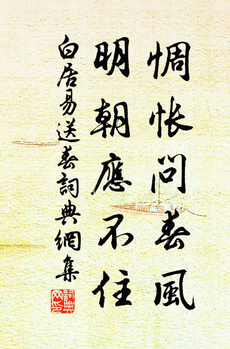 古詩文歷史字典書法欣賞書法字典國語詞典說文解字康熙字典古漢語字典惆悵問春風,明朝應不住白居易 《送春》名句出處出自唐代白居易的《送春》全文:三月三十日,春歸日復暮。惆悵問春風,明朝應不住。送春曲江上,眷眷東西顧。但見撲水花,紛紛不知數。人生似行客,兩足無停步。日日進前程,前程幾多路。兵刀與水火,盡可違之去。唯有老到來,人間無避處。感時良為已,獨倚池南樹。今日送春心,心如別親故。名句書法欣賞惆悵問春風,明朝應不住書法作品白居易名句,送春名句名句推薦方來屬追往,十載事不同韋應物《贈馮著》諸侯師不得,樵客偶相隨李鹹用《送趙舒處士歸廬山》拜賜匆匆早上朝,公卿前列盡金貂孔武仲《初賜幡勝戲和諸公二首》已覺一為甚,更堪三後行項安世《次韻胡撫乾雪詩每句寓再字仍用汝陰詩禁》疇昔飢腸知脫粟,即今老眼見翔龍吳則禮《性之以團茶贈行並遺新詩因次其韻》慷慨中流,闌乾拍遍,離合悲歡一古今魏初《沁園春 次張可與郎中韻,可與郎中與晉卿德》摩挲石刻空三嘆,吏部文章絕古今蔡戡《滕王閣》洞天深處,霞友雲朋,談冰咀雪相陪姬翼《春從天上來》古柳深呂磬,長廊盡處燈朱繼芳《昭慶寺》芰荷諒難雜,反此生高原柳宗元《湘岸移木芙蓉植龍興精舍》忽遭喚起披金甲,自笑平生論石渠項安世《次韻》一尊情話向南榮,好雨知時盆樣傾虞儔《和七月初五日夜得雨》但憂久聱牙,尚喜無蔕芥晁補之《游信州南岩》禁林莫訝歸來晚,待我豐年酒一行釋寶曇《上明州高守喜雨》襦褲提於手,韋弦佩在紳白居易《自到郡齋僅經旬日方專公務未及宴遊偷閒…仍呈吳中諸客》詩詞推薦雙桱李洪〔宋代〕古杉翠桱幾千章,勢壓穹岩九暑涼。匠石它年選隆棟,萬牛回首立明堂。侯灘蘇軾〔宋代〕江邊皎皎過侯灘,更上山腰看打盤。百歲老兒親擊鼓,城中憂患不相干。偈頌十二首釋道璨〔宋代〕土木場中輥一回,平生已眼豁然開。廣寒宮殿無關鑰,撞破髑髏歸去來。洛下夜會寄賈島姚合〔唐代〕洛下攻詩客,相逢只是吟。夜觴歡稍靜,寒屋坐多深。烏府偶為吏,滄江長在心。憶君難就寢,燭滅復星沉。仰山行趙汝鐩〔宋代〕平生幾兩謝公屐,愛山愛水真成癖。集雲峰在指顧間,年來抗塵乃絕跡。西風從臾作意登,佛境未入心境清。九秋再次韻陳棣〔宋代〕擾擾膠膠度風年,只應今夕暫休閒。又聞玉燭更新籥,那得金丹駐舊顏。是處碧煙聞爆竹,誰家紅玉擁頹玉。揮毫午窗王同祖〔宋代〕破千幽禽驚客夢,隔窗疏雨喚離愁。浮雲行喪知何益,早悟莊周蝶夢休。偈六十九首釋道寧〔宋代〕先賢垂範早涉離,微言無展事句里。藏機百千諸佛知,黃鶴樓前握手歸。夏雨落綿綿,民歌堯舜天。千山增翠色,蒙賜酒詩庾信〔南北朝〕金膏下帝台。玉曆在蓬萊。仙人一遇飲。分得兩三杯。忽聞桑葉落。正值菊花開。阮籍披衣進。王戎含笑來。從今玉虛宮隱真堂趙瑞〔宋代〕劉公到處留遺蹟,奇絕惟茲獨擅名。禪石無塵床穩臥,神丹有驗井還清。岡巒四合如環繞,石筍孤高類削成。瑤草