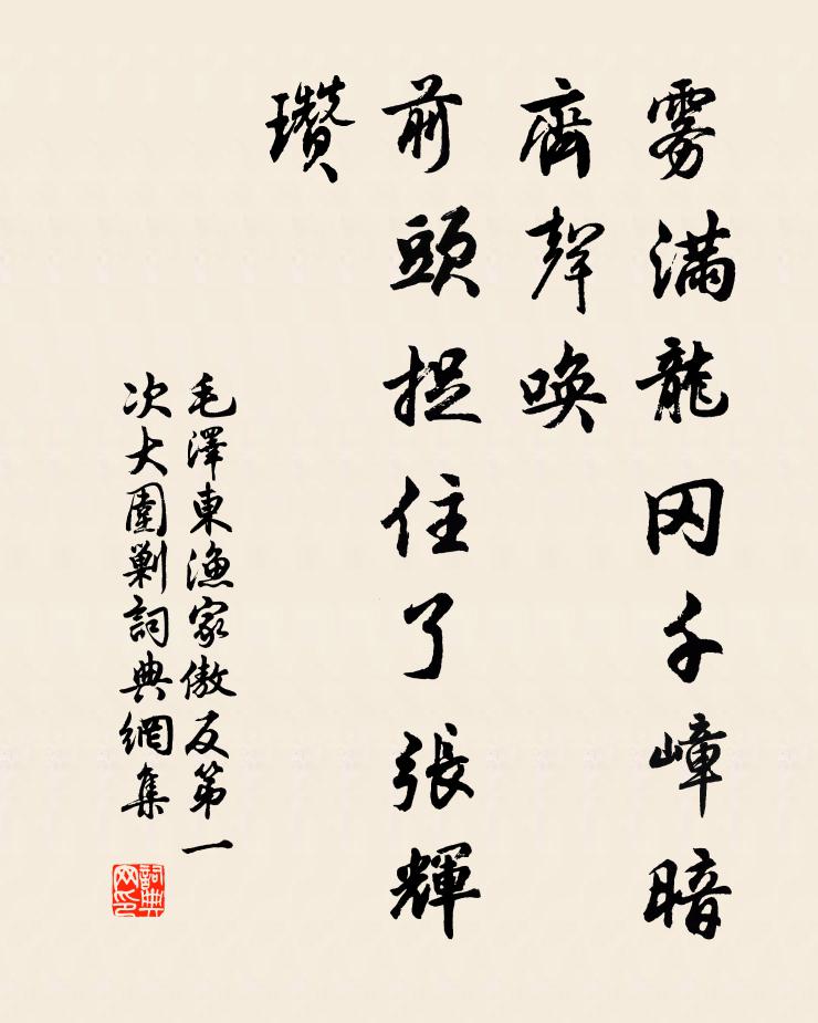 古詩文歷史字典書法欣賞國語詞典查字典說文解字康熙字典古漢語字典霧滿龍岡千嶂暗,齊聲喚,前頭捉住了張輝瓚毛.澤.東 《漁家傲反第一次大“圍剿”》名句出處出自近現代毛澤*東的《漁家傲反第一次大“圍剿”》全文:萬木霜天紅爛漫,天兵怒氣沖霄漢。霧滿龍岡千嶂暗,齊聲喚,前頭捉住了張輝瓚。二十萬軍重入贛,風煙滾滾來天半。喚起工農千百萬,同心乾,不周山下紅旗亂。名句書法欣賞霧滿龍岡千嶂暗,齊聲喚,前頭捉住了張輝瓚書法作品名句,漁家傲反第一次大“圍剿”名句名句推薦吟隨野竹吾懷愜,醉啜溪泉此意堪彭汝礪《嘗約誼父同游龍泉奔走失期故作是詩奉和元韻》我初勇一往,役世難安恬王安石《和平甫舟中望九華山二首》多少念佛人,覓佛在言語乾隆《題趙文敏中峰懷淨土詩畫卷》山林投老更疏慵,尚有躋攀興不窮李彭《游雲居三首·其一》常虞涉世傷坦率,見語躬行合謹細胡寅《送餘澤還義興》宦途尤巧險,匠手莫言工強至《羽師院假山》於游辭老或猶當,敕政依然勵自強乾隆《寄題雲罩寺·其二》片時延玉漏,細點灑金鋪乾隆《微雨(四月初三日)》或可足餅餌,稍以濟窘貧乾隆《河南巡撫鄭大進奏報得雨詩以志慰》十五日以前,常在途中,不離家舍釋師範《偈頌七十六首》始搖盪以入閨沈約《八詠詩 會圃臨春風》仍懷陸氏橘,歸獻老親嘗岑參《送許員外江外置常平倉》百草頭上無邊春,信手拈來用得親釋正覺《頌古一百則》今朝未陟高峰頂,興寄白雲阿那端乾隆《夜》爾時玉局停橈處,我亦無端一艤舟乾隆《再題錢維城蘇軾艤舟亭圖·其三》詩詞推薦趙提荊輓詞樓鑰〔宋代〕毓秀從天派,盱衡動至尊。使星方炳耀,卿月遽侵昏。已矣悲吳館,誰歟護北門。慶源流未艾,文獻藹諸孫。雨中賞薔薇顧逢〔宋代〕春風庭院少遲留,爛熳紅英帶雨羞。最是花邊情緒惡,看花狼藉為花愁。和曾谹父春半書懷王洋〔宋代〕敲火開香焙,書齋思漸清。田翁新社長,巢燕舊門生。學僻詩無味,心開語見情。不愁無樂事,正與物俱榮。依韻和王微之學士陸佃〔宋代〕坐籌國事尚才堪,屈指同年祇二三。平昔醉鄉營別業,如今仙籍換頭銜。光陰老去猶能惜,世事閒來不更談。聞說再使蜀道張說〔唐代〕眇眇葭萌道,蒼蒼褒斜谷。煙壑爭晦深,雲山共重複。古來風塵子,同眩望鄉目。芸閣有儒生,軺車倦馳逐。青春次韻陳季鄰戶部旦過庵范成大〔宋代〕宦遊觸處似懸匏,北嶽南山想獻嘲。拍手百年休鑄鐵,蓋頭一把暫誅茅。玉京歲晚梧桐落,水國霜清橘柚包。飛錫漢宮春譚處端〔元代〕自慕貧閒,便摧強挫銳,柔弱和光。塵緣頓舍,慧燭朗*靈房。七門返照,用七寶、密密鋪妝。擒猿馬,邪生智巧和枯崖山行韻胡仲弓〔宋代〕名山僧占盡,甘作老慮能。虎豹何堪捋,虬龍尚可登。吟隨雙蠟屐,醉倚萬年藤。興盡未歸去,斜陽上塔層。何恭敏料理帖贊岳珂〔宋代〕虐焰熏天,而公以勺水欲救其燎原。觀公之帖,雖久別之一見,亦將以歸之時數之自然。胸中所處者素定,宜其敢雨花室雜詠·其一乾隆〔清代〕石磴攀蘿步入深,精廬瀟灑晝沉沉。不因詰曲徑千轉,那識高閒一晌心。
