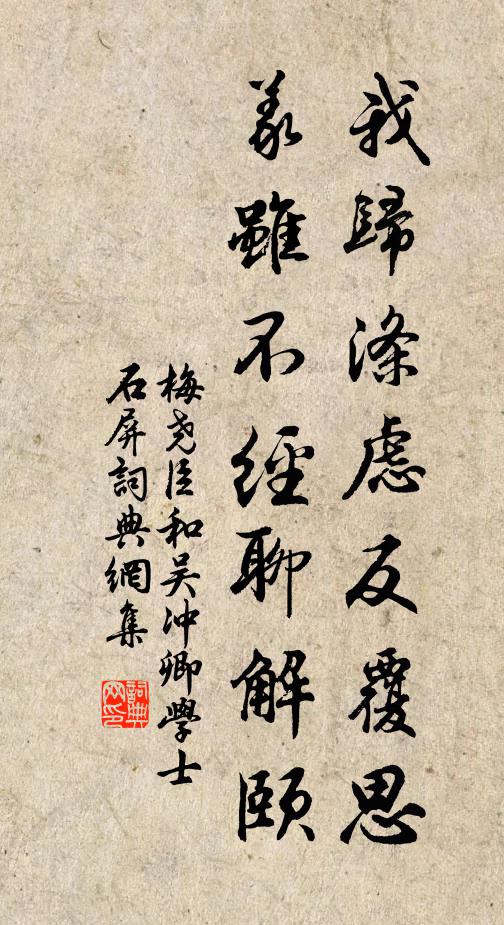 古詩文歷史字典書法欣賞書法字典國語詞典說文解字康熙字典古漢語字典我歸滌慮反覆思,義雖不經聊解頤梅堯臣 《和吳沖卿學士石屏》名句出處出自宋代梅堯臣的《和吳沖卿學士石屏》全文:吳夫,佩銀龜。乘天馬,索怪奇。忽得虢略一片石,其中白色圓如規。又有樹與烏,畫手雖妙何能為。吳乃持問歐陽公,比公曩獲尤可疑。疑不為辨賦以詩,詩辭粲粲明星垂。復遣齎來使我和,坐上鉅公傍睨之。范侯實有楊雄學,鹹雲此理難究推。我歸滌慮反覆思,義雖不經聊解頤。月與太陽合朔時,陽烏飛上桂樹枝。枝上作窠生群兒,人不知天公。天公欲俾世間見,影著石面如黏黐。烏既不得去,月亦不可移。留為千古作好玩,慎勿傾仆同玉碑。名句書法欣賞我歸滌慮反覆思,義雖不經聊解頤書法作品梅堯臣名句,和吳沖卿學士石屏名句名句推薦似許詢支遁,總皆清絕謝應芳《滿江紅 送馬公振》鳳歸慨處士,鹿化聞仙公宋之問《宿雲門寺》人煙遍餘田,時稼無閒坡歐陽詹《益昌行》無煩惡蠅點,須擬效龍韜蘇頌《景德寺飲會丘思同作述懷詩兼紀一席之事見約》亂半川殘照袁去華《垂絲釣》真能深造否,孰謂晚成遲方回《次韻謝夏自然見寄四首》俊游巷陌,算空有、古木斜暉姜夔《江梅引·丙辰之冬予留梁溪將詣淮而不得因夢思以述志》閭閻耆舊盡,能復典刑存劉宰《挽雷處士》嚴君將命之邛蜀,令子和家且侍行林逋《送楚執中隨侍入蜀》油壁車中同載女,菱花鑒里並妝人穆修《合歡芍藥》直松曲棘都休道,庭下山茶為甚紅阮閱《郴江百詠並序乾明寺》俗尚儒餐貴,家貧父業荒蘇泂《感秋》牙齒唇皮包不過,吾家密事俗人知釋如珙《頌古四十五首》小兆佩神虎,每來清夜中文同《蒲氏別墅十詠朝真堂》關心太昊祠前路,小甲連畦帶雪晴張耒《春蔬》詩詞推薦答二任五言二十韻蘇洵〔宋代〕魯人賤夫子,呼丘指東家。當時雖未遇,弟子已如麻。奈何鄉閭人,曾不為嘆嗟。區區吳越間,問骨不憚遐。習見登潛山觀竇參〔唐代〕山勢欲相抱,一條微徑盤。攀蘿歇復行,始得凌仙壇。聞道葛夫子,此中煉還丹。丹成五色光,服之生羽翰。靈草田舍偶憶菖蒲舒岳祥〔宋代〕山窗偶閒靜,無事憶菖蒲。怪石磨劍脊,西風拂虎鬚。性貞偏愛潔,節勁固應癯。何日新書室,清泉手自{奭右斗餘干旅舍劉長卿〔唐代〕搖落暮天迥,青楓霜葉稀。孤城向水閉,獨鳥背人飛。渡口月初上,鄰家漁未歸。鄉心正欲絕,何處搗寒衣。同字子順訪茅庵道人鳳凰麒麟不可見道人語也戴復古〔宋代〕道者日高臥,清風隔世塵。鳳麟不可見,猿鳥自相親。山木輪囷古,茶花冷淡春。草荒門外路,常怕有人來。次韻金漢臣喜晴方回〔宋代〕雨足秧疇始放晴,鄉鄰所至有歡聲。宰公明察無冤獄,太守辛勤自勸耕。我昔黃童成白首,誰今赤子視蒼生。定知將之京師雜別(六首選—)黃景仁〔清代〕翩與歸鴻共北征,登山臨水黯愁生。江南草長鶯飛日,遊子離邦去里情。五夜壯心悲伏櫪,百年左計負躬耕。自嫌溫陵吳氏瓠齋余謙一〔宋代〕提壺足供杯勺,吹匏可入弦歌。一瓢濩落無用,無奈夫君拙何。宋頌九首明道石介〔宋代〕政在房帷,小人乘時。十年於茲,帷幾帷微。聖人如天,不識不知,龍晦其威,神藏其為。東園詩寄興化吳從道陳造〔宋代〕溪流抱玦圍亭里,三面欄乾壓清泚。養花種竹今幾年,紅紅綠綠皆風煙。黑頭主人富文墨,隙地營園喜留客。去年