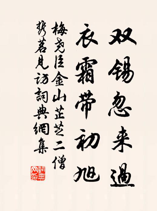 古詩文歷史字典書法欣賞書法字典國語詞典說文解字康熙字典古漢語字典雙錫忽來過,衣霜帶初旭梅堯臣 《金山芷芝二僧攜茗見訪》名句出處出自宋代梅堯臣的《金山芷芝二僧攜茗見訪》全文:一游江山上,日日吟不足。雙錫忽來過,衣霜帶初旭。況能持茗具,向此烹新綠。中{左氵右霝}水若飴,北焙花如粟。還將塵慮滌,自愧冠纓束。何以報勤勤,馳奴扣雲谷。名句書法欣賞雙錫忽來過,衣霜帶初旭書法作品梅堯臣名句,金山芷芝二僧攜茗見訪名句名句推薦郡齋政成罇俎樂,高談日接無俗情歐陽修《送京西提點刑獄張駕部》平明攬清鏡,鬢髮應成蒼趙蕃《枕上有感二首》我老念病役,生病為形贅曹勛《山居雜詩九十首》過苑中官排辨時,江梅初綻兩三枝張公庠《宮詞》欲寫情懷難一一,擬尋山水隔千千魏野《和江南提刑王國博見寄》奸名犯具分,論罪不在大陳造《次韻余司理》曲中歷歷分明道,苦怨王孫負春草黃順之《聽悟師彈招隱》晴日千竿籟,春風萬鼓鼙舒岳祥《安住寺松聲》昨夜靈敏聲霜外,元來不比在家聽王大受《客枕》窗臥憶元亮,方詩成懷景升李廌《廌寓龍興仁王佛舍德麟公定道輔仲寶攜酒希納》寄言靈河守,高此別乘懷梅堯臣《送王岩夫秘校通判滑州》海日生殘夜,江春入舊年。王灣《次北固山下》且料理琴書,夷猶今古張炎《真珠簾(近雅軒即事)》清景早朝吟麗思,題詩應費益州箋姚合《寄主客劉郎中》出繭修眉淡薄妝,丁東環佩立西廂陸游《無題》詩詞推薦洞宮秋夕陸龜蒙〔唐代〕濃霜打葉落地聲,南溪石泉細泠泠。洞宮寂寞人不去,坐見月生雲母屏。酬政老見贈王洋〔宋代〕君於取予無乃廉,筆端自許能摧堅。摧堅不是老僧事,賈用不售將誰還。卻收神觀反初視,先種熟耨終有年。早知登瀛州南城樓寄遠沈佺期〔唐代〕層城起麗譙,憑覽出重霄。茲地多形勝,中天宛寂寥。四榮摩鸛鶴,百拱厲風飆。北際燕王館,東連秦帝橋。晴光聞再幸梁洋韋莊〔唐代〕才喜中原息戰鼙,又聞天子幸巴西。延燒魏闕非關燕,大狩陳倉不為雞。興慶玉龍寒自躍,昭陵石馬夜空嘶。遙思新秋陸游〔宋代〕打窗落葉報秋期,病叟頹然兩鬢絲。縱酒已無年少夢,讀書仍負夜涼時。問囚損氣嗟誰念?學道刳心恐已遲。買鶴代譚與可謝石大夫鄉飲酒劉宰〔宋代〕大夫舉酒屬青衿,八十衰翁亦許臨。要向席間明厚意,敢辭酒半效狂吟。持身勿使虧名義,學古還須探聖心。元日寄左軍巡劉判官歐陽修〔宋代〕遙聽洛城鍾,獨渡伊川水。綠樹郁參差,行人去無已。因高望京邑,驅馬沿山趾。落日亂峰多,龍門何處是。過應浩然先生墓戴表元〔宋代〕人間萬卷龐眉老,眼見堂堂入草萊。行客須當下馬過,故交誰復裹雞來。山花不語如聽講,溪水無情自薦哀。猶勝送客游蜀張籍〔唐代〕行盡青山到益州,錦城樓下二江流。杜家曾向此中住,為到浣花溪水頭。頔上人持瑩蘿月五詩見示因走筆和韻聊禦睡魔鄭清之〔宋代〕蘿月禪機莫強猜,如來無去亦無來。霜凝寒綠歸松鬢,春染輕紅入杏腮。
