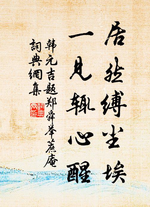 古詩文歷史字典書法欣賞書法字典國語詞典說文解字康熙字典古漢語字典居然縛塵埃,一見輒心醒韓元吉 《題鄭舜舉蔗庵》名句出處出自宋代韓元吉的《題鄭舜舉蔗庵》全文:吾州富佳山,修竹連峻岭。居然縛塵埃,一見輒心醒。豈知刺史宅,跬步閟清景。古木盤城隅,石徑幽且迥。當年徐常待,坐愛雲水冷。溪南群峰秀,矗矗錐出穎。鄭公閉閣暇,獨步毘廬頂。曰此氣象殊,逍遙步方永。喚客倒清樽,燃薰煮奇茗。庭空無一事,賓吏絕乾請。佳處由漸入,斯語煩記省。淵明嘗有語,結廬向人境。恍如白蓮社,揮塵對宗炳。誰雲忙裡閒,要識動中靜。我來款妙論,散策步林影。心田豁叢茅,氣馬罷征騁。他時記棠陰,老意亦深肯。名句書法欣賞居然縛塵埃,一見輒心醒書法作品韓元吉名句,題鄭舜舉蔗庵名句名句推薦漢廷當自召,湘水但空流劉長卿《送李使君貶連州》風騷誰是主,天地太無情韓維《過杜甫墳》地盡炎荒瘴海頭,聖朝今又放驩兜裴夷直《崇山郡》記取環峰亭下,問元戎戰艦,巧運機籌袁士元《八聲甘州 餞帥閫張仲淵外郎 先福建帥府》氣不來、身臥荒郊劉處玄《上平西》人事無涯生有涯,逝將歸釣漢江槎蘇軾《次韻陳海州乘槎亭》待月西樓上,平秋氣象分吳中復《中秋待月終夕陰晦偶書》我帶舊盈骼,忽複數孔寬高斯得《次韻王深道見寄》去合茅檐樹,雨添花澗泉周權《野趣》屏障重重翠幕遮石孝友《鷓鴣天》功高后毀易,德薄人存難王安石《寓言九首》莊南縱步游荒野,獨鳥寒煙輕惹惹韓偓《閒步》寒風易水已成悲,亡國何人見黍離楊億《淚二首》踟躕在親神女江淹《雜體詩 李都尉陵從軍》檢點將來,呼為切腳釋道寧《偈六十九首》詩詞推薦秋江打魚李泳〔宋代〕鳴榔四合波圍蹙,掛網雪鱗穿翠束。驚起沙頭白雁群,斜行書破秋天綠。又和南塘十首劉克莊〔宋代〕雨戀池三尺,晴窺月一方。未□□□□,敢望若並洋。□怪曾驚耳,仝嗔欲刃腸。誰能□□□,老子欲追涼。提刑使者還嘉州宋祁〔宋代〕使者艤行舟,是行及淒序。祖帳俯平沙,從騎羅前渚。一進酒惟醴,再進魴及鱮。還客已少悰,況將暌宴語。勁風漫興九首方回〔宋代〕索文僧送紙,賭酒客爭棋。定要全無事,何由更有詩。莊居趙汝鐩〔宋代〕三四間茅屋,迴環水石清。雞催殘漏盡,月截半窗明。好句枕邊得,浮名身外輕。起來供日課,先繞藥畦行。送董邵南遊河北序韓愈〔唐代〕燕趙古稱多感慨悲歌之士。董生舉進士,屢不得志於有司,懷抱利器,鬱郁適茲土。吾知其必有合也。董生勉乎哉寒食贈遊客張耒〔宋代〕陰陰畫暮映雕欄,一縷微香寶篆殘。寒食園林三月近,落花風雨五更寒。箏調寶柱弦初穩,酒滿金壺飲未乾。明日酹江月(南康軍和蘇韻)文天祥〔宋代〕廬山依舊,淒涼處、無限江南風物。空翠晴嵐浮汗漫,還障天東半壁。雁過孤峰,猿歸危嶂,風急波翻雪。乾坤未偈頌三十首釋慧暉〔宋代〕青山山上,白云云下。戶外水寒,波心船點。漁家傲(詠月)黃裳〔宋代〕通一月而泛詠,已侑金卮;辨四時而各言,未勞檀板。晦朔乃取於盈闕,寒暑蓋資其往來。群動息而忙者閒,觀光