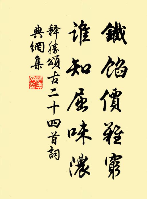 古詩文歷史字典書法欣賞國語詞典查字典說文解字康熙字典古漢語字典鐵餡價難窮,誰知屈味濃釋勝 《頌古二十四首》名句出處出自宋代釋勝的《頌古二十四首》全文:鐵餡價難窮,誰知屈味濃。法幢光祖域,正董在胸中。釋勝詩詞大全名句書法欣賞鐵餡價難窮,誰知屈味濃書法作品釋勝名句,頌古二十四首名句名句推薦秋風起兮木葉飛,吳江水兮鱸正肥。張翰《思吳江歌》放歌能取醉,不必喚嘉榮曾惇《棲霞會飲諸僚》如飛似墮皆青壁,畫手不強元化強曹松《桂江》石磴盤秋上翠微,山腰雲氣濕人衣張仲深《龍泉寺(寺乃荊公王安石讀書之地)》仆方棲會稽,蹇足未得騁羅公升《觀棋》冪詈野煙起,蒼茫嵐氣昏豆盧回《登樂遊原懷古》居然對我說無我,寂歷山深將夜深嚴維《宿天竺寺》世法寧容此,伊人詎識君李之世《挽陳憲副·其二》應是飛瓊弄玉,天不管、年年謫向人間權無染《鳳凰台憶 * /鳳凰台上憶 * 》千屯沙上暗,萬騎月中嘶王國維《臨江仙》吾聞彼上人,不惰不精進釋德洪《饒德操營中客世與淵才友善有詩送之予偶讀想見其為人時聞已薙髮出家矣因次其韻》此時能痛飲,努力詠餘霞宋祁《送范希文》柳影依窗過,荷香拂枕浮李新《湖上招故人》譬如坎井蛙,拘虛徒窘束郭印《新開小軒晁子西有詩以韻答之二首》未得同歸去,空令相見疏姚合《送朱慶餘及第後歸越》詩詞推薦五君詠題錢選畫即效顏延年體竹林之遊名艷典午延之著詠黜山王而標以五君其三·劉伶乾隆〔清代〕沛國更不羈,陶陶忘所以。鹿車散漫遊,寤寐視生死。心醒身任醉,器度誰能揣。不聽婦兒言,粗論含至理。落花(六首)·愛看繁枝不忍刪梁氏〔明代〕愛看繁枝不忍刪,欲留香魄杳無還。粘泥撲幕俱堪惜,簡點殘英亂曉鬟。於郊台迎勞將軍阿桂凱旋將士等成凱歌十首·其十乾隆〔清代〕凱歌亦豈易為聞,五歲辛勤勞眾軍。我實未曾安五夜,幾多憂慮與平分。自開歲陰雨連日未止陸游〔宋代〕江雲漠漠雨昏昏,歸老山陰學灌園。十里羊腸僅通路,三家鐺腳自成村。應時餺飥聊從俗,耐久鍾馗儼在門。近縣偈頌二十九首·其十七釋清了〔宋代〕雨洗摩尼增秀色,全身不昧一絲頭。靈源傾瀉無閒歇,添得滁山水逆流。清舒山館題壁乾隆〔清代〕徑步煙蕪綠染鞋,芸窗小憩愛清佳。數聲仙樂泉淙澗,大塊文章花綴厓。琴在壁間渾太古,鹿來窗外識無懷。秋蟲荅梅淵公贈畫兼寄唐祖命二首·其一王士禎〔清代〕鳥哢屏風明鏡開,青溪水色碧瀠洄。琴高三月登春網,一日溪頭醉一回。和知宗喜雨陽枋〔宋代〕災祥何秘問圓穹,自是承流得失中。旱魃憑誰投遠裔,靈科復啟仙宮。天憐南國人民困,雨走西郊畎舉通。前日勤少陵子劉克莊〔宋代〕驥子熊兒俱早慧,可憐失教遂紛紛。驢邊雞柵猶雲可,文選安能勝魯論。偶作曹彥約〔宋代〕此天然處不亦妙,費盡思量卻不到。有時父召急趨前,不覺不知造淵奧。此時合勒承認狀,從古痴頑可不曉。