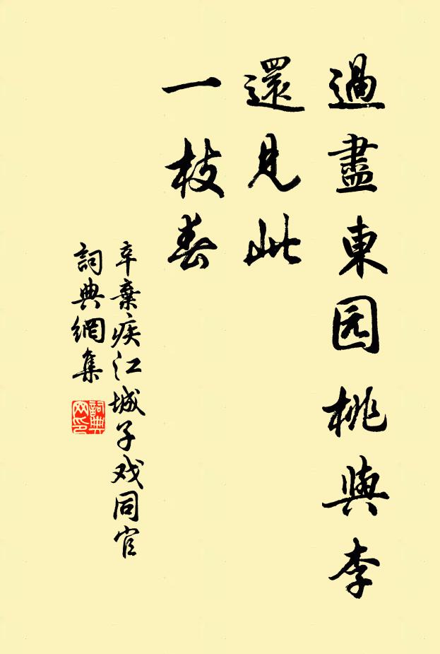古詩文歷史字典書法欣賞書法字典國語詞典說文解字康熙字典古漢語字典過盡東園桃與李,還見此,一枝春辛棄疾 《江城子(戲同官)》名句出處出自宋代辛棄疾的《江城子(戲同官)》全文:留仙初試砑羅裙。小腰身。可憐人。江國幽香,曾向雪中聞。過盡東園桃與李,還見此,一枝春。庾郎襟度最清真。挹芳塵。便情親。南館花深,清夜駐行雲。拚卻日高呼不起,燈半滅,酒微醺。名句書法欣賞過盡東園桃與李,還見此,一枝春書法作品辛棄疾名句,江城子(戲同官)名句名句推薦故人家住吳山上,借得西湖自捲簾姜夔《雪中六解》宮水當門落,僧園舊徑通張詠《贈孫曹二生》豈期官紵溪,君為幕下士晁公溯《送宋秀實罷官歸將有東南之行》中秋有月更有酒,樂事賞心並二難趙必象《和文文山中秋賞月韻》崩湍一何哀,下落萬仞溪陸游《太息》縹緲乘鸞女高觀國《隔浦蓮(七夕)》閬苑春回花枝少楊 * 《氐州第一》有興能來故差易,真愁回棹似山陰趙蕃《次韻伯元季奕送成父因以見寄五絕句》虎狼地僻炊煙晚,風雨天低夏木寒范成大《峰門嶺遇雨,泊梁山》我欲學為農,力耕不逢歲趙蕃《枕上有感二首》步兵碑尚在,功業敢經綸張堯同《嘉禾百詠高使君祠》正憐雲水與心違,湖上亭高對翠微羅鄴《夏晚望嵩亭有懷》重陽後,菊花風雨秋張可久《【南呂】金字經_春懷瘦影孤》年老思家切,交深話別難戴復古《別董叔宏兄弟》奇峰七十二,羅列景逾好韓元吉《列岫亭用范伯升韻》詩詞推薦菊逸之歌楊維楨〔元代〕菊之澹兮北門之秋,菊之靖兮栗里之丘。菊之逸兮審夫去留,老余圃兮海之陬。飲菊泉兮谷之洲,征斯人兮吾誰與求志宋庠〔宋代〕壯心銷盡見天機,敢惜功名與世違。拙似潘生難濟用,老於蘧瑗轉知非。多年鷄口慚爭食,自古駑筋愛舉肥。常恐南歌子王吉昌〔元代〕靈腑諸塵淨,民山一氣生。三田晝夜鐵牛耕。鼓潤風雷,金井長瓊英。火力憑加減,冰肌應候烹。圓明方寸鬼神驚玉泉洞黃非熊〔宋代〕百尺寒泉漱玉鳴,洞門斜入石廊橫。煙霞不改古今色,山水無閒朝暮聲。窺洞野猿懸樹立,驚人呦鹿上岩行。有時行香子·七夕李清照〔宋代〕草際鳴蛩。驚落梧桐。正人間、天上愁濃。雲階月地,關鎖千重。縱浮槎來,浮槎去,不相逢。星橋鵲駕,經年才芙蓉渡酒店前金沙芍藥盛開楊萬里〔宋代〕山店春光也自妍,芙蓉渡口數家村。筍輿低過金沙架,籬落疏圍芍藥軒。孤客倦遊殊寂寞,兩花作意與溫存。可憐偈釋光祚〔宋代〕東家李四婆,西家來乞火。門外立少時,嗔他停滯我。惡發走歸家,虛心屋裡坐。可憐群小兒,終日受飢餓。有眼踏莎行姚寬〔宋代〕苹頁煙深,荷花露濕。碧蘆紅蓼秋風急。采菱渡口日將沈,飛鴻樓上人空立。彩鳳難雙,紅綃暗泣。回紋未剪吳刀謝鶴林見訪白玉蟾〔宋代〕我方一枕午風眠,君正然香未解船。知問無為三不答,廣咨王母幾寥然。分明翠竹黃花意,何必紅鉛黑汞篇。寄語喜遷鶯李煜〔唐代〕曉月墮,宿雲微,無語枕憑欹。夢回芳草思依依,天遠雁聲稀。啼鶯散,餘花亂,寂寞畫堂深院。片紅休掃盡從伊