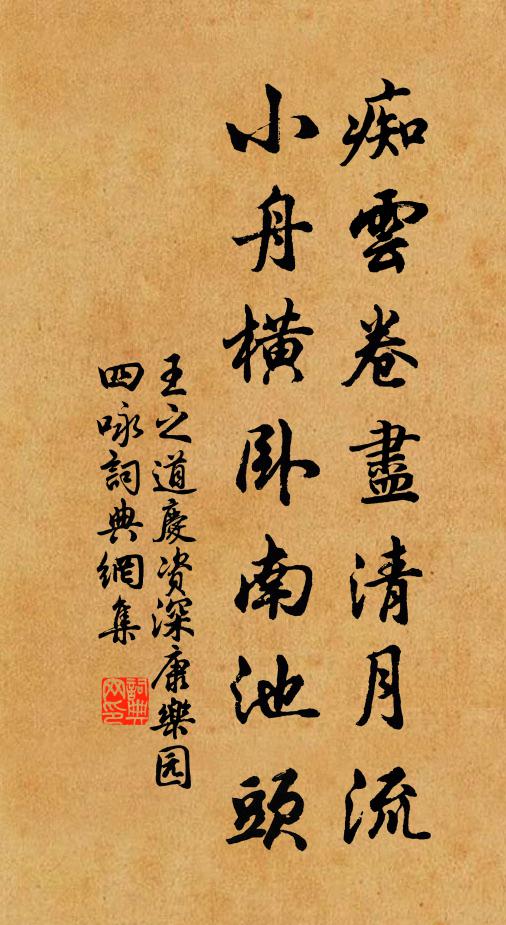 古詩文歷史字典書法欣賞書法字典國語詞典說文解字康熙字典古漢語字典痴雲卷盡清月流,小舟橫臥南池頭王之道 《慶資深康樂園四詠》名句出處出自宋代王之道的《慶資深康樂園四詠》全文:誰人獨釣江南雪,雪滿江南鳥飛絕。先生對雪望江南,嗅認梅花忍寒折。痴雲卷盡清月流,小舟橫臥南池頭。子猷乘興欲何往,歸歟莫為伊人留。名句書法欣賞痴雲卷盡清月流,小舟橫臥南池頭書法作品王之道名句,慶資深康樂園四詠名句名句推薦男兒立身須自強,李頎《雜曲歌辭。緩歌行》世間餘一念,河雒尚胡塵陸游《書懷》軒鏡光中,願如善吉貫休《大蜀高祖潛龍日獻陳情偈頌》今朝出門忽失笑,春如五日之京兆王邁《立夏前王日出郊送春》魚寒不食清池釣,何處歸舟有月明王銍《古漁父詞十二首》雲蔽天,雪欺樹王灼《題游昭畫牛四圖》湖邊千樹柳,何處寄幽影?人生寓宇內,俯仰一炊頃陸游《園中秋夕》伊予此南畝,數已逾前賢權德輿《拜昭陵過鹹陽墅》青黃原上麥,紅白草間薇王之道《夏日歸自寶林二首》長願一枝橫夜月,春風謾誕莫相催鄭剛中《和仲模梅花》非復虎臣陪殿上,空餘猩鬼泣祠旁王遂《吳大帝廟》夾道香菸笑語歡,老翁扶立小兒觀王遂《道上》前年花開憶湘水,去年花開淚如洗范成大《春思》見數朵江梅,剪裁初就周邦彥《玉燭新》六十孤老人,能詩獨臨川孟郊《教坊歌兒》詩詞推薦採藥徑釋文珦〔宋代〕采芭歸來跡已陳,真風千古蛻凡塵。細看舊徑青青草,猶是仙人醉里春。鐵壁釋心月〔宋代〕天地為爐烹不破,不通風處卻通風。自從透得歸來後,方見一重還一重。見諸公唱和暮春詩軸次韻作九首晁說之〔宋代〕何處留春意,歌殘燭半紅。柳斜雙舞破,花落獨書空。欲作經年別,先驚昨夜風。烏衣多勝概,此際恨難窮。送道傳達室侄補中國學二首程公許〔宋代〕竹林多挺固多賢,子更夸修鼎盛大年。一縷千鈞扶世緒,三條八韻壓儒先。辟雍振鷺翔而集,幽谷鳴鶯自此遷。可謝仲謀示新詩黃庭堅〔宋代〕贈我新詩許指瑕,令人失喜更驚嗟。清於夷則初秋律,美似芙蓉八月花。采菲直須論 * ,鏈金猶欲去寒沙。唐朝禪宗無門關總頌釋慧開〔宋代〕大道無門,千羞有路。透得此關,乾坤獨步。東皋十首晁補之〔宋代〕城市何妨亦隱淪,賈君無意向紅塵。東皋瓜豆如雲處,慊我幽棲不卜鄰。蘇州十詠其九觀風樓范仲淹〔宋代〕高壓郡西城,觀風不浪名。山川千里色,語笑萬家聲。碧寺煙中靜,紅橋柳際明。登臨豈劉白,滿目見詩情。遣興次前韻陳造〔宋代〕斫水蘄斷流,捻鹽寧療渴。區區守荒學,籠鳥眩樊遏。向來麋鹿姿,只可樵牧活。始其事誦數,魄似窮鬼奪。文字淮岸阻風戴復古〔宋代〕艤棹楓林外,平沙走晚晴。秋深紅鶴至,波動白鷗驚。荻浦留三日,江州計幾程。夜來風色好,行不待天明。