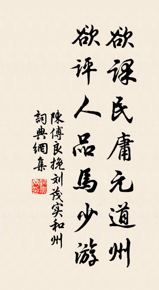 古詩文歷史字典書法欣賞書法字典國語詞典說文解字康熙字典古漢語字典欲課民庸元道州,欲評人品馬少游陳傅良 《挽劉茂實和州》名句出處出自宋代陳傅良的《挽劉茂實和州》全文:欲課民庸元道州,欲評人品馬少游。居無一事可切齒,薦有三公方掉頭。送公曆陽令我愁,目斷賓雁書沈浮。識與不識涕淚流,人世安用須封侯。名句書法欣賞欲課民庸元道州,欲評人品馬少游書法作品陳傅良名句,挽劉茂實和州名句名句推薦光影暗相催,等閒秋又來毛熙震《菩薩蠻》今朝蹋作瓊瑤跡,為有詩從鳳沼來韓愈《酬王二十舍人雪中見寄》鬢雲低度橫波約張元乾《醉落魄/一斛珠》回互不回互,回而更相涉,不爾依位住釋宗杲《偈頌一百六十首》舊邦猶憶江山主,新圃俄摧草木草郭印《吊宇文道可》山前老叟非仙骨,悵望丹崖蘚篆斑王阮《廬山太平宮一首》獨笑坐鞍自課詩,江雲雨樹兩依依胡仲弓《送梅村歸三山》雲間便覺無清氣,江上誰能繼古風黃庚《挽衛山齋》吹花小雨濕鞦韆,閒卻好春色張元乾《好事近》自然理,效隴西師父,戒行行持譚處端《神光燦 寄長安馮師兄》去者勿戚戚,來者勿赫赫羅公升《儗過錢塘約諸客同賦》區區立訓詁,亦哂河上公何耕《青羊宮》雁杳魚沉,信斷音絕劉庭信《折桂令》婿佳殊逸少,兒懶過宗文方回《老而健貧而詩自志其喜八首》六龍驤首曉駸駸,七聖陪軒集潁陰張易之《奉和聖制夏日游石淙山》詩詞推薦秋夜宿山寺顧逢〔宋代〕靜夜留山寺,清談對老龐。樹聲如有雨,秋氣欲無窗。檐馬隨風走,樓鍾帶月撞。何人呼渡急,隔水吠村厖。宇文秀才齋中海柳詠孟郊〔唐代〕玉縷青葳蕤,結為芳樹姿。忽驚明月鉤,鉤出珊瑚枝。灼灼不死花,蒙蒙長生絲。飲柏泛仙味,詠蘭擬古詞。霜風句溫庭筠〔唐代〕春水碧於天,畫船聽雨眠。綠樹繞村含細雨,寒潮背郭卷平沙。次叔通見寄四首韻劉學箕〔宋代〕周遭山五峰,環把潭一曲。溪頭植楊柳,山下栽松菊。盈阡{左禾右上皿下能}稏香,繞舍梨柿熟。歸來書在床,句徐昭然〔宋代〕精一危微共一心。追和魯直蠟梅二首王之道〔宋代〕歲窮壓霜雪,春至喜風露。一枝蠟花梅,清香美無度。漢陰縣驛有連理山茶舊嘗遠送上官擾及百姓極曹彥約〔宋代〕逞艷呈祥祗自殮,何人攫取璨趨炎。只將勿剪看君子,愛物安民處己廉。次韻魯直試院贈奉議李伯時畫詩晁補之〔宋代〕東房攜卷繞幕行,西房卷作墮地聲。紙山間出筆陣橫,李侯畫若禪眼透。觀魚玄沙骨竦瘦,舟中淵明細若豆。歸心長思仙侯善淵〔元代〕素天晴。散華瑛。薄淡靈煙滿地橫。寒光爽*清。寶精凝。玉辰澄。兩曜交光燦日明。琅點歲星。和韋開州盛山十二首流杯渠張籍〔唐代〕淥酒白螺杯,隨流去復回。似知人把處,各向面前來。
