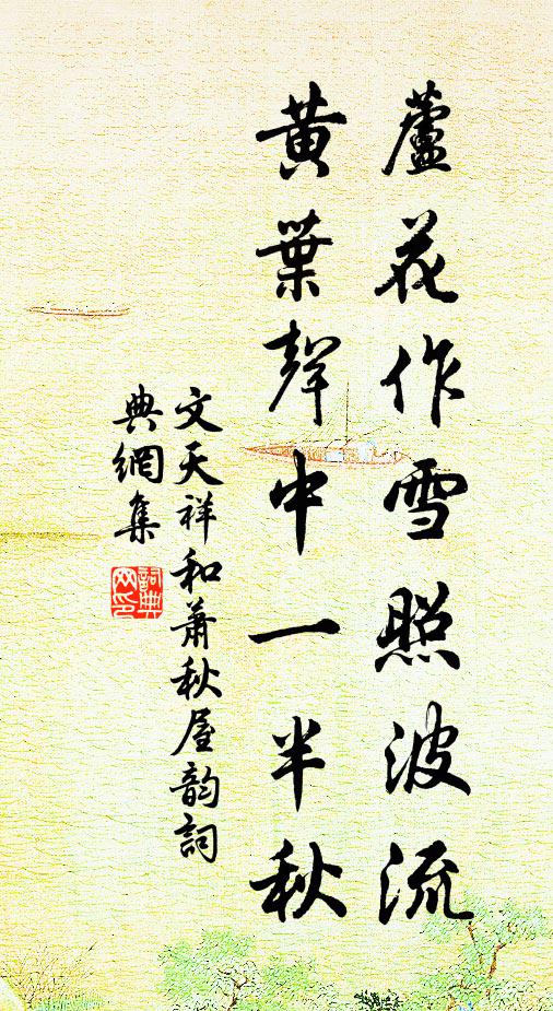 古詩文歷史字典書法欣賞書法字典國語詞典說文解字康熙字典古漢語字典蘆花作雪照波流,黃葉聲中一半秋文天祥 《和蕭秋屋韻》名句出處出自宋代文天祥的《和蕭秋屋韻》全文:蘆花作雪照波流,黃葉聲中一半秋。明月嬋娟千里夢,扁舟汗漫五湖游。星辰活動驚歌笑,風露輕寒敵拍浮。贏得年年清賞處,山河全影入金甌。名句書法欣賞蘆花作雪照波流,黃葉聲中一半秋書法作品文天祥名句,和蕭秋屋韻名句名句推薦留屯漢中綴秘師,計俊萬全無一失陽枋《送雲山文先生吏部赴召》長亭著鞭莫太早,愁色正在登臨中李彌遜《送鄒德久還鄉在福唐作》舊國難歸葬,余紫不給◇歐陽修《謝公輓詞三首》巫峽見巴東,迢迢出半空皇甫冉《樂府雜曲鼓吹曲辭巫山高》重重青蓋下,千嬌照水,好紅紅白白蘇軾《荷華媚(荷花)》嗟予衰甚矣,不及酹原頭劉克莊《挽李宜人》天生異寶世須求,說是君衷自懷玉王洋《贈丁執中》境與潮陽接,傳聞盜已平劉克莊《送海豐薛縣尉》諸將欲言事,逡巡不敢入劉希夷《將軍行》一笑羊城聊適意,明朝話別兩酸辛陳藻《別王司法》一壇橫壓紺天低,好向雲端覲紫微趙善括《登壇作》西風一笑鳳凰城,夢裡相逢各自驚黎廷瑞《金陵別程萬里教授》元氣所融結,萬古奠南紀方回《晚登會真道堂望廬山大江作》絕域地欲盡,孤城天遂窮岑參《安西館中思長安》不向世間爭窟穴,蝸牛到處是吾廬王禹偁《放言》詩詞推薦大芙蓉接待釋師範〔宋代〕水云何處覓行蹤,踏破天台雁盪峰。腳力盡時訊息在,小芙蓉接大芙蓉。送僧歸天竺崔塗〔唐代〕忽憶曾棲處,千峰近沃州。別來秦樹老,歸去海門秋。汲帶寒汀月,禪鄰賈客舟。遙思清興愜,不厭石林幽。王評事駙馬花燭詩盧綸〔唐代〕萬條銀燭引天人,十月長安半夜春。步障三千隘將斷,幾多珠翠落香塵。一人女婿萬人憐,一夜調疏抵百年。為報史應之贊黃庭堅〔宋代〕眉山史應之,愛酒而滑稽。對鄙不肖,醉眼一笑。司馬德操,萬事但好。東方戲嘲,驚動漢朝。窮則德操,達則方蜀人舊食決明花耳潁川夏秋少菜崇寧老僧教人蘇轍〔宋代〕秋蔬舊采決明花,三嗅馨香每嘆嗟。西寺衲僧並食葉,因君說與故人家。王廙問安王秋二帖贊岳珂〔宋代〕摹法之精,必驗以真。我見棗刻,已同似人。啟以楷書,告以章草。情敬之分,於此焉考。曉起李新〔宋代〕曉禽聒起坐薪床,梳裹斑絲短短蒼。翁面撥來蛆子白,花心飛出蝶須黃。游蜂聲沓晨衙退,細篆香縈碧線長。已約西平樂方千里〔宋代〕倦踏征塵,厭驅匹馬,凝望故國猶賒。孤館今宵,亂山何許,平林漠漠煙遮。悵過眼光陰似瞬,回首歡娛異昔,流歡喜吟邵雍〔宋代〕揚善不揚惡,記恩不記讎。人人自歡喜,何患少交遊。宿長蘆寺方丈范成大〔宋代〕塔廟新浮水,汀洲舊布金。聊恁一葦力,與障萬波侵。帆影窺門近,鐘聲出院深。夜闌雷破夢,欹枕聽潮音。