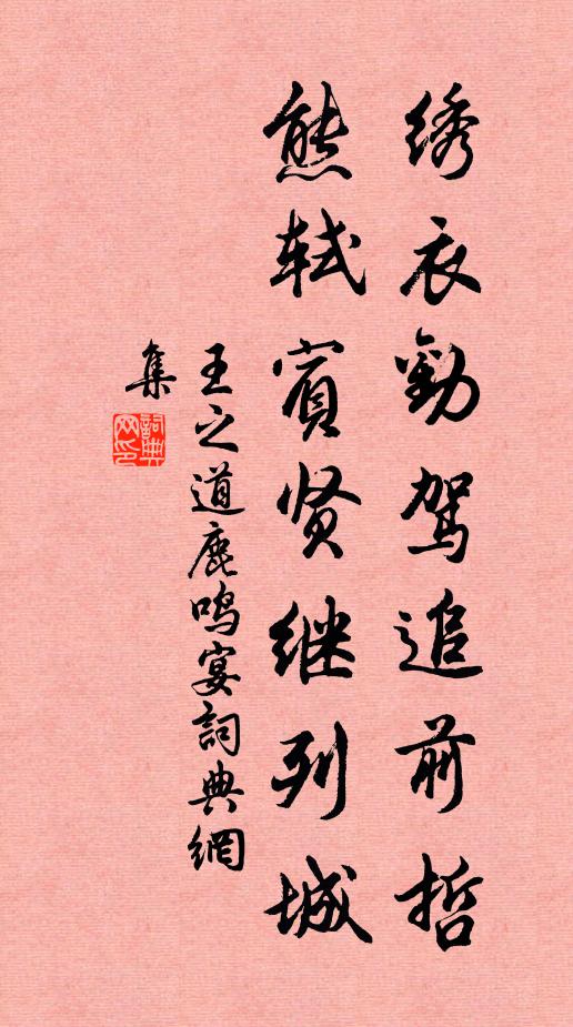 古詩文歷史字典書法欣賞書法字典國語詞典說文解字康熙字典古漢語字典繡衣勸駕追前哲,熊軾賓賢繼列城王之道 《鹿鳴宴》名句出處出自宋代王之道的《鹿鳴宴》全文:蒼顏華發老書生,來赴公堂宴食苹。曾預宣和聞喜集,重觀乾道計偕行。繡衣勸駕追前哲,熊軾賓賢繼列城。久矣邦人虛桂籍,正須公等振英聲。名句書法欣賞繡衣勸駕追前哲,熊軾賓賢繼列城書法作品王之道名句,鹿鳴宴名句名句推薦影生於形,響生於聲釋正覺《偈頌二百零五首》羽毛新刷陶潛菊,喉舌初調叔夜琴齊己《早鶯》夏天子紫金三十斤,賜有德者。佚名《長安空宅銘篆》自古天人無間斷,寧因水旱輟良農曹彥約《橫舟弟相別年餘阻一江之水彼此皆病未有可會》梢頭一捻紅趙長卿《菩薩蠻(初夏)》維揚非所愛,有便即歸耕王禹偁《揚州寒食贈屯田張員外成均吳博士同年殿省柳》底許擠排作尊客,只令撫己嘆衰年陳造《東莊小留四首》零珠碎玉,為誰密上南枝佚名《漢宮春》飄然斑白身奚適,傍此煙霞茅可誅杜甫《嶽麓山道林二寺行》老更諳時事,閒多見物情白居易《晚夏閒居,絕無賓客,欲尋夢得,先寄此詩》風回雪急巧穿帷,黃竹歌殘更斂眉虞儔《賦雪》長天誰雲廣,不見收墮雨王銍《妾薄命》皆由使君恩,盛德致時和姜特立《喜雨寄曾少卿》任群情晝夜,世路奔波,競爭蠻觸馮尊師《蘇武慢》此言真吾藥,口訥不易酬趙企《別天台》詩詞推薦送因大師釋重顯〔宋代〕瘦藤清對紫方袍,閒步坤維意轉高。若到慎江人借問,金輪王子是吾曹。歸田詩司馬光〔宋代〕秋水風波大,嗟嗟未可游。漁樵自應樂,珪組為誰憂。直木知先伐,明珠忌暗投。果然鉤可曲,不惜取封侯。偈傾一百三十三首釋法薰〔宋代〕言詮不及處,文彩未生時。電光石火,猶尚遲遲。直下橫身擔荷得,藕絲牽動五須彌。簡鄭高士二首方回〔宋代〕憶昔西湖北,閒尋隱士廬。水濱維舴艋。屋角認棕櫚。紅出仙人酒,黃披老氏書。寫真元有約,隔歲定何如。送僧歸南嶽齊己〔唐代〕濁世住終難,孤峰念永安。逆風眉磔磔,沖雪錫珊珊。石室關霞嫩,松枝拂蘚乾。岩猿應認得,連臂下句欄。句楊黎州〔宋代〕天上義輪都易識,人間堯歷自難逢。詠傅岩監祠梁載言〔唐代〕聞道監中霤,初言是大祠。很傍索傳馬,傯動出安徽。衛司無帟幕,供膳乏鮮肥。形容消瘦盡,空往復空歸。皇雅十首《帝制》五章尹洙〔宋代〕於穆聖考,德無與偕。匪勤於兵,北人遂來。逮是三紀,遠俗以懷。生民休息,嗚呼仁哉。題僧房雙桐王昌齡〔唐代〕棕櫚花滿院,苔蘚入閒房。彼此名言絕,空中聞異香。題吳氏四賢堂羅鑒〔宋代〕河汾續經罷,洙泗還清風。深衣在帶垂,身退道則豐。一編通言在,萬古無盲聾。遺像今偉然,吾敬環溪公。