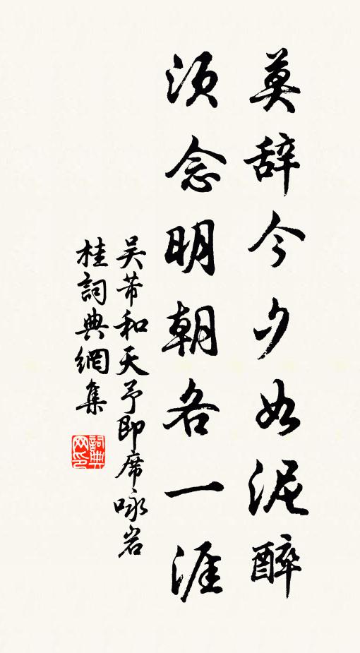古詩文歷史字典書法欣賞書法字典國語詞典說文解字康熙字典古漢語字典莫辭今夕如泥醉,須念明朝各一涯吳芾 《和天予即席詠岩桂》名句出處出自宋代吳芾的《和天予即席詠岩桂》全文:衰病無悰日日加,喜君來自帝王家。素娥正駕一輪玉,老桂方開雙樹花。置酒雖欣陪重客,侑樽還愧乏名娃。莫辭今夕如泥醉,須念明朝各一涯。名句書法欣賞莫辭今夕如泥醉,須念明朝各一涯書法作品吳芾名句,和天予即席詠岩桂名句名句推薦馳道春風起,陪游出建章李嶷《雜曲歌辭少年行三首》但見彩雲橫木未,不知身在翠微間劉宰《題馮公嶺旅邸》遠公不出山,坐受天龍供張耒《神運殿望香爐天池等峰晚宿官廳明日早發》先朝御六飛,親竭瀨鄉祠,牛酒當時惠司馬光《送王彥臣同年通判毫州》泓澄湛寒碧,潭影尤可愛黃伯固《淵靚亭》彭城不百里,摻袂空懊惱郭印《送張安國赴天彭司錄》佇看百子共千孫哀長吉《西江月(賀人生日生孫)》鴒原暮下沙水暖,雁行夜落霜天空葛立方《二老堂》若綴班行盡向高,爐香夾侍螭坳側趙孟堅《甲辰歲朝把筆》寶塔禮終僧室靜,粉牆題罷使車回王昌符《題應天寺》遐想靈椿慶,春秋合幾年強至《上何太宰生日二首》向來忠烈已無前,此去勛庸非偶然吳芾《呂丞相生日》喧譁眾賓歡也黃庭堅《瑞鶴仙·環滁皆山也》行年六十三風氣,齒髮雖衰志未衰邵雍《六十三吟》數頭餘赤質,二色類銀姿穆修《食魚》詩詞推薦送化主釋崇岳〔宋代〕百億分身利有情,驢顋馬頷實難明。有時鬧里聊伸手,意在鉤頭不在星。肩輿歷湖桑堰東西過陳灣至陳讓堰小市抵暮乃陸游〔宋代〕堤遠沙平草色勻,新晴喜得自由身。芋羹豆飯家家樂,桑眼榆條物物春。野店茶香迎倦客,市街犬熟傍行人。牆頭送海南客歸舊島張籍〔唐代〕海上去應遠,蠻家雲島孤。竹船來桂浦,山市賣魚須。入國自獻寶,逢人多贈珠。卻歸春洞口,斬象祭天吳。詠風董思恭〔唐代〕蕭蕭度閶闔,習習下庭闈。花蝶自飄舞,蘭蕙生光輝。相烏正舉翼,退鷁已驚飛。方從列子御,更逐浮雲歸。有感再作三首王阮〔宋代〕頓覺衰殘甚,難勝委寄隆。驚惶牛喘月,悵望馬依風。忍看丹爐壞,終憐蕙帳空。明年花慢發,待我轉來紅。無題二首龐謙孺〔宋代〕可惜花無主,分明枉過春。誰憐桃李艷,卻屬路行人。有感二首張嵲〔宋代〕庾翼神明還舊觀,蕺山草樹見揮毫。如今只作葡萄用,惆悵遭離老虜曹。驀山溪張元乾〔宋代〕一番小雨,陡覺添秋色。桐葉下銀床,又送個、淒涼訊息。故鄉何處,搔首對西風,衣線斷,帶圍寬,衰鬢添新白偈傾一百六十九首釋智朋〔宋代〕海底蓬塵起,千江水逆流。維摩丈室,有三萬二千獅子座,收。釣磯趙蕃〔宋代〕樂是煙波好,寧須竿線勞。功高殊釣渭,意適似游濠。