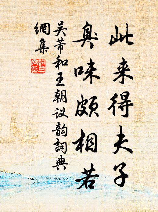 古詩文歷史字典書法欣賞書法字典國語詞典說文解字康熙字典古漢語字典此來得夫子,臭味頗相若吳芾 《和王朝議韻》名句出處出自宋代吳芾的《和王朝議韻》全文:晚日蓋轉雲頭,蓋長空收雨蓋腳。稍覺暑氣清,獨坐傾桑落。興來或醉吟,接?還倒著。胸中了無憂,事事俱脫略。緬懷我友朋,蹤跡東西各。幾欲往從之,恨被微官縛。此來得夫子,臭味頗相若。傾蓋便論心,開懷不我卻。新詩一何工,清思渺寥廓。才如李杜雄,句壓曹劉弱。顧我志意衰,筆力不如昨。明時百無用,正恐填溝壑。公餘幸少閒,對蓋且深酌。拭目看諸公,袞袞登台閣。名句書法欣賞此來得夫子,臭味頗相若書法作品吳芾名句,和王朝議韻名句名句推薦清俸供僧盡,滄洲寄跡深林寬《送惠補闕》宣王追祖宗,考牧與宮室王安石《寓言九首》棒不到心死,喝不到耳聾釋紹曇《偈頌一百零二首》芳草池塘春夢後,粉香簾幕曉晴初程垓《浣溪沙》一枝仙桂如攀得,只此山前是老期杜荀鶴《閒居即事》能脫身牢籠外,便是大英雄。王永彬《圍爐夜話·第二八則》問客之所為,峨冠講唐虞韓愈《示兒》謝公遺冢尚坡陀,絲竹中年好若何蘇泂《金陵雜興二百首》通宵不睡睡方奇,夢裡驚聞新子規楊萬里《宿黃土龕,五更聞子規》且飲一壺銷百恨,會須遭遇識通津李中《維舟秋浦,逢故人張矩同泊》鳧鷖滿中流,有酒復盈尊王建《從元太守夏宴西樓》雨師既先後,道路無纖埃儲光羲《雜詩二首》詩書或發冢,熟念令人惋黃庭堅《晁張和答秦覯五言予亦次韻》逢君善草札何遜《答江革聯句不成》君看簞瓢人,磨礲極醇粹陳淳《隆興書堂自警三十五首》詩詞推薦開歲頗思江湖游適陸游〔宋代〕健筆當年賦遠遊,即今侷促但堪羞。雖為月下孤舟客,未醉天涯七澤秋。丹熟竟當金換骨,客來從笑雪蒙頭。龍泉雜詩佚名〔唐代〕勸君莫惜金縷衣,勸君須惜少年時。有花堪折直須折,莫待無花空折枝。青天無雲月如燭,露泣梨花白如玉。子規寄滿衡父王令〔宋代〕寒業落傞傞,荊榛刺出柯。四鄰松竹少,晚歲雪霜多。茲世居無可,勞生計奈何。此心須見子,不敢向人歌。次韻十絕安心樓鑰〔宋代〕但使心如水在槃,坐令四體自然胖。有人來問安心法,將汝心來與汝安。舶使王會溪太守趙見泰九日領客枉顧山中賦采蒲壽宬〔宋代〕淡淡暮秋色,行行繞疏籬。最愛重九名,擬和柴桑詩。風流足千載,感慨彼一時。此日不易得,有酒安可辭。題陳守宰仁和無倦堂二首陳造〔宋代〕陳侯昔為邑,鼓舞輦轂民。爾來佐淮郡,喜詫有腳春。例滿徯志望,正繄不已純。帖焉受馴擾,初豈煩令申。撫臨枕上陸游〔宋代〕呼兒 * 上門關,怕冷貪眠自笑孱。月色橫分窗一半,秋聲正在樹中間。暮年不復樽前樂,浮世無如枕上閒。鏈句泊頭陀寺蘇泂〔宋代〕世上身名孰是非,維舟日日釣魚磯。長江天闊不知處,夏口青山人夜歸。雜曲歌辭。十二月樂辭。九月李賀〔唐代〕離宮散螢天似水,竹黃池冷芙蓉死。月綴金鋪光脈脈,涼苑虛庭空澹白。露花飛飛風草草,翠錦斕斑滿層道。雞人老筆贈銛上人二首張鎡〔宋代〕已事殷然爭,江湖第一流。才高樓五鳳,伎進刃全牛。可惜梅花節,忙回竹葉舟。老師應賞棒,碑巨壓東州。