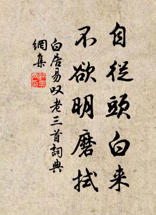 古詩文歷史字典書法欣賞書法字典國語詞典說文解字康熙字典古漢語字典自從頭白來,不欲明磨拭白居易 《嘆老三首》名句出處出自唐代白居易的《嘆老三首》全文:晨興照青鏡,形影兩寂寞。少年辭我去,白髮隨梳落。萬化成於漸,漸衰看不覺。但恐鏡中顏,今朝老於昨。人年少滿百,不得長歡樂。誰會天地心,千齡與龜鶴。吾聞善醫者,今古稱扁鵲。萬病皆可治,唯無治老藥。我有一握髮,梳理何稠直。昔似玄雲光,今如素絲色。匣中有舊鏡,欲照先嘆息。自從頭白來,不欲明磨拭。鴉頭與鶴頸,至老常如墨。獨有人鬢毛,不得終身黑。前年種桃核,今歲成花樹。去歲新嬰兒,今年已學步。但驚物長成,不覺身衰暮。去矣欲何如,少年留不住。因書今日意,遍寄諸親故。壯歲不歡娛,長年當悔悟。名句書法欣賞自從頭白來,不欲明磨拭書法作品白居易名句,嘆老三首名句名句推薦解驂分袂,催上蘭橈劉鎮《行香子(贈柳兒行·題從花菴詞選補)》目斷鄉程遠,樓高客恨深朱淑真《和前韻見寄 其一》智悲同運,野店橫溪釋印肅《偈頌三十首》願學平原十日飲,此時不忍歌驪駒韓翃《贈兗州孟都督》白浪高於屋,風回熨帖平曾用孫《赤壁》惟賴有朋想博約,過情之譽豈宜蒙胡寅《和黃執禮六首》當時宋玉悲感,向此臨水與登山柳永《戚氏·晚秋天》難由緒,沒是處,吃緊有統鏝的姨夫王修甫《【越調】鬥鵪鶉_闕蓋荷枯,》我年過半百,氣衰神不全白居易《仲夏齋戒月》欲知來往久,三見月如鉤喻良能《被檄之上饒言還未幾又復往焉至小渡遇雨遣興》窮巷蕭條早閉門,北窗燈火夜昏昏陸游《冬夜》豹錢驄子能擎舉,兼著連乾許換無段成式《戲高侍御七首》君琴妙甚素所慳,知我知音為我彈白玉蟾《琴歌》去掃冬林下,閒持未遍經薛能《冬日送僧歸吳中舊居》無人相伴醉,沙觜弄潺湲姜特立《漁舍》詩詞推薦雨師雷神七首佚名〔宋代〕山川出雲,裔裔而縷。載霪載濛,其德迺溥。自古有年,胡然莫祖。無簡我觚,地怠我俎。題牧牛圖陳與義〔宋代〕千里菸草綠,連山雨新足。老牛抱朝飢,向山影觳觫。犢兒狂走先過浦,卻立長鳴待其母。母子為人實倉廩,汝飽睡起姚孝錫〔宋代〕睡起日侵牖,開軒遙見山。曉風吹臘盡,芳草惹春還。煙暖鶯遷谷,雲低雁渡關。衰年人事減,遇酒得開顏。寄何立可提刑劉克莊〔宋代〕故人握節守齊安,聞說邊頭事愈難。赤手募丁修險隘,白頭擐甲御風寒。半腰城甫包圍畢,一把兵皆點摘殘。收得至靈壁鎮於許供奉處得杜挺之書及詩梅堯臣〔宋代〕去冬過尋歷陽守,江沙半遮當利口。口頭沙蹙浪如山,浦漵排舟魚貫柳。卻畏浪高難苦留,聞解符來時不久。平時題山橋十首王柏〔宋代〕滔滔利俗著人深,灑灑衿懷可出塵。指日洞陽斤斧息,開山一著要當人。謝袁起岩使君借貢院居陳造〔宋代〕火雲烘白晝,悠悠晝日長。黃塵撲面去,行客汗反漿。老夫清夢起,開卷鉤北窗。微風入巾袂,世恐無此涼。雜曲歌辭。崑崙子佚名〔唐代〕揚子譚經去,淮王載酒過。醉來啼鳥喚,坐久落花多。中秋雨過月出曹勛〔宋代〕綠衛芳樹鳥啼春,與客相攜發興新。半落杏花初過雨,微酸梅子已生仁。每尋詩去必遷坐,穩跨牛歸不問津。筋力初春夙興宋庠〔宋代〕戍城官柝應營笳,愁枕無眠感曙鴉。料峭風頭猶助凍,蒼涼天角欲成霞。離離弈局殘星墜,脈脈刀環片月斜。尚喜