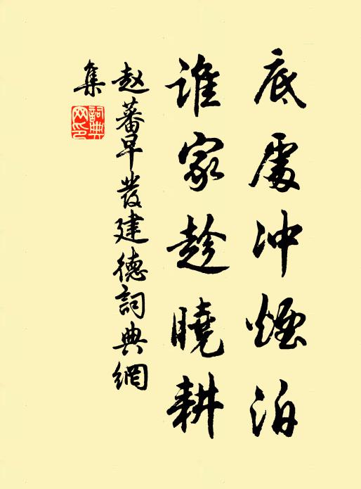 古詩文歷史字典書法欣賞書法字典國語詞典說文解字康熙字典古漢語字典底處沖煙泊,誰家趁曉耕趙蕃 《早發建德》名句出處出自宋代趙蕃的《早發建德》全文:雨霧連晴霧,山行近水行。悠悠成小駐,役役又前征。底處沖煙泊,誰家趁曉耕。詩材動鄉邑,點檢欠經營。趙蕃詩詞大全名句書法欣賞底處沖煙泊,誰家趁曉耕書法作品趙蕃名句,早發建德名句名句推薦金陵留舉子,始獲識偉人方回《送呂主簿還任永豐》宗門個樣師,熟不生戀慕釋慧開《偈頌八十七首》無奈靈和標格在,春來依舊褭長條韓偓《柳》我生抱孤貞,有似窗前竹陳文蔚《賈元永寄詩有窮愁之嘆和韻寬之》吟余未懶蕭疎興,曾寫離披一兩枝王佐才《答秦兵部求墨竹》素事主十年,凡三千有六百日白居易《不能忘情吟》嗟予生雖晚,考古意所妉蘇軾《東湖》兼乞覓、庵糧便利王哲《解佩令 贈馬鈺》莫怪行人頻悵望,杜鵑不是故鄉花司空圖《漫書五首》女子則多怨,丈夫當自反陸游《北窗梧葉坐間落四五有感》磳磴貂裘弊,飄蕭鶴髮侵司馬光《送吳耿先生》對面忽相呈,全全不似像釋祖欽《如初禪人請》興來偶一適,事過含余怍陳造《病起四詩二止酒》紙帳一床餘紙被,不妨更作獨眠人虞儔《新糊小室明簾戲書》乞得膠膠擾擾身,卻笑區區者辛棄疾《卜運算元(答晉臣,渠有方是閒、真得歸二堂)》詩詞推薦又賦早春書事徐鉉〔唐代〕苑裡芳華早,皇家勝事多。弓聲達春氣,弈思養天和。暖酒紅爐火,浮舟綠水波。雪晴農事起,擊壤聽賡歌。玉女搖仙佩 秋情張玉娘〔元代〕霜天破夜,一陣寒風,亂淅入簾穿戶。醉覺珊瑚,夢回湘浦,隔水曉鐘聲度。不作高唐賦。笑巫山神女,行雲朝暮官舍偶書趙湘〔唐代〕病枕方行藥,公門似隱居。孤煙寄庭木,微雨長秋蔬,宦薄慚騎馬,山高夢結廬。期僧仍未至,慵寫與人書。句劉瀾〔宋代〕東風半綠官圩草,西日遙紅別岸山。答潘尼詩陸機〔魏晉〕於穆同心。如瓊如琳。我東曰徂。來餞其琛。彼美潘生。實綜我心。探子玉懷。疇爾惠音。涉沅瀟李紳〔唐代〕屈原死處瀟湘陰,滄浪淼淼雲沉沉。蛟龍長怒虎長嘯,山木翛翛波浪深。煙橫日落驚鴻起,山映餘霞杳千里。鴻叫瑞鷓鴣(海棠)尤袤〔宋代〕兩行芳蕊傍溪陰。一笑嫣然抵萬金。火齊照林光灼灼,彤霞射水影沈沈。曉妝無力胭脂重,春醉方酣酒暈深。定自扇子詩李石〔宋代〕只教人喜莫教嗔,此是天公最至仁。吹落吹開俱有意,閒花野草漫爭春。酬贈夢真上人釋行肇〔宋代〕禪舍因吟往,晴來坐徹宵。春通三徑晚,家別九江遙。巢重禽初宿,窗明葉旋飄。住期應未定,謝守有詩招。西湖竹閣寺周弼〔宋代〕精舍蕭疏近水涼,分明一徑綠沉槍。就移山近湖皆隱,放出樓高寺倒藏。春透露梢齊曲檻,曉翻風籜過修牆。長堤
