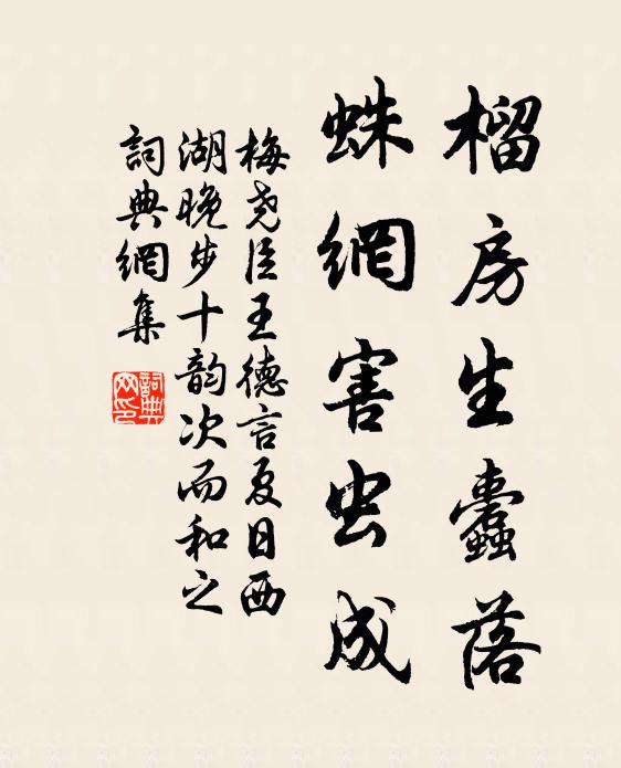 古詩文歷史字典書法欣賞書法字典國語詞典說文解字康熙字典古漢語字典榴房生蠹落,蛛網害蟲成梅堯臣 《王德言夏日西湖晚步十韻次而和之》名句出處出自宋代梅堯臣的《王德言夏日西湖晚步十韻次而和之》全文:雨余殘照在,塘靜獨行行。荷積水珠重,天收霓帔輕。倦禽倚臥柳,聚蚓殢坳泓。帽側林枝礙,裳褰野蔓縈。芡韜園客剝,蒲刃水妖驚。決決流泉活,蒙蒙夕霧平。榴房生蠹落,蛛網害蟲成。坎黽無時怒,渾魚自樂清。高台從獸窟,古道有根橫。寫景未能就,娟娟月上城。名句書法欣賞榴房生蠹落,蛛網害蟲成書法作品梅堯臣名句,王德言夏日西湖晚步十韻次而和之名句名句推薦眼看恆河幾劫沙,隨身鎖子骨鉤加陳岩《神光嶺》空岩暖律回,極目望還普釋重顯《送諸方化主》綠陰寂寂櫻桃下陳克《菩薩蠻》詩人得意吐還休,長要胸中此境留黎廷瑞《大雪過花子峰下有懷仲退南翁兼簡志上人》向來似夢此非夢,轉盼仍從夢中去李流謙《醉時謠》漸得通玄妙尹志平《青玉案》未妨賦誦銘顏樂,正學於戲無已時許月卿《次韻朱塘三首》田宅荒涼去復來,詩書顏發兩塵埃王安石《次韻答陳正叔二首》晚來失喜問揚都晁公溯《江流》單傳橫出二十六,未許歙梅洪雁行方岳《黃宰致江西詩雙井茶》卸帆月欲墮,泊岸風轉急黎廷瑞《夜泊彭蠡風大作》查德老成推倚伏,盡收寒餓雜呻吟陳三立《蒿翁游白下三宿返滬次和共留別之作》仙質肯塵埋馬鈺《清心月》到處情親即審居,從他相狎又相疎陳藻《寓居》比物何名腰下劍,無根堪並鏡中身徐夤《萍》詩詞推薦陳秀才問詩於余次韻贈之戴表元〔宋代〕秋半說詩秋又闌,覓從忘處更喔看。不妨味熟心自悟,祗恐業成身轉寒。竊木野風天倡和,崩溪怪石鬼鐫刊。扳君和項廣文喜雨王炎〔宋代〕雨師雲將莫論功,天意元因聖德通。不但水生苗厭厭,也應土潤黍芃芃。田間老稚交相語,秋後倉箱定不空。絳帳留錢塘十二年方回〔宋代〕一紀錢塘去未能,寒梅涼菊暑天冰。春風七寶山頭寺,夜雨三茅閣上燈。和靖不生無隱士,道潛如在可詩僧。大船酬孔純老送海錯三首王之道〔宋代〕海錯東來自四明,感君憐我故分珍。拜嘉何必須豪飲,大嚼姑從得句新。衢學講堂更名時心和貳車韻車韻五首袁甫〔宋代〕終身不察是凡人,一日三回省此身。參也親傳端的處,品題宜亞不違仁。將行陪貳車觀燈晁補之〔宋代〕行歌紅粉滿城歡,猶作常時五馬看。忽憶使君身是客,一時揮淚逐金鞍。頌古三十一首釋如本〔宋代〕達磨西來未足夸,少林捏目強生花。得皮得髓徒分別,妙在圓明本不差。淨口二絕句劉學箕〔宋代〕修修野竹碧琅玕,亂石懸崖劍戟攢。貧看野禽穿綠樹,不知船已過前灘。寄潭州張芸叟二首陳師道〔宋代〕湖嶺一都會,西南更上游。秋盤堆鴨腳,春味薦貓頭。宣室來何暮,蒸池得借留。孰知為郡樂,莫作越鄉憂。晦日宴高氏林亭高紹〔唐代〕嘯侶入山家,臨春玩物華。葛弦調綠水,桂醑酌丹霞。岸柳開新葉,庭梅落早花。興洽林亭晚,方還倒載車。