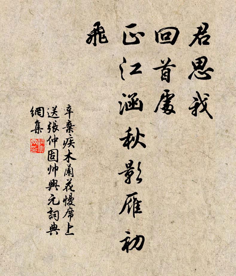 一編書是帝王師,小試去征西。更草草離筵,匆匆去路,愁滿旌旗。君思我、回首處,正江涵秋影雁初飛。安得車輪四角,不堪帶減腰圍。