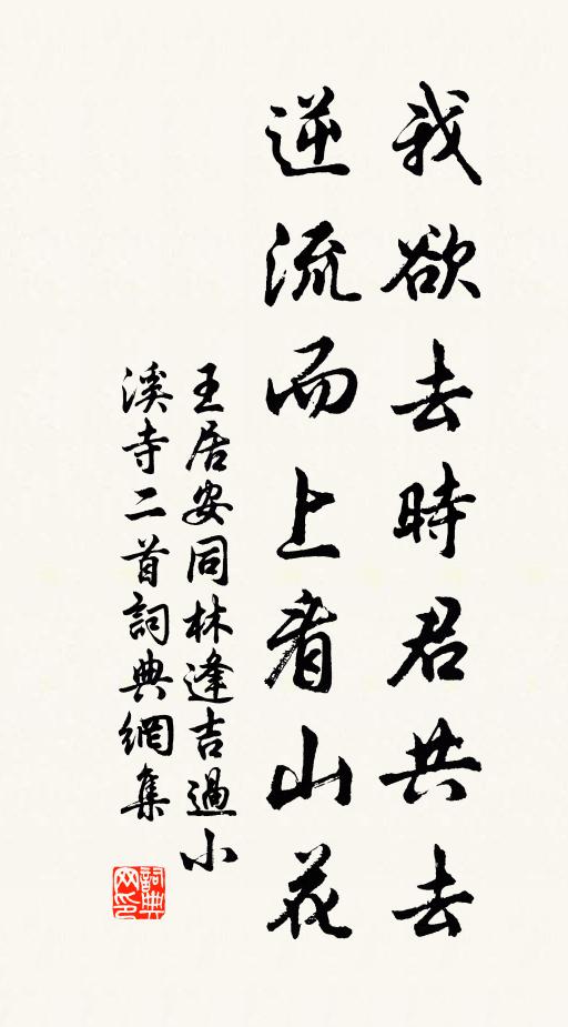 古詩文歷史字典書法欣賞書法字典國語詞典說文解字康熙字典古漢語字典我欲去時君共去,逆流而上看山花王居安 《同林逢吉過小溪寺二首》名句出處出自宋代王居安的《同林逢吉過小溪寺二首》全文:方岩勝處是仙家,時有輕雲薄霧遮。我欲去時君共去,逆流而上看山花。王居安詩詞大全名句書法欣賞我欲去時君共去,逆流而上看山花書法作品王居安名句,同林逢吉過小溪寺二首名句名句推薦謝家興詠日,漢將出師年皇甫冉《和朝郎中揚子玩雪寄山陰嚴維》欲隨流水去幽棲,喜伴歸雲入虎溪李涉《和尚書舅見寄》緘情寄天涯,杳杳江閩隔章粲《秋日懷松溪趙宰經父》行役正嗟予弟,言旋當復諸兄晁補之《濱州道中四首》未死誰言猶有命,長閒豈復更尤人蘇轍《歲莫二首》大め軻峨,越商巴賈賀鑄《擁鼻吟(吳音子)》古來風韻擅玉川,日高丈五猶打眠方逢振《茶具一贄鮮于伯機》掛冠何日賦歸來,煮石篝燈洞中宿任三傑《姜山》年高德劭,似一日、春光一日深蕭《望月婆羅門引 叔經宣慰壽 強村叢書用善本書》階前御柳搖綠,仗下宮花散紅馮延巳《早朝》九江日落回君首,三樹風吹動我情高斯得《送不浮赴沿江制參二首》收纓古蜜浦,抱袂生薑門葉適《送呂子陽自永康攜所解老子訪餘留未久其家報》閩越飽溪山,何如蜀道難黃公度《題金沙驛》迴鑾今不見,煙霧杳沉沉張喬《回鸞閣寫望》泥深留屐齒,出郭少人行陳必復《出郭》詩詞推薦次韻林子中春日新堤書事見寄蘇軾〔宋代〕東都寄食似孤雲,襆被真成一宿賓。收得玉堂揮翰手,卻為淮月弄舟人。羨君湖上齋搖碧,笑我花時甑有塵。為報南海使院對菊懷丁卯別墅許渾〔唐代〕何處曾移菊,溪橋鶴嶺東。籬疏還有艷,園小亦無叢。日晚秋煙里,星繁曉露中。影搖金澗水,香染玉潭風。罷酒孤憤吟十三首高斯得〔宋代〕掃除學法啗諸生,精銳銷磨直可坑。乞斬三奸亦人爾,汝曹何忍負齋黌。楚宮怨二首·其一李涉〔唐代〕十二山晴花盡開,楚宮雙闕對陽台。細腰爭舞君沉醉,白日秦兵天下來。偈頌一百二十三首釋普度〔宋代〕李白桃紅,桃紅李白。或雨或晴,或寒或熱。涪州北岩書院別王東卿歸樂邑陽枋〔宋代〕雨前雨後山俱好,江瘦江肥水盡佳。一見論心無久近,休言眼底各天涯。失調名楊島仙〔宋代〕待得團圓時候,樽前問這時節。寄陳仲麟仇遠〔宋代〕檇李城邊送客船,梅花一別又三年。清風朗月思元度,駿馬名姬羨謫仙。湖海倦遊予白髮,園林真樂子青氈。楚生次韻鴛鴦梅姜夔〔宋代〕漠漠江南煙雨,于飛似報初春。折過女郎山下,料應愁殺佳人。華清宮感舊王建〔唐代〕塵到朝元邊使急,千官夜發六龍回。輦前月照羅衫淚,馬上風吹蠟燭灰。公主妝樓金鎖澀,貴妃湯殿玉蓮開。有時