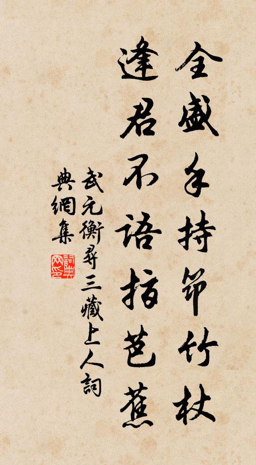 古詩文歷史字典書法欣賞書法字典國語詞典說文解字康熙字典古漢語字典全盛手持筇竹杖,逢君不語指芭蕉武元衡 《尋三藏上人》名句出處出自唐代武元衡的《尋三藏上人》全文:北風吹雪暮蕭蕭,問法尋僧上界遙。全盛手持筇竹杖,逢君不語指芭蕉。武元衡詩詞大全名句書法欣賞全盛手持筇竹杖,逢君不語指芭蕉書法作品武元衡名句,尋三藏上人名句名句推薦五處住山開毒口,不知噴殺幾多人釋了惠《悼虎丘枯椿和尚》春供萬家富遠目,響答兩地紛啼禽史浩《次韻鮑以道天童育王道中吳體》素風千戶敵,新語陸生能皎然《同李侍御萼、李判官集陸處士羽新宅》魯叟談五經,白髮死章句李白《嘲魯儒》飛盡羅心燭張樞《清平樂》傾蓋未償平日願辛棄疾《蝶戀花(用趙文鼎提舉送李正這提刑韻送趙元英)》猩血染珠璣,點綴枝條剩杜敏求《運司園亭海棠軒》結束晨裝破小寒,跨鞍聊得散疲頑范成大《早發竹下》官租日輸納,村酒時邀迓韓愈《縣齋有懷(陽山縣齋作,時貞元二十一年順宗新即位)》暮雲千里傷心處,那更亂蟬疏柳劉克莊《摸魚兒》餒蛟仄目初生羝,血牙未澆遭燖刲李流謙《同馮縉雲遊無為以吾獨胡為在泥滓分韻賦詩得》藥裹多尋醫者問,酒樽寖與故人疏樓鑰《次韻十詩》雨去花光濕,風歸葉影疏王勃《郊興》為報使君從釀酒,梅花落盡不關春陳與義《再賦》驀地詩心到海棠,問花開未曉來忙白玉蟾《問花》詩詞推薦登樓有感倪龍輔〔宋代〕好趁西風理釣舟,半生書劍兩悠悠。憑高有恨無人識,空負關河萬里秋。渡錢塘江釋行海〔宋代〕東風曉出鳳凰城,煙棹悠悠春水平。征雁北歸鄉有思,大江東去世無情。渡人來往青山在,霸業興亡白鳥驚。惆悵禪人並化主寫真求贊釋正覺〔宋代〕剎剎塵塵,隨應現身。百川之月,百華之春。阿你隨宜手眼快,更誰敢議骨頭貧。道交德鄰,主主賓賓。三世混融宮詞徐仲雅〔唐代〕內人曉起 * ,輕揭珠簾看牡丹。一把柳絲收不得,和風搭在玉欄桿。祥興第三十三文天祥〔宋代〕南遊炎海甸,沃野開天庭。真龍竟寂寞,乾坤水上萍。無題馮伯規〔宋代〕暇時結客小舂容,路直重岩紫翠峰。雲閣翬飛翼鸞鳳,石楠盤屈老虬龍。林扉雨過便秋菊,山寺風清度晚鐘。快展頌古二十四首釋勝〔宋代〕雞作蒼鷹拏鱉鼻,鴨為金翅作獰龍。空王以此垂洪範,錦上鋪花知幾重。夏日對雨寄朱放拾遺武元衡〔唐代〕才非谷永傳,無意謁王侯。小暑金將伏,微涼麥正秋。遠山依枕見,暮雨閉門愁。更憶東林寺,詩家第一流。送春醉吟陳著〔宋代〕三月二十有一日,絮雲弄日風力薄。家人報我明日夏,草草杯盤軟春腳。世人心眼最無常,景物流禪爭頃刻。南風定海寒食西湖憶盧玉堂葬西湖這上近傳有僧請戴栩〔宋代〕寒食無朝謁,閒攜載酒車。燧青宮蠟火,雨白野棠花。舊友頻游處,荒阡一酹賒。傳聞有仙筆,麗句落僧家。