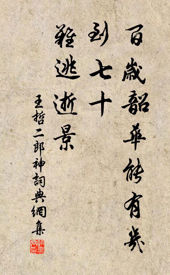 古詩文歷史字典書法欣賞書法字典國語詞典說文解字康熙字典古漢語字典百歲韶華能有幾,到七十、難逃逝景王哲 《二郎神》名句出處出自元代王哲的《二郎神》全文:觀塵境盡。總把浮名修整。此假合形骸皆不悟,猶然待、巧妝馳騁。百歲韶華能有幾,到七十、難逃逝景。*裡面真真,罪業愈重,無由祛屏。如省。當初一點,瑩清明炳。速認他、從來呼甚麽,元是圓成光影。又喚金丹仍粒粒,好做主、重令永永。願凡世、人人個個,回頭澆淳休逞。名句書法欣賞百歲韶華能有幾,到七十、難逃逝景書法作品王哲名句,二郎神名句名句推薦風流千古,一時人物,好記尊前語李流謙《青玉案(和雅守蹇少劉席上韻)》歸繞曲江煙景晚,未央明月鎖千門李紳《憶春日曲江宴後許至芙蓉園》陋巷蕭條正掩扉,相攜訪我衡茅下徐鉉《月真歌》力饒射日,名高為復,到今何濟劉志淵《水龍吟》今年輒五十,所向唯直誠梅堯臣《依韻和達觀禪師贈別》藥殘花萼歸方冊,狨老金絲觸禍機李新《陋夷》瓜分與豆剖,橫議聲洋洋柳亞子《放歌》所欠惟一死,得死今已足吳芾《和陶輓歌詞三首》明月照我牖,獨起攜軍持蒲壽宬《山中井》最憐烏鵲南飛句,不解風流見二喬辛棄疾《鷓鴣天(峽石前用韻答吳子似)》說良因,談道話王哲《蘇幕遮》化為石泉眠,位置相聯綿曾季貍《五星泉》喚回二百年前夢,索飲西風一醉餘孫唐卿《榴皮題壁》楊柳柔條未堪折,梅花聊贈歲寒枝胡仲弓《送丁仲圭歸合沙》裘嘆蘇秦弊,鞭憂祖逖先陸游《憶昔》詩詞推薦題金龜山如畫軒四首潘朝英〔宋代〕亂壑收雲接漲瀾,一天風露夜漫漫。金鱉不動涵坤軸,海月騰空萬宇寒。閒步吟邵雍〔宋代〕何者謂知音,知音難漫尋。既無師曠耳,安有伯牙琴。難逼桑榆景,寧忘松桂心。獨行月堤上,一步一高吟。浣溪沙高觀國〔宋代〕偷得韓香惜未燒。 * 人在月明橋。草芳似待玉驄驕。吹絮繡簾春澹澹,隔香羅帳夜迢迢。楚魂須著楚詞招。打灰堆詞范成大〔宋代〕除夜將闌曉星爛,糞掃堆頭打如願;杖敲灰起飛撲籬,不嫌灰涴新節衣。老媼當前再三祝,只要我家長富足輕舟作送道友歸天台貫休〔唐代〕蘚濃苔濕冷層層,珍重先生獨去登。氣養三田傳未得,藥非八石許還曾。雲根應狎玉斧子,月徑多尋銀地僧。太守惜花劉言史〔唐代〕年少共憐含露色,老人偏惜委塵紅。如何遂得心中事,每要花時不厭風。豫章行薛道衡〔隋代〕江南地遠接閩甌。山東英妙屢經游。前瞻疊障千重阻。卻帶驚湍萬里流。楓葉朝飛向京洛。文魚夜過歷吳洲。君行雙峰下哭故人李宥劉長卿〔唐代〕憐君孤壟寄雙峰,埋骨窮泉復幾重。白露空沾九原草,青山猶閉數株松。圖書經亂知何在,妻子因貧失所從。惆悵既離成都,故人送者遠至漢嘉分袂,其尤遠而范成大〔宋代〕我本住林屋,風吹來錦城。錦城亦休樂?所樂多友生。相從不知久,相送不計程。橫絕峨眉巔,欲去有餘情。吾宗元夕八首陳世崇〔宋代〕天街簫鼓厭繁華,靜訪湖山釋子家。珍玩圖書尤絢眼,選僧堂里萬蓮華。