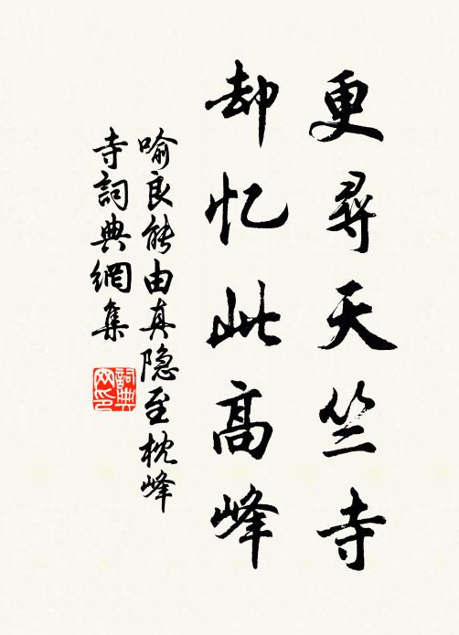 古詩文歷史字典書法欣賞書法字典國語詞典說文解字康熙字典古漢語字典更尋天竺寺,卻憶此高峰喻良能 《由真隱至枕峰寺》名句出處出自宋代喻良能的《由真隱至枕峰寺》全文:野外初涼冷,征衫亦未重。檀欒溪上竹,勃窣道邊榕。秋意撩人切,嵐光潑眼濃。更尋天竺寺,卻憶此高峰。名句書法欣賞更尋天竺寺,卻憶此高峰書法作品喻良能名句,由真隱至枕峰寺名句名句推薦洲勢逶迤繞碧流,鴛鴦鸂鶒滿灘頭孟浩然《鸚鵡洲送王九游江左》酒酣幾欲揈大鼓,驚起龍蟄驅春雷歐陽修《歸鴈亭》悵別臨晴野,悲春上古原盧綸《落第後歸山下舊居留別劉起居昆季》吾家嫁我兮天一方,遠托異國兮烏孫王劉細君《悲秋歌》隨園主人授以書,而告之曰:書非借不能讀也袁枚《黃生借書說》林泉得佳處,風物有餘清孔武仲《白公草堂》風月幾年恨,山光慘蘿蔦任續《賦玩珠岩》有無從此自相入,未見如何想得成張伯端《絕句六十四首》一自巫娥去後,雲平楚岫,玉簫聲斷南樓王和卿《【仙呂】醉中天》回首兩朝俱草莽,馳心萬里絕農桑宇文虛中《在金日作》驂鸞悲霧扇,泛蟻釂雲漿梅堯臣《依韻和希深新秋會東堂》一德三朝老,孤忠百世師曹彥約《故丞相忠定趙沂公挽章三首》帆吹佳句遠,不獨遍王畿李洞《吊膳曹從叔郎中》勿嘲見卵索時夜,在眼來牟疑仿佛高斯得《時雪應禱周子車和東坡所次柳子玉韻見始用韻》根本千齡固,元良萬口同張鎡《皇太子生辰詩》詩詞推薦梅釋行海〔宋代〕上外無花耐歲寒,花魁今古品題難。清香合讓梅為最,陽艷叢中許牡丹。雜詠一百首伏生劉克莊〔宋代〕偶脫驪山厄,龍鍾九十餘。誰知漢掌故,傳得不全書。次槐卿舅詠梅二絕喻良能〔宋代〕玉肌冰滑不多枝,半映清池半近籬。寒雪尚遲新月早,橫斜分影到漣漪。風流子毛並〔宋代〕新禽初弄舌,東郊外、催爾踏青期。漸晴灩翠漪,惠風駘蕩,暖蒸紅霧,淑景輝遲。粉牆外,杏花無限笑,楊柳不挽葛知錄母二首劉宰〔宋代〕人間盛事古難並,結髮相看兩壽寧。彤管忽成賢母傅,紫霄獨耀老人星。臨江仙張炎〔宋代〕憶得沈香歌斷後,深宮客夢迢遙。研池殘墨濺花妖。青山人獨自,早不侶漁樵。石壁蒼寒巾尚掛,松風頂上飄飄。謝羅醴陵宏材樂府見寄曹彥約〔宋代〕自別湘中首屢回,漏傳春信一枝梅。固在我老何須此,不與時同赤壯哉。百里去思民父母,三年歸作國台萊。更將哭空寂寺玄上人(一作少林寺哭暉上人)錢起〔唐代〕悽然雙樹下,垂淚遠公房。燈續生前火,爐添沒後香。陰階明片雪,寒竹響空廊。寂滅應為樂,塵心徒自傷。狀江南孟夏賈弇〔唐代〕江南孟夏天,慈竹筍如編。蜃氣為樓閣,蛙聲作管弦。蔬蘭王令〔宋代〕曉折寒蔬野圃間,荒林深處有芳蘭。世無賢士紉為佩,猶有幽人日取餐。