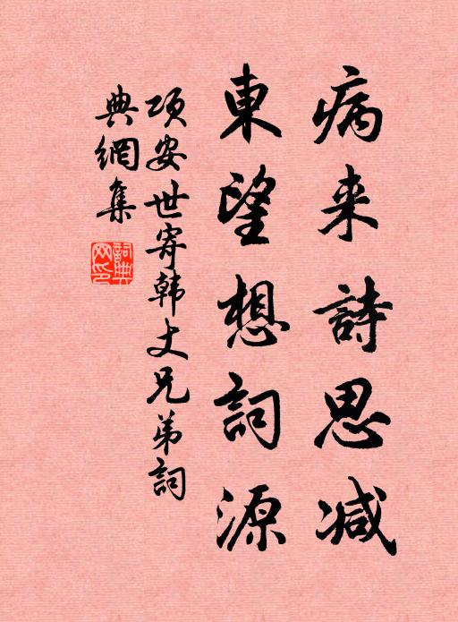 古詩文歷史字典書法欣賞書法字典國語詞典說文解字康熙字典古漢語字典病來詩思減,東望想詞源項安世 《寄韓丈兄弟》名句出處出自宋代項安世的《寄韓丈兄弟》全文:歲月驚遊子,江山隔故園。感時雖有恨,適意自忘言。土銼晨炊飯,茅檐晝負暄。病來詩思減,東望想詞源。項安世詩詞大全名句書法欣賞病來詩思減,東望想詞源書法作品項安世名句,寄韓丈兄弟名句名句推薦林壑棲遲兩見春,一筇一麈任天真郭印《春日雲溪即事二首》人生此難餘可祈,子去矣時若發機韓愈《送區弘南歸》明明去人近,眇眇彌步遠楊萬里《後圃散策》人心似江水,日夜向吳天安如山《下瞿塘》日暮蛛絲動,月暗螢火明梅堯臣《夜直廣文有感寄曾子固》同雲垂六幕,啼烏靜、風御玉妃寒王千秋《風流子》建元天子不世出,天相神武產異物,有馬出在月氏窟何麟瑞《後天馬歌》便覺靈光出一毫馬鈺《玉堂春》聾人爭得聞,依舊吃茶去釋道昌《頌古五十七首》卷珠簾、草迷芳樹韓淲《冉冉雲(弄花雨)》元劉事業時無取,姚宋篇章世不知歐陽修《太傅杜相公有答兗州待制之句其卒章雲獨無風》方憐長門閉,漸喜湯沐新五邁《反艷歌曲復三山林斗南》清流固已久絕望,白髮只今空滿頭曹勛《和都運龍圖二首》斷壁飛樓,紅翠似有還無仇遠《玉蝴蝶》唐世碑猶在,高麗鼓半穿。范仲淹《句》詩詞推薦家居宋祁〔宋代〕鬱郁行何適,肩肩體寖臞。安人非善宦,甯子是真愚。北化隨江枳,東遊謝海桴。何須命私駕,危涕避窮途。與文潛無咎對榻夜話達旦鄧忠臣〔宋代〕書窗燈火夜深明,窗外蕭蕭雨葉聲。對榻不眠談往事,紞如五鼓過嚴城。豐年謠五首王炎〔宋代〕稻如馬尾履溝塍,桑柘陰中雞犬鳴。收穫登場便無事,輸租人不入州城。有妄吟邵雍〔宋代〕作偽少陰德,飾非多隱情。人心雖曖昧,天道自分明。手足既皆露,語言安足憑。南鄉子(九日)葛勝仲〔宋代〕拂檻曉雲鮮。銷暑樓危竦半天。曾是攜賓當薦九,開筵。度水縈山奏管弦。 * 映華顛。千騎重來已六年。樓下東元日望含元殿御扇開合(大曆十三年吏部試)張莒〔唐代〕萬國來朝歲,千年覲聖君。輦迎仙仗出,扇匝御香焚。俯對朝容近,先知曙色分。冕旒開處見,鐘磬合時聞。影動和王大觀寄張仲巽蘇頌〔宋代〕內使名卿話昔游,高談術略氣橫秋。邊亭一別嗟淹久,故眼相看重唱酬。舊德朝端方見用,清才關外苦難留。腰間菩提寺私成口號王維〔唐代〕萬戶傷心生野煙,百官何日再朝天?秋槐落葉空宮裡,凝碧池頭奏管弦。王伯齊染髭樓鑰〔宋代〕垂髫相見舜江濱,荏苒俄驚過五旬。顧我頹齡真似葉,訝君長鬣亦如銀。萬金安得神仙藥,一笑重回舊日春。縱使偈頌一百三十六首釋惟一〔宋代〕今朝結制,號令宜先。三章約法,普示人天。身不可妄動,亦不可塊然。口不可妄開,亦不可默然。意不可妄舉,