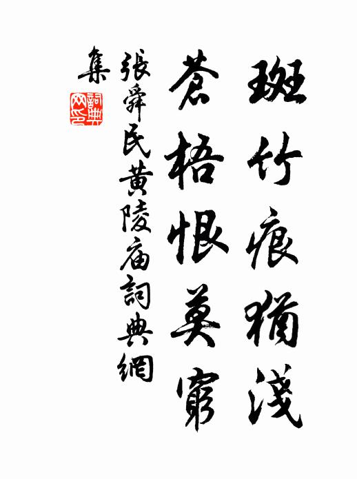 古詩文歷史字典書法欣賞書法字典國語詞典說文解字康熙字典古漢語字典斑竹痕猶淺,蒼梧恨莫窮張舜民 《黃陵廟》名句出處出自宋代張舜民的《黃陵廟》全文:青草仍殘照,黃陵一望中。壁書遷客淚,簾卷過湖風。斑竹痕猶淺,蒼梧恨莫窮。年年秋水上,瑤瑟伴驚鴻。張舜民詩詞大全名句書法欣賞斑竹痕猶淺,蒼梧恨莫窮書法作品張舜民名句,黃陵廟名句名句推薦今朝日陽里,梳落數莖絲白居易《白髮》多謝子規啼勸我,不如歸賀鑄《攤破浣溪沙/山花子》日暮九疑何處?認舜祠叢竹。文廷式《好事近·湘舟有作》嗅認梅花孰是真王之道《減字木蘭花(和張文伯對雪四首)》此請久不下,公歸奏明光彭龜年《別張袁州五首》片帆暮落,正前村梅蕊,愁人如雪曾紆《念奴嬌》正似鳩拙巢,不及蠶自裹陸游《覽鏡》既乏共濟力,拂衣起徒行黃榦《浙江舟行遇風》征鴻過盡離懷惡趙長卿《憶秦娥(初冬)》即是如來大圓覺,切忌將心重卜度釋印肅《頌證道歌證道歌》燕寢清香,畫棟珠簾雨王惲《點絳唇 癸酉夏六月五日同河中府官宴白樓》青山團遠嶂,流水瀉鳴弦郭守文《初春行宮侍宴》江水自隨潮上下,月輪閒與蚌虧盈歐陽修《送李寔》無衣織女桑猶小,闕食農夫麥未黃杜荀鶴《自江西歸九華》須君述征賦,方驗此塗艱宋庠《聞胡明遠記室將至》詩詞推薦臨河客舍呈狄明府兄留題縣南樓岑參〔唐代〕黎陽城南雪正飛,黎陽渡頭人未歸。河邊酒家堪寄宿,主人小女能縫衣。故人高臥黎陽縣,一別三年不相見。邑中呈四表兄求棲碧遺文廖行之〔宋代〕詩亡自昔周之東,末乃賴有三閭翁。三閭避讒思去國,當時無人歌雨濛。忠懷義概不見省,獨以文字塗幽窮。高情胡長民監元輓詞范成大〔宋代〕太學虀鹽舊,中吳翰墨聲。關山題柱筆,風露讀書檠。夜雨綠荷破,孤墳丹桂生。空將擅場手,往記玉樓成。丙辰年鄜州遇寒食城外醉吟五首韋莊〔唐代〕滿街楊柳綠絲煙,畫出清明二月天。好是隔簾花樹動,女郎撩亂送鞦韆。雕陰寒食足遊人,金鳳羅衣濕麝薰。腸斷發山陽得順風二首袁說友〔宋代〕一陣南風更帶回,輕扶柂櫓疾于飛。舟行若借帆檣便,細數何數十日歸。侍皇太子釋奠宴詩沈約〔南北朝〕尊學尚矣。道亦遐哉。啟圖觀秘。辟苑興才事高東序。義邁雲台。峨峨德傅。灼灼英台。復禮曲台。反樂宣榭。闕飲井多景亭陳宓〔宋代〕山海前陳遠景多,一泓冰雪醒沉疴。憑誰六月同來看,奈此清風爽氣何。春日雜興方岳〔宋代〕花柳村村奈老何,一春門巷斷經過。無繩可系西沈日,有水皆隨東逝波。妄想已空騎鶴夢,勞生亦厭飯牛歌。正須大霄觀風竿軒白玉蟾〔宋代〕蕭蕭從何來,撼我青琅玕。笙簫動天籟,雨露生秋寒,鐵笛不用吹,瑤琴不用彈。聽此夜不寐,山月落邯鄲。夏日登觀農樓和崔使君皎然〔唐代〕片雨拂檐楹,煩襟四坐清。霏微過麥隴,蕭散傍莎城。靜愛和花落,幽聞入竹聲。朝觀趣無限,高詠寄深情。