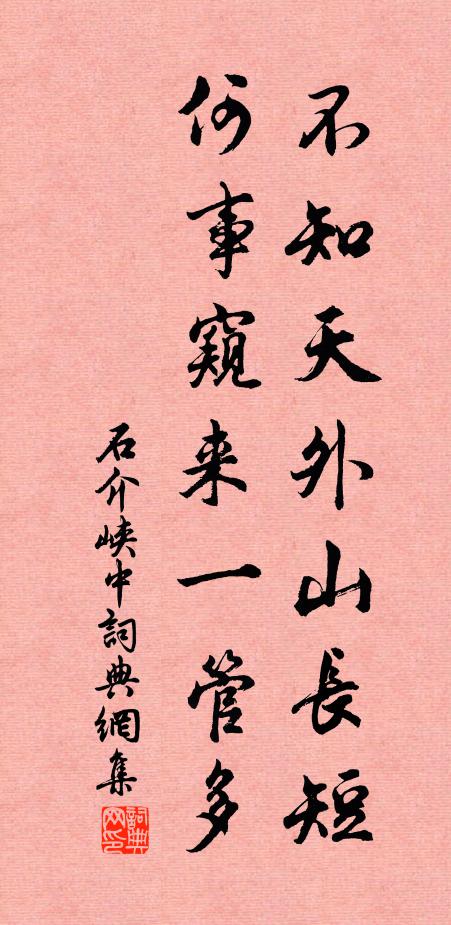古詩文歷史字典書法欣賞書法字典國語詞典說文解字康熙字典古漢語字典不知天外山長短,何事窺來一管多石介 《峽中》名句出處出自宋代石介的《峽中》全文:路狹才容飛鳥過,山將生合柰山何。不知天外山長短,何事窺來一管多。石介詩詞大全名句書法欣賞不知天外山長短,何事窺來一管多書法作品石介名句,峽中名句名句推薦委身任虎將,獻馘魯侯宮王九齡《祠龐潁公》遇事雖骯髒,接人終靜溫陸游《蘇韜光節推輓歌詞》多年名下人,四姓江南英歐陽詹《送潭州陸戶曹之任(戶曹自處州司倉除)》君庵亦澹名,聞其風興起洪咨夔《阮亨甫壽樂堂澹庵各一首澹庵》金芝秀,蒲澗碧,荔枝香徐鹿卿《水調歌頭》我生紛紛嬰百緣,氣固多習獨此偏蘇軾《夜夢並引》西望沙羡東秣陵,湓江中道是歸程岳珂《後江行十絕》更有吳姬撥小橈盧炳《武陵春(賡何顯夫小舟有景)》應須共心語,萬事一時休白居易《履道新居二十韻》天邊一點少微星,會與太陽來合照胡仲弓《談星林漢留求詩》奈何不少警,玩此白駒隙陸游《讀淵明詩》誰與陳君嫁禍來,孔寧行父夏姬媒周曇《春秋戰國門陳靈公》正朝不系民陰鏗《罷故章縣詩》東風裡,誰共倚闌乾賀鑄《小重山(四之一)》一燈同夜闌,此抱誰與適楊冠卿《秋懷十首微雲淡河漢疏雨滴梧桐為韻》詩詞推薦回沙閘成用可齋陳公韻魏峴〔宋代〕一堰限溪江,七鄉利耕稼。鹵汐回東溟,多水流仲夏。仁哉王長官,一勞貽永暇。長輸不盡澤,絕勝晴雨乍。旱魃新野道中黃滔〔唐代〕野堂如雪草如茵,光武城邊一水濱。越客歸遙春有雨,杜鵑啼苦夜無人。東堂歲去銜杯懶,南浦期來落淚頻。莫道樂府雜曲。鼓吹鐃歌。苞枿柳宗元〔唐代〕苞枿薱矣,惟根之蟠。彌巴蔽荊,負南極以安。曰我舊梁氏,輯綏艱難。江漢之阻,都邑固以完。聖人作,神武用齊天樂(端午和韻)劉辰翁〔宋代〕枝頭雨是青梅淚。翻作一江春水。魚腹魂銷,龍舟叫徹,不了湖亭張戲。滿庭芳芷。正艾日高高,葛風細細。試比眼兒媚佚名〔宋代〕憶從溪上得相逢。樽酒兩心同。梅緘香雪,竹搖寒月,柳探春風。而今總是消魂處,冷落半床空。夢迷狂蝶,喜占冬至馬廷鸞〔宋代〕山寒律琯又飛灰,萬壑松風冬起雷。風景不殊雲黯淡,雪霜初霽日徘徊。無人獻襪拋塵屨,有客傳觴醱凍醅。天地和仲固春日村居即事十二絕胡寅〔宋代〕西園聞道徑封苔,落落髯仙去不回。安石中年離縈意,吾徒笑口且頻開。元和五年予官不了罰俸西歸三月六日…愴曩游因投五十韻元稹〔唐代〕小年閒愛春,認得春風意。未有花草時,先醲曉窗睡。霞朝澹雲色,霽景牽詩思。漸到柳枝頭,川光始明媚。長安十月梅花趙必成〔宋代〕初冬未見一片雪,先見梅開傍花庵。可是東君留厚間,早傳訊息到江南。道州送戴簡處士往賀州謁楊侍郎呂溫〔唐代〕羸馬孤童鳥道微,三千客散獨南歸。山公念舊偏知我,今日因君淚滿衣。