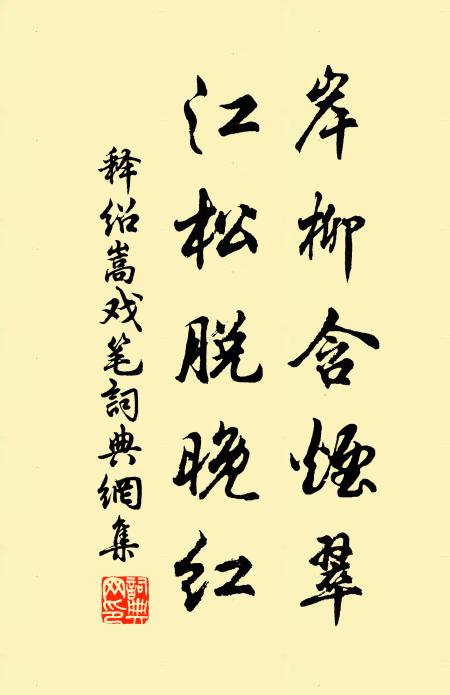 古詩文歷史字典書法欣賞書法字典國語詞典說文解字康熙字典古漢語字典岸柳含煙翠,江鬆脫晚紅釋紹嵩 《戲筆》名句出處出自宋代釋紹嵩的《戲筆》全文:地僻人稀到,東郊自養蒙。山遙天接樹,夜靜竹藏風。岸柳含煙翠,江鬆脫晚紅。詩應是遊戲,吟嘯不須工。釋紹嵩詩詞大全名句書法欣賞岸柳含煙翠,江鬆脫晚紅書法作品釋紹嵩名句,戲筆名句名句推薦湛然窮古道,群品似相邀宋太宗《緣識》手香新寫法界觀,眼淨不覷登伽女蘇軾《送劉寺丞赴餘姚》盛時忽過量,弱質本無取權德輿《早夏青龍寺致齋,憑眺感物,因書十四韻》洛下園池不閉門,洞天休用別尋春邵雍《洛下園池》在德不在險,成敗良有因吳筠《建業懷古》要試江山第一泉,紫鳳盤旋蒼璧圓王炎《次韻韓毅伯謝人惠茶》登臨始識奇,已與凡目並王柏《西倅廳冰雪樓次韻》自茲重詠南堂紙,將今世人知首尾梅堯臣《九月六日登舟再和潘歙州紙硯》君方抱經濟,我當歸樊丘杜范《仲夏朔汰卒群哄驚擾居民內外凜凜撫而賁之而》征馬百度嘶,游車動行塵李白《對雪奉餞任城六父秩滿歸京》斜陽落花流水,吹紫宇、澹成林趙文《綺寮怨(題寫韻軒)》徒思海上鷗陳子昂《宿襄河驛浦》郯子昔時遭孔聖,繇余往代諷秦宮徐夤《渤海賓貢高元固先輩閩中相訪雲本國人…屏障因而有贈》門外車馳馬驟張玉娘《如夢令 戲和李易安》白水青山不礙禪,登高臨遠意翛然釋文珦《山居冬日》詩詞推薦擬月釋慧空〔宋代〕圓時缺處何曾有,缺處圓時自儼然。舉世盡隨圓缺走,幾人透出未生前。燈下讀玄真子漁歌因懷山陰故隱追擬陸游〔宋代〕晴山滴翠水挼藍,聚散漁舟兩復三。橫埭北,斷橋南,側起船篷便作帆。蓬萊客 借張修祖殿試韻馬鈺〔元代〕還鄉急。關西牒發山東客。山東客。三千餘里,關山遙隔。當時枉把予閒測。而今且恁身如溺。身如溺。他年重話自遣李頻〔唐代〕永擬東歸把釣絲,將行忽起半心疑。青雲道是不平地,還有平人上得時。挽曹夫人劉黻〔宋代〕一見豐碑已愴情,大家名重乞誰銘。金花屢錫華封誥,白髮重看禁從榮。三世種成庭上桂,一生讀盡藏中經。當年睡足宋庠〔宋代〕府廨寥寥似野廬,晏眠猶厭閣鈴呼。不知雲夢澤南日,得似富平津北無。嚴先生祠堂記范仲淹〔宋代〕先生,漢光武之故人也。相尚以道。及帝握《赤符》,乘六龍,得聖人之時,臣妾億兆,天下孰加焉?惟先生以節抄戊辰十月近稿七首劉克莊〔宋代〕少狂費盡一生心,叢稿如山雪滿簪。楊子雕鐫夸賦麗,唐人鍛鍊說詩深。寒來尚可披裘釣,窮殺何妨帶索吟。社友登懸瓠城感吳季子王珪〔唐代〕將軍戈甲從天下,丞相旌旗匝地來。堪笑怒螳猶強臂,不知蟄戶欲驚雷。咄嗟武相深冤洗,指顧山東治境開。吏部過西山黃庭堅〔宋代〕新春木葉未蒙籠,西望天涯幾日通。商洛山間白雲起,行歌思見采芝翁。