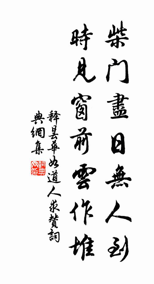 古詩文歷史字典書法欣賞書法字典國語詞典說文解字康熙字典古漢語字典柴門盡日無人到,時見窗前雲作堆釋曇華 《如道人求贊》名句出處出自宋代釋曇華的《如道人求贊》全文:江上青山疊疊來,屋頭松竹手親栽。柴門盡日無人到,時見窗前雲作堆。釋曇華詩詞大全名句書法欣賞柴門盡日無人到,時見窗前雲作堆書法作品釋曇華名句,如道人求贊名句名句推薦嘆錦箋、芳宇盈篋周密《霓裳中序第一(次篔房韻)》自顧時逢堯舜世,上下清明無穢荒孫復《中秋夜不見月》六月美宣歌北伐,五弦思舜奏南薰戴復古《慈雲避暑》法令至行,公平無私劉向《戰國策·秦一·衛鞅亡魏入秦》秋聲江一片,曙影月三分文天祥《曉起》畫松一似真松樹,且待尋思記得無景雲《畫松》染來不似舊,鑷去又重生顧逢《白髮》河秋稍清淺,月午方裴回白居易《立秋夕涼風忽至,炎暑稍消,即事詠懷,寄汴》芒隨虎掌熟,畦作佛袍開宋庠《郡圃觀稻》別情無處說,方寸是星河溫庭筠《春日野行》乾坤莽莽連舟楫,繒繳紛紛羃稻粱王令《聞雁》五月傾朝謁紫宸,一朝無分在清塵李頻《五月一日蒙替本官不得隨例入闕,感懷獻送相公》崢嶸廬山高,下看三江水崔鶠《詠圓通崇勝院》度繡金針澀,迷鉤畫蠟煎楊億《前檻十二韻》粗酬珍重意,工拙定相懸元稹《酬竇校書二十韻(次本韻)》詩詞推薦月下聞桂花陳起〔宋代〕一庭人靜月當空,桂不多花細細風。香露滴衣涼似水,恍然移下廣寒宮。送程公明李新〔宋代〕莫倚行台怯酒醺,一杯父老送殷勤。白雲嶺上雖無數,未敢持來玷使君。俠客胡仲弓〔宋代〕仗劍一長笑,出門游四方。雄心吞宇宙,俠骨耐風霜。豺虎鬚擒攫,狐狸敢頡頏。大梁二壯士,千古姓名香。孫太祝亳州簽判梅堯臣〔宋代〕微風起船尾,雨氣生日腳。不愁春路泥,正泛春波樂。順去疾鳥飛,問程殊我度。才名留守家,更入尚書幙。次韻僧自文見贈四首方回〔宋代〕去思無德政,豈有吏民碑。家乏千頭橘,官羞七尺蓍。樵蹊談野史,茗榻和僧詩。是事山中好,歸來始得知。秋懷十首以竹藥閉深院琴樽開小軒為韻陸游〔宋代〕小人方盛時,瓦礫視黃金;及其大勢去,或不遺一簪。郿塢今尚存,遺戒豈不深。所以栗里翁,惟蓄一素琴。無將大車佚名〔先秦〕無將大車,祇自塵兮。無思百憂,祇自疧兮。無將大車,維塵冥冥。無思百憂,不出於熲。無將大車,維塵雍兮。宿清虛庵二首董嗣杲〔宋代〕撥雲峰下撥雲亭,萬竹凝秋列畫屏。皇甫真人遺業在,滿林寒葉佛燈青。夜感吳錫疇〔宋代〕少年未識堤防老,不辦坡翁大字書。猶有壯心軀萬卷,其如昏目負三餘。睡遲只怕中宵覺,交淡從教俗軌疏。瞑坐簡郭令李處權〔宋代〕煌煌世譜未應微,直道高懷古所稀。義往誰能單騎見,幽尋坐想墊巾歸。公庭此日棠堪憩,仙路他年舄解飛。顧我