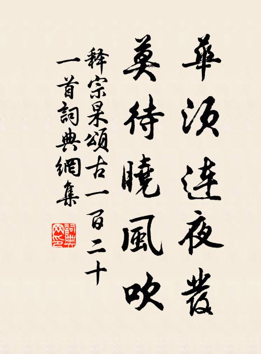 古詩文歷史字典書法欣賞書法字典國語詞典說文解字康熙字典古漢語字典華須連夜發,莫待曉風吹釋宗杲 《頌古一百二十一首》名句出處出自宋代釋宗杲的《頌古一百二十一首》全文:獨坐話誰知,青山對落暉。華須連夜發,莫待曉風吹。釋宗杲詩詞大全名句書法欣賞華須連夜發,莫待曉風吹書法作品釋宗杲名句,頌古一百二十一首名句名句推薦些兒妙處難窮李道純《沁園春》柳絮浮雲,有無根蒂,到底不磨真是非姚勉《沁園春(餞張倅)》返照從前事,行蹤過跡,翻作大讎隙王丹桂《月中仙 返照》好風朧月清明夜,碧砌紅軒刺史家。白居易《清明夜》屬君乍浮雲,要識浮雲意李新《有酒歌》游必蓬萊游,棲必昆倉棲利登《雜興》新觴曲引諸溪水,舊寺岩垂幾樹花徐渭《蘭亭次韻》十歲佩觿嬌稚子,八行飛札老成人元稹《贈嚴童子(嚴司空孫字照郎十歲能賦詩往往有奇句)》天馬周流不停策,青龍掛空山無色魏了翁《送游吏部赴召》向人忠信去表襮,可喜正在無機心黃庭堅《贈趙言》人間磊磊浮漚客,鸑鷟蜻蜓飛自隔陳陶《謫仙詞》無風絳雪自飄零李彌遜《浣溪沙》蠟屐清游,漁蓑淡話,富貴於予何有哉馮取洽《沁園春(用定軒雨余有感韻寫山中之趣)》讀書亦何為,謹勿累吾角方岳《出居十六詠飯牛庵》經勘松風燥,檐垂塢茗香貫休《題方公院寄夏侯明府》詩詞推薦偈頌九十三首釋梵琮〔宋代〕除夜無可分歲,爐中燒些木榾。臭煙沖著鼻孔,面熱忽然噴嚏。殘年鈍悶,到此消除。新歲佛法,從此吉利。錦石岩某子發〔宋代〕平昔曾聞錦水名,維舟特向此中行。只愁凡骨成仙去,寒卻當年泉石盟。漁父四時歌周必大〔宋代〕世人酒只詠江如酒練,此景酒何曾眼中酒見。露零月白人已眠,萬頃風光儂自占。尊鱸況復生計優,酒醒還醉餘何紹興祀岳鎮海瀆四十三首佚名〔宋代〕相予陰威,厥功浩浩。一歲之功,何以為報。府有珪幣,我其敢私。肅肅孔懷,於以將之。偈頌一百零一首釋慧性〔宋代〕松蘿影裹,積翠堆中。白云為蓋,流泉作琴。隻影獨標岩上月,不知那個是知音。耳卓朔,頭蓬忪,抬眸鷂子過遼喜遷鶯江漢〔宋代〕昇平無際。慶八載相業,君臣魚水。鎮撫風稜,調燮精神,合是聖朝房魏。鳳山政好,還被畫轂朱輪催起。按錦轡偈頌十八首釋師體〔宋代〕耳有重輪非差事,胸題卐字亦尋常。腰間不束三條篾,萬頃風煙一草堂。依韻寄呈林城山蒲壽宬〔宋代〕鄰蛩深夜語幽幽,猶此塵埃一敝裘。甘菊已荒歸栗里,蒲萄堪醉勝涼州。知心海上千年鶴,極目雲間五色樓。白髮宿村家亭子(一作宿杜司空東亭,或題杜司戶亭子)賈島〔唐代〕床頭枕是溪中石,井底泉通竹下池。宿客未眠過夜半,獨聞山雨到來時。偈頌一百四十一首釋師範〔宋代〕大惠老漢無端,隨後說難說易。拈得口兮失卻鼻。