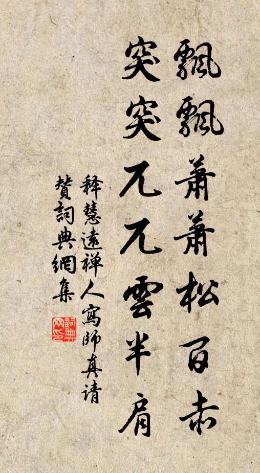 古詩文歷史字典書法欣賞書法字典國語詞典說文解字康熙字典古漢語字典飄飄蕭蕭松百赤,突突兀兀雲半肩釋慧遠 《禪人寫師真請贊》名句出處出自宋代釋慧遠的《禪人寫師真請贊》全文:飄飄蕭蕭松百赤,突突兀兀雲半肩。放□□□□□調,剛被時人喚作禪。釋慧遠詩詞大全名句書法欣賞飄飄蕭蕭松百赤,突突兀兀雲半肩書法作品釋慧遠名句,禪人寫師真請贊名句名句推薦況與故人別,那堪羈宦愁韓愈《秋字》蠹魚開卷落,啄木隔花聞貫休《故林偶作》看君灞陵去,匹馬成皋還岑參《送鄭堪歸東京汜水別業(得閒字)》正是黃梅青杏時,榴花開數枝吳潛《長相思》風吹天河銀浪高,月邊星宿相周遭方翥《次韻時瑞見寄》解驂舊事無人繼,慟哭窮塗祗自嘆楊冠卿《代秦幹上刑部張尚書》水闊風搖舟不定王自中《念奴嬌(題釣台)》百年幾會合,美酒不屢醺黃庭堅《和答魏道輔寄懷十首》門前不見歸軒至,城上愁看落日斜錢起《訪李卿不遇》陰成眾人息,於世豈非用韓維《和孫廷平坦嵩山十首古木陰》身世正如萍在水,略無根柢也能生陸游《秋雨不止排悶》含情少婦悲春草,多是良人學轉蓬佚名《雜曲歌辭。太和第三》吾儕磊塊胸,所見不相遠方岳《次韻方蒙仲高人亭》翳桑秋廩共,結草夜台春方岳《程伯茂尊公輓詩》向晚誰爭艷,防寒淺作紅宋祁《江南木芙蓉張子春雲其高如樹中山地寒才數尺》詩詞推薦浣溪沙·初夏夜飲歸陳繼儒〔明代〕桐樹花香月半明,棹歌歸去蟪蛄鳴。曲曲柳灣茅屋矮,掛魚罾。笑指吾廬何處是?一池荷葉小橋橫。燈火紙窗修竹稚川約晚過進叔次前韻贈稚川並呈進叔黃庭堅〔宋代〕人騎一馬鈍如蛙,行向城東小隱家。道上風埃迷皂白,堂前水竹湛清華。春歸河曲定寒食,公到江南應削瓜。樽酒句釋惠崇〔宋代〕鳥暝風沉角,天清月上旗。最高樓(客有敗棋者,代賦梅)辛棄疾〔宋代〕花知否,花一似何郎。又似沈東陽。瘦稜稜地天然白,冷清清地許多香。笑東君,還又向,北枝忙。著一陣、霎時寒食盧象〔唐代〕子推言避世,山火遂焚身。四海同寒食,千秋為一人。深冤何用道,峻跡古無鄰。魂魄山河氣,風雷御宇神。光煙秋夜吟長安中鬼〔唐代〕六街鼓歇行人絕,九衢茫茫室有月(吟)。九衢生人何勞勞,長安土盡槐根高(和)。瓶中淮陽紅牡丹落盡有嘆三首楊萬里〔宋代〕只愁風雨妒花枝,翦入瓷瓶養卻伊。更下重簾深閉合,忽然花落又關誰。憶昨陸游〔宋代〕當年落魄錦江邊,物外常多宿世緣。先主廟中逢市隱,丈人觀里識巢僊。和張伯常賀遷資政司馬光〔宋代〕坐飲太他猶自愧,謬躋秘殿益難安。願同野老嬉堯壞,長守先生苜蓿盤。送吳敘浦趙蕃〔宋代〕生年月日雖則同,學而聞道莫比蹤。學而聞道胡不庸,咎且不免寧論功。一官俯首蠻貊中,幾年積弊頻年凶。去奸