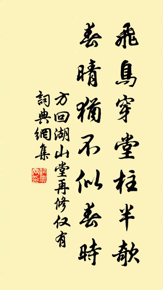 古詩文歷史字典書法欣賞書法字典國語詞典說文解字康熙字典古漢語字典飛鳥穿堂柱半欹,春晴猶不似春時方回 《湖山堂再修僅有》名句出處出自宋代方回的《湖山堂再修僅有》全文:飛鳥穿堂柱半欹,春晴猶不似春時。上樑文記臨邛魏,天目洪家卻立碑。方回詩詞大全名句書法欣賞飛鳥穿堂柱半欹,春晴猶不似春時書法作品方回名句,湖山堂再修僅有名句名句推薦一從臨邛游,心跡了不似晃沖之《戲李相如攜婦還金鄉》眾雀豈能知鵠志,一雞何足用牛刀仇遠《書與士瞻上人十首》如來在諸人眼裹耳裹,轉如是輪釋智朋《偈傾一百六十九首》飽舂白雪已歸市,晚割黃雲猶枕畦李彌遜《和學士秋懷一十五首》涇渭清濁流,不離海波瀾楊時《遺興》前冬發湖北,今日滯湘南胡寅《初至青湘聞安仁帥司為曹成所襲四首》騷人已得江山助,賦客終陪霰雪游楊億《許洞歸吳中》蛟老變為妖婦女,舶來多賣假珠璣元稹《送嶺南崔侍御》何處更容絲髮許,脫體無依誰會舉釋印肅《頌四賓主》山侶相逢少,清晨會水亭皎然《湯評事衡水亭會覺禪師》吾不識青天高,黃地厚李賀《苦晝短》春回隴首人千里,月到窗前夢五更葉茵《梅》回輿入鹹京,席捲六合通李白《流夜郎半道承恩放還,兼欣克復之美書懷示息秀才》從今但洗耳,水程報郵簽高斯得《次韻王秉純投贈三十韻》演法三千界,多聞第一流宋祁《寄藥山長老省賢》詩詞推薦鄰水延福寺早行陸游〔宋代〕化蝶方酣枕,聞雞又著鞭。亂山徐吐日,積水遠生煙。淹泊真衰矣,登臨獨惘然。桃花應笑客,無酒到愁邊。廢桑畦種花姜特立〔宋代〕種花真護落,曾不救號寒。我自金芍藥,從渠黑牡丹。美人圖唐寅〔明代〕舞罷霓裳日色低,滿身春倦眼迷離。錦絲步帳繁花里,閒弄珊瑚血色枝。論語絕句一百首張九成〔宋代〕點爾何如鼓瑟希,舞雩之下詠而歸。喟然不覺令吾嘆,豈與其他較是非。王風·揚之水佚名〔先秦〕揚之水,不流束薪。彼其之子,不與我戍申。懷哉懷哉,曷月予還歸哉?揚之水,不流束楚。彼其之子,不與我戍贈畫梅呂生樓鑰〔宋代〕西湖處士賦疎影,未似希真好樂章。豈是無情甘澹泊,受它風月幾淒涼。食檳榔蘇軾〔宋代〕月照無枝林,夜棟立萬礎。眇眇雲間扇,蔭此九月暑。上有垂房子,下繞絳刺御。風欺紫鳳卵,雨暗蒼龍乳。裂包張氏館中早作陳著〔宋代〕小窗一榻清於水,親戚相看話久暌。困帶詩情投角枕,夢隨梅伴策霜藜。鄰家落杵催樵爨,山寺分鐘撼竹棲。犯冷人事徐夤〔唐代〕人事飄如一炷煙,且須求佛與求仙。豐年甲子春無雨,良夜庚申夏足眠。顏氏豈嫌瓢里飲,孟光非取鏡中妍。平生偈頌二十首釋如珙〔宋代〕山中滋味別,往往少人知。野菜合黃獨,能充白日飢。風輕翻草葉,猿重墜藤枝。餘生只寄此,閒讀古人詩。