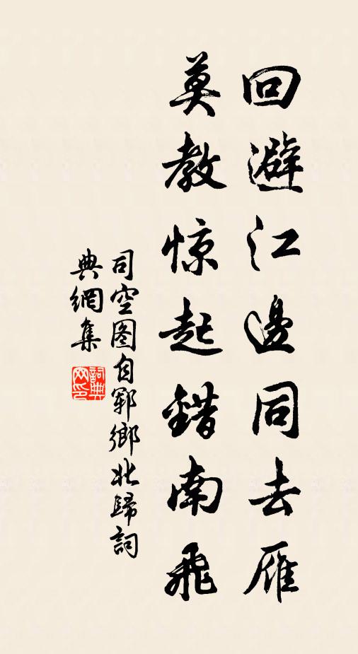 古詩文歷史字典書法欣賞書法字典國語詞典說文解字康熙字典古漢語字典迴避江邊同去雁,莫教驚起錯南飛司空圖 《自鄆鄉北歸》名句出處出自唐代司空圖的《自鄆鄉北歸》全文:巴煙冪冪久縈恨,楚柳綿綿今送歸。迴避江邊同去雁,莫教驚起錯南飛。司空圖詩詞大全名句書法欣賞迴避江邊同去雁,莫教驚起錯南飛書法作品司空圖名句,自鄆鄉北歸名句名句推薦何人採得扶桑椹,搗就藍橋碧紺霜程珌《鷓鴣天》雲物高秋節,山川孤客情錢起《早下江寧》蕭條依掾吏謝朓《始之宣城郡詩》掌心托個儒人苗劉澗谷《西江月(賀人女晬)》對飲伴明月,故人念疇昔晁說之《題邵武軍泰寧縣葉恪循道清風樓》一馬立長衢,顧影方徘徊王安石《兩馬齒俱壯》白鳥背人去,青簾明眼來李流謙《次趙惟直韻》古甃磨翠壁,霜林散煙鬟蘇軾《南都妙峰亭》瀟湘路杳然,清興起秋前鄭巢《送李式》罷吏童僕去,灑掃或自專姚合《新居秋夕寄李廓》關塞猶傳箭,江湖莫繫船李商隱《懷求古翁》巧裁蟬鬢畏風吹,盡作蛾眉恐人妒。樊晃《句》上掌真何有,傾城豈自由李商隱《擬意》我觀松柏竹,青青黃落後方回《上南行十二首》芍藥擁芳蹊,未放春歸去洪适《生查子》詩詞推薦樓上曲陳襄〔宋代〕金徒抱箭寒更起,寂寞孤成一千里。姮娥擎出月華來,白玉樓台瑩如水。上有佳人紅粉汝,妙年學得吹霓裳。呼兒石塘感舊十絕劉克莊〔宋代〕光霽丰標今寂滅,靈明根性詎消磨。夜來一段佳風月,不見堯夫只見窩。游同泰寺與伍仲文聯句蘇曼殊〔近現代〕赫赫同泰寺,妻妻玄武湖。(曼殊)紅蓮冒污澤,綠蓋掩青苑。(仲文)幕府林蔥蒨,鐘山路盤紆。(曼殊) 蒼白髮白居易〔唐代〕白髮生來三十年,而今須鬢盡皤然。歌吟終日如狂叟,衰疾多時似瘦仙。八戒夜持香火印,三元朝念蕊珠篇。其餘臘雪五首蘇轍〔宋代〕雪霜何與我,憂思自傷神。忠信亦何罪,才名空誤身。歸來聊且止,老去莫逢嗔。樽酒它年事,相看醉此晨。游叔虞祠張伯玉〔宋代〕廟中桐葉手中文,閒讀高碑拂素塵。異隴歸禾曾是主,徒林射兕獨留神。關河莫問周秦事,花木誰分漢魏春。惟有次韻溫伯種蘭范成大〔宋代〕靈均墮荒寒,采采紉蘭手。九畹不留客,高丘一回首。崢嶸路孔棘,悽愴肘生柳。遂令此粲者,永與窮愁友。不如次韻黃侍郎海棠花下怯黃昏七絕魏了翁〔宋代〕臨川數落花,康節愛花謝。若作榮悴觀,此特花之下。春思韋應物〔唐代〕野花如雪繞江城,坐見年芳憶帝京。閶闔曉開凝碧樹,曾陪鴛鷺聽流鶯。次韻練定公權垂訪樂圃之什朱長文〔唐代〕隱圃甚蕭條,驅車豈憚勞。境從前代勝,岡封遠山高。林曉猿抽臂,池秋鶴浴毛。興來頻就醉,奇句仆離騷。