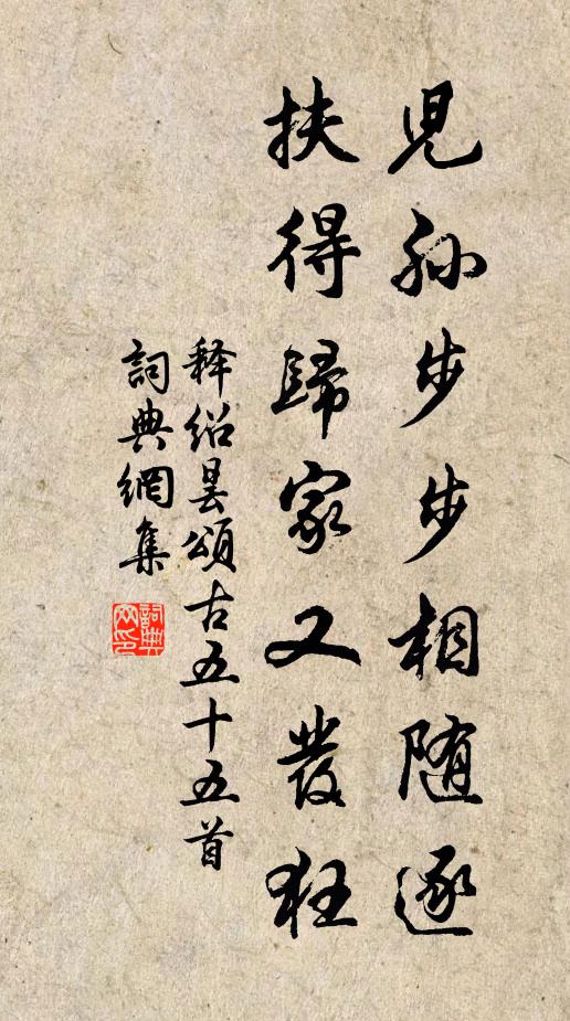 古詩文歷史字典書法欣賞書法字典國語詞典說文解字康熙字典古漢語字典兒孫步步相隨逐,扶得歸家又發狂釋紹曇 《頌古五十五首》名句出處出自宋代釋紹曇的《頌古五十五首》全文:田庫翁翁兩鬢霜,苦貧濁酒弄觥觴。兒孫步步相隨逐,扶得歸家又發狂。名句書法欣賞兒孫步步相隨逐,扶得歸家又發狂書法作品釋紹曇名句,頌古五十五首名句名句推薦幽林穿蒙籠,青峰上險峭孔武仲《送劉明復知鳳翔二首》少日朋儕隨化盡,晚塗老病有誰摟徐瑞《月灣以路學正攝番江長收租長洲有懷朽純賦詩》愛鸚鵡、垂簾語元好問《青玉案 代贈欽叔所親樂府鄆生》胡為緘笑語,深念不思身鮑溶《春日言懷》向晚化污積,群飛來戶庭梅堯臣《蚊》絕景坐嗟清燕隔,一籃朱白尉旋歸韓維《對雪送花走筆況之》當時玉汞涓涓生,奔歸元海如雷聲呂岩《贈喬二郎》綠荷美影蔭龜魚趙長卿《西江月》丈人宦意靜如山,五十朱衣鬢未斑強至《寄秦粹呂四丈職方淵》豈識主人非崛強,一川生意索褰幃魏了翁《春社日祀事既畢轎中得三絕》涇溪石險人競懼,終歲不聞傾覆人羅隱《涇溪》太極翁何在,花時愛敢忘吳錫疇《新荷》龍門賓友散,揮涕想遺塵蘇頌《侍讀給事王公輓辭三首》幾樹杏花殘了吳潛《如夢令》君行斷音信,妾恨無終極陳造《望夫山》詩詞推薦題翠波亭朱翌〔宋代〕天垂疊巘翠相交,風展文漪碧半篙。勝日難逢宜樂此,好山多買不為饕。了無嘆息同登峴,忽有會心如有濠。更看郡齋鶴飛來作三詩還之陳造〔宋代〕不知蝸舍安卑陋,何似侯家效羽儀。千字罷賡明遠賦,一詩聊送佐卿歸。金陵雜興二百首蘇泂〔宋代〕城西二里楚金陵,吳帝名為石首城。如今土塢無青草,笑殺當時所必爭。薙庭草陸游〔宋代〕露草煙蕪與砌平,群蛙得意亂疏更。微涼要作安眠地,放散今宵鼓吹聲。寒城晚角(滑州作)朱灣〔唐代〕高台高高畫角雄,五更初發寒城中。寒城北臨大河水,淇門賊烽隔岸是。長風送過黎陽川,我軍氣雄賊心死。羈人謝王彥光提刑見訪並送茶陸游〔宋代〕邇英帷幄舊儒臣,肯顧荒山野水濱。不怕客嘲輕薄尹,要令我識老成人。颿回鼓轉東城暮,酒冽橙香一笑新。遙想晚興張鎡〔宋代〕江漢舊名侯,飄蕭發未秋。時榮那似此,天地入詩游。寄秦州幕明化基寺丞范仲淹〔宋代〕同時辟命新,中道改絲綸。滄海人歸楚,清風子在秦。共居卿月下,獨得將星鄰。聳動軍前檄,崢嶸席上珍。烽煙次韻胡彥明同年羇旅京師寄李子飛三章一章道黃庭堅〔宋代〕丁未同升鄉里賢,別離寒暑未推遷。蕭條羈旅深窮巷,蚤晚聲名上細氈。碧嶂清江原有宅,白魚黃雀不論錢。檳榔奉酬臞菴李侍郎白玉蟾〔宋代〕全是山林居士風,不知位重更官穹。名書玉幾金甌內,心在 * 紙帳中。