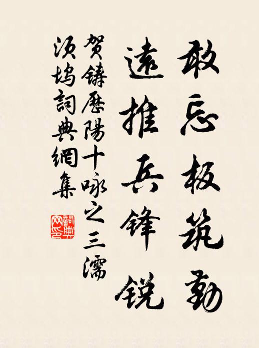 古詩文歷史字典書法欣賞書法字典國語詞典說文解字康熙字典古漢語字典敢忘板築勤,遠推兵鋒銳賀鑄 《歷陽十詠之三濡須塢》名句出處出自宋代賀鑄的《歷陽十詠之三濡須塢》全文:孫郎昔鷹揚,曹瞞方虎視。敢忘板築勤,遠推兵鋒銳。俄聞青蓋謠,無復金陵氣。六代迭傾亡,長江亦平地。名句書法欣賞敢忘板築勤,遠推兵鋒銳書法作品賀鑄名句,歷陽十詠之三濡須塢名句名句推薦交飛梅徑妝才半,舞對鸞台影自雙李洪《立春前一日再雪因用韻》山頭寶叔成新塔,泉下應貽父母憂錢時《千頃廨院小憩老僧舊爇左臂乾緣寶叔塔一絕憫》此中宜五穀,不及西陽城元結《漫歌八曲西陽城》電影流機石,鴉群發大黃楊億《鹹平六年二月十八日扈從宸游因成紀事二十二》蕭梁賜額各猶在,石塔藏碑字尚留周振《獲國寺》直到千古醉者心,名利莫可污其埃黃庶《送元伯西歸》老大於節物,真成風馬牛李處權《元夕陪張使君燕集》尋詩已約蘭陵令張炎《漁家傲(病中未及過毗陵)》我家千樹足奇花,晚得此花尤傑出吳芾《詠梅棠》山勢抱幽谷,谷泉含石泓歐陽修《幽谷晚飲》漫紅披杏帶,短碧上蒲芽宋祁《舟中三首》今年葉底已藏花,來歲還抽後歲芽姜特立《感物》始作想澄清,歊暑不敢毒李流謙《送劉文潛司業江西漕二首》褦襶京塵觸熱行,豈知世有野堂清陸游《十五日雲陰涼尤甚再賦長句》棋局聊相對,茶爐亦自攜陸游《幽棲》詩詞推薦戌婦詞宋慶之〔宋代〕君去無還期,半思無已時。軍中無女子,誰為補征衣。或傳雲中危,夫死賢王圍。恐傷老姑心,有淚不敢垂。初歸筠莊蘇粹之以詩見貽次韻答之二首李彌遜〔宋代〕它年同上楚江樓,花繞春城小謝州。翻手雨雲人事改,跳丸日月歲光流。霜空暮落能鳴雁,秋水風移不擊舟。偶築寄空同山中道士曾幾〔宋代〕昨夜清霜重,念此山中客。落葉聚堆床,暗蟲吟敗壁。泬漻天宇肅,疏林風瑟瑟。曳杖掛詩瓢,悠然適所適。息心道上見梅花陸游〔宋代〕載酒房湖風日美,探梅喜折一枝新。今朝忽向街頭見,萬萼千跗俗卻春。寒食宴城北山池,即故郡守榮陽鄭鋼目為折柳亭羊士諤〔唐代〕別館青山郭,遊人折柳行。落花經上巳,細雨帶清明。鶗鴂流芳暗,鴛鴦曲水平。歸心何處醉,寶瑟有餘聲。曹娥廟胡仲弓〔宋代〕黃絹碑殘香草生,當時淚眼不曾晴。至今流水聲嗚咽,猶是曹娥哀怨聲。月夜獨坐連文鳳〔宋代〕坐久不聞人語喧,風枝吹動宿禽翻。幾家負卻三更月,未到鐘聲已閉門。立春日,病中邀安國,仍誧率禹功同來。仆雖蘇軾〔宋代〕齋居臥病禁菸前,辜負名花已一年。此日使君不強喜,早春風物為誰妍。青衫公子家千里,白髮先生杖百錢。曷不題新澗亭兼酬寄朝中親故見贈白居易〔唐代〕何處披襟風快哉,一亭臨澗四門開。金章紫綬辭腰去,白石清泉就眼來。自得所宜還獨樂,各行其志莫相咳。禽魚宿寧庵聞溪聲王柏〔宋代〕清溪瀉出瀑泉鳴,記得昌黎語不平。要識中流多峙柱,故能千古振英聲。