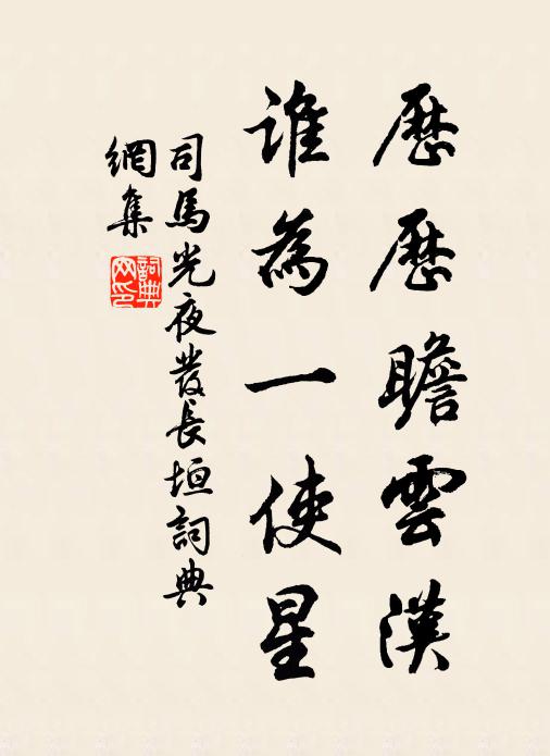 古詩文歷史字典書法欣賞書法字典國語詞典說文解字康熙字典古漢語字典歷歷瞻雲漢,誰為一使星司馬光 《夜髮長垣》名句出處出自宋代司馬光的《夜髮長垣》全文:長塗暑氣劇,永日臥郵亭。書伏如牆鼠,宵行似野螢。歇鞍沙月白,拂面柳風醒。歷歷瞻雲漢,誰為一使星。司馬光詩詞大全名句書法欣賞歷歷瞻雲漢,誰為一使星書法作品司馬光名句,夜髮長垣名句名句推薦難以荷負正宗,臨濟佛法到此平沈釋如珙《天目和尚贊》天應不許人全見,長把雲藏一半來孫魴《湖上望廬山》誰分修藏力,頂有剃頭霜貫休《題方公院寄夏侯明府》停駕言其將邁兮,遂援翰而寫心向秀《思舊賦》何人柳外橫雙笛,客耳那堪不忍聞辛棄疾《鷓鴣天》我病胃寒不下咽,匕籌謾舉叨席中梅堯臣《張聖民學士出御書並法帖共閱之》國於羊角九萬里,奄有九霄寒露之空濛項安世《高風台歌》上塘歌了下塘唱,更唱吳王與越王汪元量《越州歌二十首》搖風開細浪,出沼媚清晨賈謨《賦得芙蓉出水》有所思兮天一涯,彼美人兮安得知曹勛《有所思二首》幾年榛棘蔽鼪鼯,一朝絕境從中出樓鑰《寄題台州倅廳雲壑》萱堂有秋花,對客如勸侑孔武仲《寄題經父萱堂》江邊數杯酒,海內一孤舟賈至《送陸協律赴端州》異僧留塔在,過客入城稀劉克莊《全州》友弟俱遊宦,池樊自摭莎黃晞《寄李先生》詩詞推薦祭端明尤木石釋善珍〔宋代〕昔大慧師,道鳴東南。率先伏膺,橫浦紫岩。繇是遍交,渡江諸老。鉤黨牽連,優遊嶺島。至今微言,皎若日星。和湯倅春雪虞儔〔宋代〕雪瑞元來竟不空,豐年訊息喜潛通。故憐梅老扶衰白,未放桃夭嫁小紅。夜動檐花猶帶雨,晴看隴麥待搖風。強顏和五十四翁登恩第後贈楊君章范祖禹〔宋代〕力穡良農晚歲收,英名初喜動凝旒。光如劍氣斗間沒,文似河源天上流。莫嘆黃金才易箒,安知布被不封侯。暮年甘州(為小玉梅賦,並柬韓竹閒)張炎〔宋代〕見梅花、斜倚竹籬邊。休道北枝寒。□□□翠袖,情隨眼盼,愁接眉彎。一串歌珠清潤,綰結玉連環。蘇小無尋處江行陳維崧〔清代〕江流只向台城打,閱江樓上人非也。對此正茫茫,煙波空斷腸。布帆搖鐵鹿,碾破長江綠。回首望台城,依稀橫吹三婦詩權德輿〔唐代〕大婦刺繡文,中婦縫羅裙。小婦無所作,嬌歌遏行雲。丈人且安坐,金爐香正薰。長思仙侯善淵〔元代〕出家人。要求真。遍計長空絕點塵。明知虛穀神。日為鄰。月為親。天地之中轉法身。方知物外人。獻薛僕射秦系〔唐代〕由來那敢議輕肥,散發行歌自採薇。逋客未能忘野興,辟書翻遣脫荷衣。家中匹婦空相笑,池上群鷗盡欲飛。更乞寄陸大夫劉宰〔宋代〕寄語金淵陸大夫,歸田相府竟何如。提兵劫取已非矣,縱火燒殘豈義歟。百口喪身端自爾,千錢酬直殆營平。君行菩薩蠻(題蓮花庵)呂勝己〔宋代〕嶺猿嘯罷千山碧。小庵虛室團團白。庵在小山頭。從來少客游。道人方打坐。舉袖來迎我。問我此來因。拈花與道
