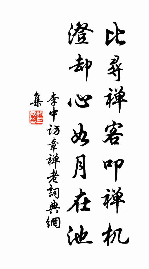 古詩文歷史字典書法欣賞書法字典國語詞典說文解字康熙字典古漢語字典比尋禪客叩禪機,澄卻心如月在池李中 《訪章禪老》名句出處出自唐代李中的《訪章禪老》全文:比尋禪客叩禪機,澄卻心如月在池。松下偶然醒一夢,卻成無語問吾師。李中詩詞大全名句書法欣賞比尋禪客叩禪機,澄卻心如月在池書法作品李中名句,訪章禪老名句名句推薦六月火雲高偃蹇,使君有意憐焦卷范成大《知郡檢計齋醮禱雨,登時感通,輒賦古風,以》孤帆或不見,棹歌猶想像薛據《西陵口觀海》惠人鄭之僑,始亦遭怨詈杜范《送石宰》空落得忘餐廢寢,怎能夠並枕同衾?院落沉沉,無限相思,付與瑤琴丘士元《【雙調】折桂令 秋晚》意有空門樂,居無甲第奢李嘉祐《奉和杜相公長興新宅即事呈元相公》地誌只稱王長官,有功於民蓋一揆王應麟《吳刺史廟》不惜黃金為彈子,牡丹花下打黃鸝釋普度《偈頌一百二十三首》恢論或申旦,隱几忘移晡潘興嗣《逍遙亭》山林亦是吾君賜,日望官軍盪白河釋行海《癸酉春僑居無為寺歸雲閣以十五遊方今五十為》端居得至樂,生世豈不逢陸游《冬夜讀書甚樂偶作短歌》念人生如夢,世事無涯,空汩沒、爭似吾家拂袖王丹桂《洞仙歌 九日》神仙疑是丹丘子,年紀高於絳縣人劉克莊《自和效顰一首》梁有湯惠休,常從鮑照游李白《贈僧行融》溪山多勝事,詩酒辨清游曾覿《水調歌頭(書懷)》樂哉此遠俗,亂世免怵迫陳與義《開壁置窗命曰遠軒》詩詞推薦憶南中兄弟鄭獬〔宋代〕河上青青榆葉稀,湘童何日報南歸。可嗟不及衡陽雁,兄弟相將作隊飛。漳州送王益統制謫歸時方收峒寇徐璣〔宋代〕京口丘都督,江淮第一人。竭心安宋代,決策斬蘇囂。猛將親經選,高材近莫倫。六鈞來有力,一騎去無塵。塞靜送祖達侍者釋普濟〔宋代〕呼喚不曾離左右,大都相見一番難。攢眉切齒歸來日,痛罵國師南北山。過華清內廄門李商隱〔唐代〕華清別館閉黃昏,碧草悠悠內廄門。自是明時不巡幸,至今青海有龍孫。送辛都官知鄂州梅堯臣〔宋代〕衣上大梁雪,門前武昌車。使君行有期,將逢鳥隼旟。車動自轣轆,旟輕自舒舒。去都越千里,城在江上居。黃鶴縣齋秋懷程公許〔宋代〕學仙宗無為,學禪空萬緣。自昔抱奇志,師心為真傳。失腳墮世納,芘事幾充捐。惟有一念息,不受物慾牽。空花兀兀棲精廬劉黻〔宋代〕兀兀棲精廬,青山日相對。靜照年少非,動虞壯士悔。耕鋤計已晚,畚築力猶耐。夜臥司馬衾,晨餐魯直菜。自計解梅嘲舒岳祥〔宋代〕昨夜鵂鶹聲婉孌,斗覺春隨呼喚轉。今朝檢歷知立春,屋角梅花笑初囅。向人帶笑復含嗔,嗔我今為異代民。我語齊天樂(甲戌湘憲種德堂燈屏)文天祥〔宋代〕夜來早得東風信,瀟湘一川新綠,柳色含晴,梅心沁暖,春淺千花如束。銀蟬乍浴。正沙雁將還,海鰲初矗。雲擁蔡州任氏閱世堂蘇轍〔宋代〕朱君長桐鄉,死食桐鄉社。吏民安君德,君亦愛其下。遺言於斯葬,存沒勿相舍。自知得民深,千歲誰似者。任君
