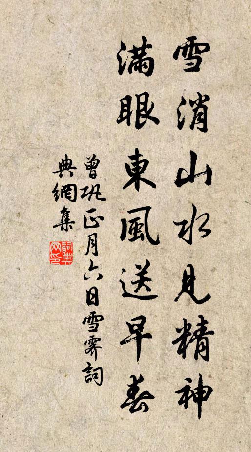 古詩文歷史字典書法欣賞書法字典國語詞典說文解字康熙字典古漢語字典雪消山水見精神,滿眼東風送早春曾鞏 《正月六日雪霽》名句出處出自宋代曾鞏的《正月六日雪霽》全文:雪消山水見精神,滿眼東風送早春。明日杏園應爛熳,但須期約看花人。曾鞏詩詞大全名句書法欣賞雪消山水見精神,滿眼東風送早春書法作品曾鞏名句,正月六日雪霽名句名句推薦旄頭欃槍銳衝擊,殺氣隆隆半天黑劉過《呈陳總領五首》學子今翻辭使旆,歸來只得片碑看衛涇《別吳荊溪》典刑付託呼所鍾,經國風規儼如故蘇籀《送范比部持節廣東》世態便如翻覆雨,妾身元是分明月。文天祥《滿江紅·和王夫人滿江紅韻以庶幾後山妾薄命之意》身死聲名在,多應萬古傳賈島《哭孟郊》危陟據隄阜,遐眺窮灣圻方回《春江多大風》皇家基業天與隆,金枝玉葉槃石宗樓鑰《代求子紹上魏邸壽詩》飛英時落杯,草木吾臭味胡寅《周尉不來用單令韻見寄和之》其父得以免曹植《精微篇》裘新青兔褐,褥軟白猿皮白居易《所懷》劍水一泓清澈底,至今人說有龍居張蘊《虎丘》舊客常樂坊,井泉濁而鹹姚合《新昌里》既摧棲日乾,未展擎天力孟郊《衰松》醇熟不足計,醒醉亦自籌孫嵩《冬初雜興》野色似雲閒放犢,樹陰如幄暗巢鴉趙蕃《三月十七日以檄出行賑貸旬日而復反自州門至》詩詞推薦三月十四夜觀月思南湖張鎡〔宋代〕期會紛然不到詩,拙哉前計只心知。縱當吏散庭空後,爭似山行水泛時。柳影半籠明處路,葦聲輕窣暗邊籬。波神寄德瑩弟二首王炎〔宋代〕洞庭秋水望中天,側目飛鴻斷復連。得句信知神入夢,澆愁不慣酒中仙。秋風白髮欺來日,夜雨青燈憶往年。用拙四言贈兄秀才入軍詩 其二嵇康〔兩漢〕鴛鴦于飛。嘯侶命儔。朝游高原。夕宿中洲。交頸振翼。容與清流。咀嚼蘭蕙。俛仰優遊。復熱汪炎昶〔宋代〕昨暮北窗雨,未產欹枕聲。今晨東郊日,依作□炎□。神龍伏窟宅,獨忍遺吾民。卻恐空山雷,散入飢腸鳴。皇天聞叔易隱居被詔晁說之〔宋代〕東海一生垂釣客,石渠萬卷校書郎。丈人風味今如此,鶴到揚州興更長。泊曹家沙董嗣杲〔宋代〕行沙回望岸南頭,疊疊層層雪積稠。民社一同猶是寄,故應羈跡此生浮。浣溪沙向子諲〔宋代〕一夜涼颸動碧廚。曉庭飛雨濺真珠。玉人睡起倚金鋪。雲髻作堆初未整,柳腰如醉不勝扶。天仙風調世間無。驀山溪王哲〔元代〕玉堂三老。唯識王三操。復許辨三台,更能潤、三田倚靠。自然三耀,攢聚氣精神運三車,依三教,永沒沈三道。鷓鴣天(題廣文官舍竹外梅花呈萬教)盧炳〔宋代〕閣雨浮雲寒尚輕。商量雪意未全成。莫嫌竹外蕭然處,忽有幽香透鼻清。詩興逸,酒魂醒。主人留客更多情。不辭次趙景文絕糧陳著〔宋代〕赤嶠歸來似夢中,春風滿面掃儒窮。只愁不祭鬼成餒,那問乏供兒哭空。飢臥何妨專雪屋,清貧消得喚冰翁。浮生
