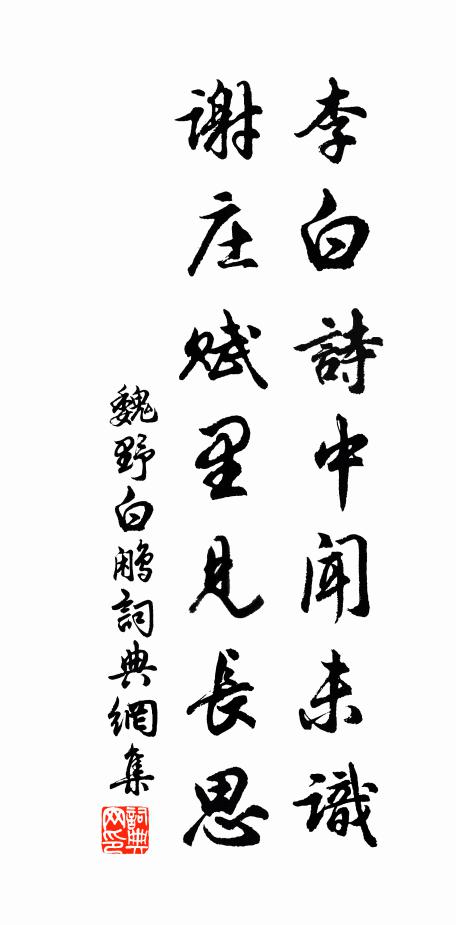 古詩文歷史字典書法欣賞書法字典國語詞典說文解字康熙字典古漢語字典李白詩中聞未識,謝莊賦里見長思魏野 《白鷳》名句出處出自宋代魏野的《白鷳》全文:李白詩中聞未識,謝莊賦里見長思。今朝得爾心雖喜,致謝慚無吐鳳詩。魏野詩詞大全名句書法欣賞李白詩中聞未識,謝莊賦里見長思書法作品魏野名句,白鷳名句名句推薦況此甲馬動,憂端宿肝脾馮時行《見雪》劫石固來猶可壞,滄溟深處立須乾釋重顯《頌一百則》漢都南鄭啟炎圖,秦置石牛山徑闢樓鑰《送王仲矜倅興元》小山叢桂圖經古,白馬驪駒道路榮楊億《史館陳太丞知壽州》此時寄語惡長官,勿遣追胥駭僮僕馮時行《題楊氏清福亭》勿言行路惡,有志戀家難戴復古《送曉山夏肯甫入京》小園幽事,中都風味,鬥草分香依舊趙彥端《鵲橋仙(正月二十三日秀野堂作)》前朝吟會散,故國講流終李洞《敘事寄薦福棲白(一作聽白公話舊)》本朝求治切,大府課功頻黃彥平《胡帥見和用韻再寄》被人間識破,惹起虛名,驚宇宙,一笑天高月小滕賓《洞仙歌 送張宗師捧香》但見盈城盈野,誰能去食去兵劉克莊《得江西報六言十首》一探寂滅宗,一透船汞關劉黻《和此陽先生感興詩二十首》城荒披綠莎,青青透槹閒樓鑰《趙資政當山堂》自古男兒,可人心事,惆悵要離招不回陳人傑《沁園春(吳門懷古)》不然何故狂吟詠,病後多於未病時白居易《病中詩十五首。自解》詩詞推薦秋日登吳公台上寺遠眺劉長卿〔唐代〕古台搖落後,秋日望鄉心。野寺來人少,雲端隔水深。夕陽依舊壘,寒磬滿空林。惆悵南朝事,長江獨自今。局中春興陸游〔宋代〕天知病眼困風沙,借與蓬山閱物華。微暖已迎新到燕,輕陰猶護欲殘花。幽窗寂寂書圍座,倦枕時時夢過家。立馬舟中錢舜選〔宋代〕一舸乘風便,飄然疾似梭。水鄉秋雨足,茅舍夕陽多。野色傷衰草,湖聲泣敗荷。亂鴉歸宿處,人唱牧牛歌。和李天麟秋懷五絕句楊萬里〔宋代〕小立南溪暮未還,略容老子照哀顏。頗驚瞑色來天外,未必秋聲在樹間。任仲微閱世亭張耒〔宋代〕志士抱奇策,常苦不得伸。及其利害出,倏已亡其人。今古同此恨,愚智竟誰分。哀哉老任公,英魄久已淪。惟余正月十五日與兄弟清坐燈下不飲取黃精荔子甘李彌遜〔宋代〕滿床緗帙照清燈,碧眼相看老弟兄。不見柳枝羅酒脯,旋燒榾柮煮黃精。六州歌頭 戊申歲,一春強半風雨,不可出戶邵亨貞〔元代〕雨中望粼牆桃花,殆欲零落,感人事之不齊,歡芳時之易失,信筆紀述,斐然成章。桓司馬謂樹獨如此,人何以堪華陽洞天崔敦禮〔宋代〕雲冥冥兮疊嶂,君獨立兮山之上。石嶝險兮水道寒,思夫君兮未敢言。無言兮皇皇,山阿之人兮告我以不難。木樛入塞王安石〔宋代〕荒雲涼雨水悠悠,鞍馬東西鼓次休。尚有燕人數行淚,回身卻望塞南流!宴玉津園江樓七首任希夷〔宋代〕虛齋留御榻,小徑近層岩。再拜觀奎畫,渾疑侍玉階。