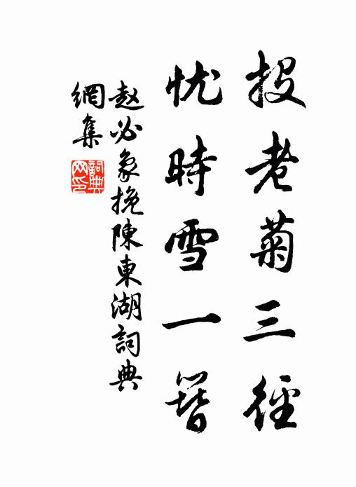 古詩文歷史字典書法欣賞書法字典國語詞典說文解字康熙字典古漢語字典投老菊三徑,憂時雪一簪趙必象 《挽陳東湖》名句出處出自宋代趙必象的《挽陳東湖》全文:邯鄲法夢覺,歸臥讀書林。投老菊三徑,憂時雪一簪。魚安知我樂,鷗自識翁心。已矣鍾期死,眼前誰嘗音。趙必象詩詞大全名句書法欣賞投老菊三徑,憂時雪一簪書法作品趙必象名句,挽陳東湖名句名句推薦佳人休唱好因緣葉夢得《浣溪沙(送盧倅)》甲子謠言未足聽,沛然甘澤以時行杜范《春雨甲子而潤澤不違時夏已更秋方慮乾涸一夕》豈惟如是說,實亦造佳處曾幾《讀呂居仁舊詩有懷其人作詩寄之》何處雲山君待我,更煩先寄彩雲歌晁說之《流寓海陵半年忽得周元仲分寧書欣慰與常日不》靜陳玉檻連琴榻,密映珠簾對酒壺徐鉉《奉和御製棋二首》平時欣侍從庾信《和從駕登雲居寺塔詩》閉眼歸默存,助發梨棗春陳與義《陪諸公登南樓啜新茶家弟出建除體詩諸公既和》只雪明朝日,山河坐可分司馬光《雪霽登普賢閣》飢鶩貪魚沒,高鴻望渚遵宋庠《淮上》會看木人牽鋸,始令石女穿針釋印肅《三昧諸頌》何事明時泣玉頻,長安不見杏園春紀唐夫《送溫庭筠尉方城》惟有寄情芳草,依舊萋萋毛並《風流子》尾短更兼須又禿,強將他鬭不擔財賈似道《鬭法八條》吟喔翠微裹,縹緲如翔鵠許沆《題君祥北岩》夢回非想天中界,身是無懷國裹官洪咨夔《西龍道院》詩詞推薦題河州赤岸橋呂溫〔唐代〕左南橋上見河州,遺老相依赤岸頭。匝塞歌鐘受恩者,誰憐被發哭東流。偶書三首張耒〔宋代〕周郎戰處滄江回,魚龍盪潏山石摧。荊州艨艟莫舉楫,走君不勞一炬灰。當年雄豪誰復在,喬木荒煙忽千載。蘄州半月泉蘇軾、曹輔、劉季孫、鮑朝懋、鄭嘉會蘇軾〔宋代〕請得一日假,來游半月泉。何人施大手,擘破水中天。宿州范成大〔宋代〕狐鳴鬼嘯夜茫茫,元是官軍舊戰場。土伯不能藏碧磷,三三兩兩照前岡。惜分飛毛滂〔宋代〕恰則心頭托托地。放下了日多縈系。別恨還容易。袖痕猶有年時淚。滿滿頻斟乞求醉。且要時閒忘記。明日劉郎起和子召見寄李洪〔宋代〕獨泛滄浪一釣舟,未償尋壑與經邱。霜清叵怯吳江冷,酒賤難從越女留。游鹿台荒人既往,采香逕遠宿須投。客游襄武館游眺韋應物〔唐代〕州民知禮讓,訟簡得遨遊。高亭憑古地,山川當暮秋。是時粳稻熟,西望盡田疇。仰恩慚政拙,念勞喜歲收。澹泊次韻淨照方岳〔宋代〕一筇一衲出山相,不道斯人故可人。我已久聞揮翰手,師寧相對坐禪身。山林有味青燈古,天地無情白髮新。認取詠史下蜀先主陳普〔宋代〕養虎荊州歲欲闌,一家豚犬不勝安。振振公族麟之角,妄作山林猛獸看。送郡守張宗丞蕭元之〔宋代〕本是詩書種,躬耕寂寞濱。傾家市鞍馬,捐命犯風塵。幕府差功級,京華困旅貧。不如歸去好,依舊號詩人。