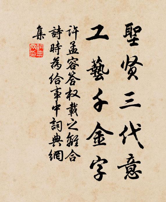 古詩文歷史字典書法欣賞書法字典國語詞典說文解字康熙字典古漢語字典聖賢三代意,工藝千金字許孟容 《答權載之離合詩(時為給事中)》名句出處出自唐代許孟容的《答權載之離合詩(時為給事中)》全文:史才司秘府,文哲今超古。亦有擅風騷,七聯文墨曹。聖賢三代意,工藝千金字。化識從臣謠,人推仙閣吏。如登昆閬時,口誦靈真詞。孫簡下威鳳,系霜瓊玉枝。許孟容詩詞大全名句書法欣賞聖賢三代意,工藝千金字書法作品許孟容名句,答權載之離合詩(時為給事中)名句名句推薦無事將心寄柳條,等閒書字滿芭蕉李益《逢歸信偶寄》歸見城中人,揣我將何求王洋《陪徐狄二子出東郊即事》花引歸西竺,萱疑在北堂劉克莊《挽程孺人》陰陽變態足纖巧,分得余妍歸畫史仇遠《草蟲圖》忽作故都禾黍恨,洛陽宮殿鎖千秋周彥夫《丁酉經由三高亭再和》早晚平狼望,同來舉壽觴司馬光《和潞公游天章楚諫議園宅》駕言尋舊好,款款到蘆灣鄭蘭《過桂氏湖莊》老不求名,心惟耽靜,舊緣歷過艱難曹勛《滿庭芳》涅槃羽化憑仙佛,為想歸途盡渺茫張問陶《觀我四首 死》江流總遺淚,何止失吞吳文天祥《自嘆》明發疾呼予,開枰數反覆危稹《王架閣夙有棋癖嘗於和篇中譏其不工架閣頗諱》睢睢而盱盱,而誰與居?大白若辱,盛德若不足。列子及其弟子《列子·黃帝》東觀詩成號良史,中台官罷揖高名姚合《奉和前司封蘇郎中喜嚴常侍蕭給事見訪驚斑鬢之什》試追健筆以何似,倒策駑駘上石巒李彌遜《次韻才子曹溪道中》今朝解了公家事,盡聽轅門報酉時樂雷發《訪趙愚齋不遇謁者雲入幕抵晚方歸因成一絕奉》詩詞推薦池州九日,用杜牧之齊山韻范成大〔宋代〕年年佳節歌式微,秋浦片帆還欲飛。萬里蜀魂思遠道,九歌楚調送將歸。杯中山影分秋色,木末江光借夕暉。細捻題仰孝廉事實後葉適〔宋代〕孝子久傳名,誠通物表靈。當年虎失猛,此日竹還青。墓墾無留菽,庭荒枕舊廳。惟存古題志,寶惜勝如經。第八渡黃甲〔宋代〕八渡涼生五月秋,瓊花六出似浮漚。掬花睥睨真如雪,不覺輕寒動玉樓。好事近黃公度〔宋代〕湖上送殘春,已負別時歸約。好在故園桃李,為誰開誰落。還家應是荔支天,浮蟻要人酌。莫把舞裙歌扇,便等閒尋南溪常山道人隱居 / 尋南溪常道士劉長卿〔唐代〕一路經行處,莓苔見履痕。白雲依靜渚,芳草閉閒門。過雨看松色,隨山到水源。溪花與禪意,相對亦忘言。原毀韓愈〔唐代〕古之君子,其責己也重以周,其待人也輕以約。重以周,故不怠;輕以約,故人樂為善。 聞古之人有舜者,其題高房山夜山圖王易簡〔宋代〕高侯妙筆生夜光,李侯正倚鬥牛旁。淒涼看盡吳山月,玉鏡台前翠鳳凰。聞蟬宋祁〔宋代〕秋風日夕驚,庭樹喝蟬聲。衰意先鶗鴃,繁音伴沸羹。斜陽掛高柳,落日淡遙城。此際君懷苦,非徒客子情。劉顗宮苑,退老於廬山石碑庵,顗,陝西人,蘇軾〔宋代〕肩輿已棄躡風騅,舊物猶存楊柳枝。一曲清商近尤好,五陵豪氣未全衰。減字木蘭花蘇軾〔宋代〕江南遊女。問我何年歸得去。雨細風微。雨足如霜挽紵衣。江亭夜語。喜見京華新樣舞。蓮步輕飛。遷客今朝始是