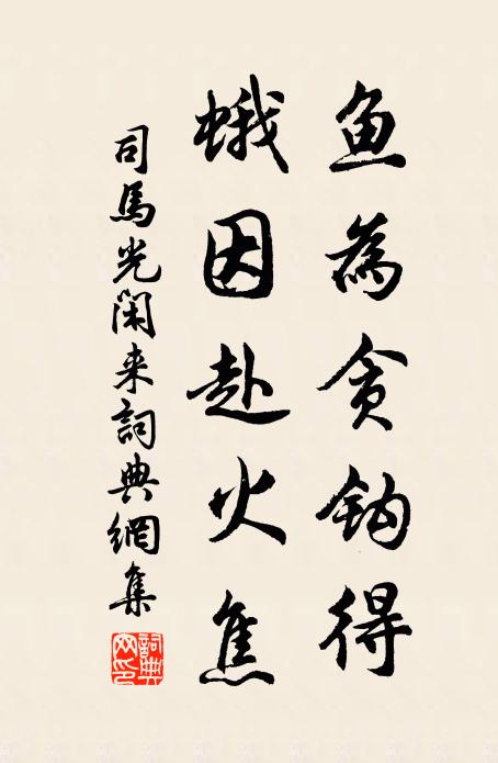 古詩文歷史字典書法欣賞書法字典國語詞典說文解字康熙字典古漢語字典魚為貪鉤得,蛾因赴火焦司馬光 《閒來》名句出處出自宋代司馬光的《閒來》全文:閒來觀萬物,在處可逍遙。魚為貪鉤得,蛾因赴火焦。碧梧飢鸑鷟,白粒飽鷦鷯。帶索誰家子,行歌復采樵。司馬光詩詞大全名句書法欣賞魚為貪鉤得,蛾因赴火焦書法作品司馬光名句,閒來名句名句推薦振綺堂中萬軸書,乾嘉九野有誰如龔自珍《已亥雜詩 162》但與止茲鸞鳳友,共逃不學馬牛襟朱翌《頃入南華僧仲有詩為次其韻仲欲見予詩集》遠翠愁山入臥屏,兩重雲母空烘影溫庭筠《春愁曲》河圖萬古陳東序,汗簡諸儒校石渠陳傅良《寄僧嗣清》無忌牧荊州,仲文嘗趨迎馬之純《擬峴亭詩》無人云閉戶,深夜月為燈。薛紹彭《句》中酣前激昂,四座同氛氳歐陽詹《福州送鄭楚材赴京,時監察劉公亮有感激鄭意》吾徒誠合進,尚念有新尊梅堯臣《依韻和李君讀余注孫子》道人久厭世間濁,僧舍猶存肉食慚蘇轍《寒食二首》歲寒誰覓此窮交,只有梅花發故梢趙蕃《呈明叔七首》向若家居時,安枕春夢熟皇甫曾《遇風雨作(一作權德輿詩)》幸自同樗櫟,何妨愜所懷羅隱《城西作》大用機前轉轆轆,十分慈悲,十分惡毒釋普度《偈頌一百二十三首》但看西行日,歸來一餉榮種道人《贈李用之》待說與山靈,還又羞拈起梁棟《摸魚兒(登鳳凰台)》詩詞推薦【雙調】碧玉簫 七關漢卿〔元代〕膝上琴橫,哀愁動離情。指下風生,瀟灑弄清聲。鎖窗前月色明,雕闌外夜氣清。指法輕,助起騷人興,聽,正漏獻金杯/厭金杯賀鑄〔宋代〕風軟香遲,花深漏短。可憐宵、畫堂春半。碧紗窗影,卷帳蠟燈紅,鴛枕畔。密寫烏絲一段。采苹溪晚。拾翠沙空初至郡齋書事楊億〔宋代〕地去京華遠,年逢旱暵餘。群胥同黠馬,比戶甚枯魚。煦嫗心空切,澄清志莫舒。棼絲殊未治,錯節詎能除。聽訟和鮑守次韻林德祖十四首傅察〔宋代〕銀鉤落紙彩毫輕,醉寫新詩入禁亭。學擅儒宗窮壺奧,文摛墨妙炳丹青。親承零露如金掌,密蔽衝風似寶屏。雅意送鄭十二還廬山別業劉長卿〔唐代〕潯陽數畝宅,歸臥掩柴關。谷口何人待,門前秋草閒。忘機賣藥罷,無語杖藜還。舊筍成寒竹,空齋向暮山。水流惠蓮峰詩以為謝釋文珦〔宋代〕月汀家在帝王都,不藏歌舞唯藏書。舊詫鄴侯三萬軸,君家所藏還有餘。寄我一詩辭縝密,言言皆自書中出。復來富池客中董嗣杲〔宋代〕舍舟遵陸幾程來,家事身謀兩未諧。九地渺茫憐骨肉。四方軒豁暢襟懷。雨翻茶崦春離岳,風颭監旗曉渡淮。短景寄宣議大師英公范杲〔宋代〕西遊久不得師書,睹物相思展篆圖。情厚未忘蓮社約,分深曾伴橘洲居。青雲作陣宜長臥,白酒資吟莫破除。見說落齒韓愈〔唐代〕去年落一牙,今年落一齒。俄然落七七,落勢殊未已。餘存皆動搖,盡落應始止。憶初落一時,但念豁可恥。及至惜黃花(重陽)史浩〔宋代〕秋光將老。黃花開早。露浥清曉,金錢萬疊猶小。簪遍碧雲鬟,壓倒烏紗帽。更把來、玉觴同釂。過□添爐鼎,朱