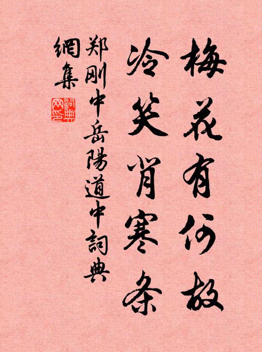 古詩文歷史字典書法欣賞書法字典國語詞典說文解字康熙字典古漢語字典梅花有何故,冷笑背寒條鄭剛中 《岳陽道中》名句出處出自宋代鄭剛中的《岳陽道中》全文:客子方憂畏,津亭更寂寥。亂雲藏野寺,積雪覆溪橋。米潤還難買,酤遲轉不饒。梅花有何故,冷笑背寒條。名句書法欣賞梅花有何故,冷笑背寒條書法作品鄭剛中名句,岳陽道中名句名句推薦明年春晚,松江笠澤,歸約追游李曾伯《眼兒媚(和八窗叔韻送之)》釣魚自薦桃花飯,借曲新篘竹葉醪戴栩《仙都示馬令克》歸歟事斯語,妙理千萬變艾性夫《答釋子問詩法》往事如雲無處問,雲外月、也應知韓元吉《江神子(建安懸戲趙德莊)》虛空講得,參天荊棘釋智遇《亮座主贊》靜鎮資安石,艱危仗武侯吳偉業《讀史雜感》自從手授大雅文,孺子低頭拜黃石王邁《闕題》姑聊爾,招呼楚調,慰藉南冠李曾伯《八聲甘州(自和)》杞人惟恐青天墜,精衛難期碧海乾張昱《感事》靈藥不知何代得,古松應是長年栽方乾《贈天台葉尊師》陶鈞六義別開爐白居易《昨以拙詩十首寄西川杜相公相公亦以新作…用伸答謝》力勸加工用行修,果獲契悟心滿足釋普寧《最明夢一善知識教訓堅固參禪醒後親繪供養越》艤棹江濱訪舊遊,十年重到戲漁洲戴復古《艤棹清江》羨君有酒能共醉,羨君無錢能不憂劉昚虛《贈喬琳(一作劉昚虛詩)》一年一度游山寺,不上靈岩即虎丘范成大《四時田園雜興十二絕》詩詞推薦次肩吾慶生日韻魏了翁〔宋代〕是間正位至虛靈,都把精神逐外明。勸子抱琴歸舊隱,亂雲深處認真情。初到郡齋三首宋祁〔宋代〕暫解樞機任,來從海上閒。浮雲富貴外,一馬是非間。月袞生潮浦,風香墮桂山。蒼生雖擊望,要作冶城還。竹里館王維〔唐代〕獨坐幽篁里,彈琴復長嘯。深林人不知,明月來相照。榮木 其一陶淵明〔魏晉〕采采榮木,結根於茲。晨耀其華,夕已喪之。人生若寄,憔悴有時。靜言孔念,中心悵而。郊外即事七首袁燮〔宋代〕乍從塵土俯澄泓,瑩徹心神眼倍明。天下淵泉有如此,流清端的自源清。滿庭芳馬鈺〔元代〕專違寧海,專游陝右。專來有何乾勾。專住環牆,專守天長地久。專遠氣財酒色,專清靜、專修九九。專一志,更臨終詩傅得一〔宋代〕平生膽氣清高,抱道長樂逍遙。天地陰陽反覆,雲收霧卷丹霄。卜運算元洪咨夔〔宋代〕簸弄柳梢春,呼吸花心露。倦粉嬌黃扇底風,盡向眉心度。喚醒海棠紅,約住櫻桃素。上到瑤台最上層,共跨青鸞答張諲、劉方平兼呈賀蘭廣皇甫冉〔唐代〕野性難馴狎,荒郊自閉門。心閒同海鳥,日夕戀山村。屢枉瓊瑤贈,如今道術存。遠峰時振策,春雨耐香源。復有和范景仁王景彝殿中雜題三十八首並次韻其二梅堯臣〔宋代〕文章老重欲追古,便作帝宮蒼檜詩。青蔥玉樹傳楊子,盤屈洪桃見左思。龍鱗已愛松身直,珠實還看柏葉垂。秀木