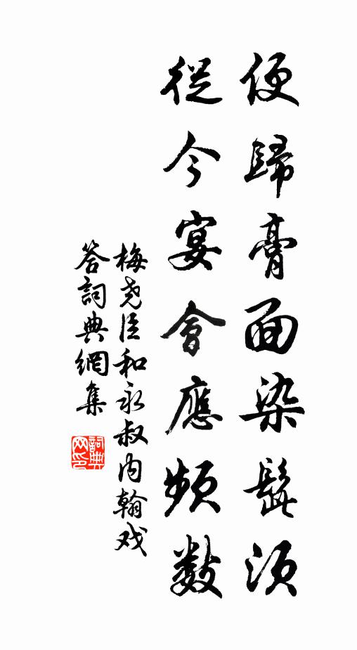 古詩文歷史字典書法欣賞書法字典國語詞典說文解字康熙字典古漢語字典便歸膏面染髭鬚,從今宴會應頻數梅堯臣 《和永叔內翰戲答》名句出處出自宋代梅堯臣的《和永叔內翰戲答》全文:從他舞姝笑我老,笑終是喜不是惡。固勝兔子固勝鶴,四蹄撲握長啄啄。任看色與月光混,只欲走飛情意薄。拘之以籠縻以索,必不似纖腰夸綽約。主人既賢豪,能使賓客樂。便歸膏面染髭鬚,從今宴會應頻數。名句書法欣賞便歸膏面染髭鬚,從今宴會應頻數書法作品梅堯臣名句,和永叔內翰戲答名句名句推薦天欲兆豐年郭應祥《菩薩蠻(喜雪)》周山賣卻不要錢,袁家送酒一破顏楊萬里《跋袁起岩所藏後湖帖並遺像一軸,詩中語皆檃》十年湖海間,耕硯苦不穡林景熙《送胡汲古歸嚴陵覲親》流浪隨所之,縈紆牽所繞元稹《憶雲之》歲度思菽藻,茫然愧鹿車張玉孃《秋夜》爰自彖及系,纂述屢脫稿方回《次韻君澤正月五日早見示》汴湍入秋漲,東鼓下鏜鏜梅堯臣《送淮南轉運李學士君錫》三殿稱觴,九儀就列,韶頀鏘金奏柳永《永遇樂(二之一·歇指調)》南山西出秦,迤邐序等級李復《因何常德招游西塔有詩遂和》一片初心分付處,兒孫他日記衰翁陳著《上乘展墓示子侄》蜀道銅山,石崇金谷,禍臨身財佚名《【中呂】快活三過朝天子_芝蘭種不生》相懷未能去,來雁又成群釋智圓《寄江上僧》莫言牆陰數尺間,老卻主人如等閒劉禹錫《牆陰歌》吾方笑樂天,為此外物攖岳珂《予自武昌攜二猿歸夜聞清嘯偶成》催詩急雨來迢遞,吹面涼風過等間王邁《西軒春坐》詩詞推薦採桑子黃庭堅〔宋代〕投荒萬里無歸路,雪點鬢繁。度鬼門關。已拼兒童作楚蠻。黃雲苦竹啼歸去,繞荔枝山。蓬戶身閒。歌板誰家教小讀誠齋新酒歌仍效其體王邁〔宋代〕先生出奇作新酒,自作自歌自為壽。酒徒欲舉吾盃,先挽天河濯渠手。誰知先生詩更奇,刊落陳言付芻狗。俗人慾與沔上人釋慧空〔宋代〕參禪無悟處,如何得安樂。置之空劫前,即為空劫縛。任運日用中,拶著無不錯。懵然百不理,柰此一絡索。勇猛約客春波督參劉郎中方赴高紫微之集道間相值岳珂〔宋代〕錦帳星郎油壁車,紫微花下醉流霞。簫鸞東引瞻風馭,池鳳西遊賦日華。蓼岸半紅秋漸老,柳堤仍綠約猶賒。一尊次韻弟茝懷歸陳著〔宋代〕同聲相應甚塤箎,雨夜聯床只有詩。斷港漫生歸棹興,流年空感浴蘭時。良思難與世情說,衰病聊將僧定移。須信賢者之孝二百四十首柳下惠林同〔宋代〕忍於父母國,去此欲何之。所以柳下季,三為魯士師。偈頌一百二十三首釋普度〔宋代〕用鈯斧子,非重非輕。拈起放下,肘後符靈。生查子(藥名寄章得象陳情)陳亞〔宋代〕朝廷數擢賢,旋占凌霄路。自是鬱陶人,險難無移處。也知沒藥療饑寒,食薄何相誤。大幅紙連粘,甘草歸田賦。首尾吟邵雍〔宋代〕堯夫非是愛吟詩,詩是堯夫自試時。事體待諳然後信,人情非久莫能知。同沾雨露蒿萊質,獨出雪霜松柏姿。見慣贈朱少南別二首李呂〔宋代〕朱君精到古人趣,踏遍東南稱獨步。只今應詔非乏材,預煩拈出橫樑具。