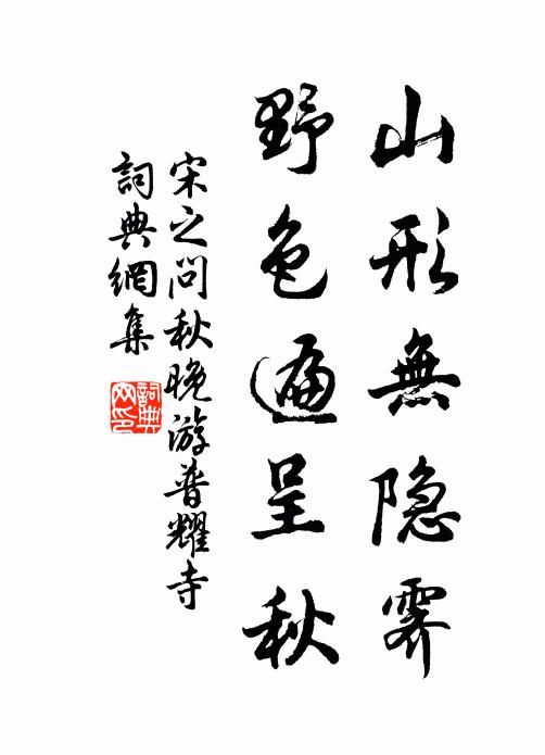 古詩文歷史字典書法欣賞書法字典國語詞典說文解字康熙字典古漢語字典山形無隱霽,野色遍呈秋宋之問 《秋晚游普耀寺》名句出處出自唐代宋之問的《秋晚游普耀寺》全文:薄暮曲江頭,仁祠暫可留。山形無隱霽,野色遍呈秋。荷覆香泉密,藤緣寶樹幽。平生厭塵事,過此忽悠悠。宋之問詩詞大全名句書法欣賞山形無隱霽,野色遍呈秋書法作品宋之問名句,秋晚游普耀寺名句名句推薦看到阿鹹俱白髮,百年門戶共支撐宋自遜《壽鐵石翁》落花天紅雨紛紛,芳草墜蒼煙袞袞湯舜民《【中呂】醉高歌帶紅繡鞋 客中題壁》雲蓋青山龍臥處,日臨丹洞鶴歸時劉禹錫《 * 山》開山屬老夫,愛山必同類朱翌《飯大湧泉入紫微洞洞乃余尋出》天宮日暖閣門開,獨上迎春飲一杯白居易《早春獨登天宮閣》寧當不俟報,歸袖風披披韓愈《送張道士》遠水入簾幕,淅瀝吹酒舫元結《宴湖上亭作》闌珊,香銷輕夢還納蘭性德《河傳·春淺》堂堂夫人,凌鄭同派黃庭堅《故陳氏畫像贊》緬懷滄洲間李白《春日獨酌其二》萬億及很,如坻如京佚名《紹興祀太社太稷十七首》友是弟兄常底事,仁於父子本然天王義山《題鄭氏義門》已把朝冠掛神武,終身一幅華陽巾劉克莊《三和》坡書已得歐公體,力士宜尊太白靴江萬里《和瑞雪》田少食指多,讀書飢鳶鳴洪咨夔《示諸兒》詩詞推薦送彭侍晨白玉蟾〔宋代〕鐵髭鶻眼兩顏酡,走遍江湖所得多。腳踏雷車朝帝極,手持斗柄戽天河。劍尖指處乾坤暗,丹篆書時鬼魅號。名滿清樾軒曾逮〔宋代〕開軒在獨園,繞屋得清樾。不知何年樹,殆為今日設。窗扉落林影,時復亂風月。喧聲了不聞,幽弄極可悅。玉溪黑漆弩 為樂府焦元美賦,用馮海粟韻張可久〔元代〕畫船來向高沙駐。便上躡探梅吟屨。對金山有玉娉婷,兩點愁峰眉聚。倚西風目斷行雲,懶唱大江東去。借中郎爨從軍詩王粲〔魏晉〕樓船凌洪波。尋戈刺羣虜。挽武宣教徯四首廖行之〔宋代〕生平耿耿不忘君,位下才高氣不群。手取科名如拾芥,眼高富貴等浮雲。只知世可行吾道,其奈天將喪此文。知遇本事詩蘇曼殊〔近現代〕愧向尊前說報恩,香殘玦黛淺含顰。卿自無言儂已會,湘蘭天女是前身。小師清默請贊釋大觀〔宋代〕直如鉤,曲如弦。拍盲使去,罔測其然。不解深跧,強出人前。默然兮意傳更待驢年。山齋獨坐,喜玄上人夕至(一作見訪)錢起〔唐代〕舍下虎溪徑,煙霞入暝開。柴門兼竹靜,山月與僧來。心瑩紅蓮水,言忘綠茗杯。前峰曙更好,斜漢欲西回。五月二十七日夜大雨前三日熱甚虞儔〔宋代〕雷車誰喚阿時推,釀雨雲頭簇不開。猛熱急欣江漢立,先聲偏上竹梧來。高唐賦就何曾夢,杜曲詩成不費催。頗欲過故家有感王柏〔宋代〕衣冠零落久,今日事堪傷。廚起青煙薄,門關白日長。殘梅欹古道,枯柳臣頹牆。山色依然好,興衰未可量。