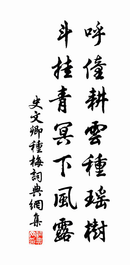 古詩文歷史字典書法欣賞書法字典國語詞典說文解字康熙字典古漢語字典呼僮耕雲種瑤樹,斗掛青冥下風露史文卿 《種梅》名句出處出自宋代史文卿的《種梅》全文:呼僮耕雲種瑤樹,斗掛青冥下風露。隔林野鶴不知寒,為我飛來復飛去。史文卿詩詞大全名句書法欣賞呼僮耕雲種瑤樹,斗掛青冥下風露書法作品史文卿名句,種梅名句名句推薦那步輕輕慢撒,移蹤款款微踏呂止庵《【雙調】夜行船_詠金蓮顏色》已息漢陰誚,且同濠上觀奚賈《嚴陵灘下寄常建》萬象正蕭爽,秋雨滴梧桐葛長庚《水調歌頭(丙子中元後風雨有感)》浮萍依綠水,弱蔦寄青松魏氏《贈外》胸蟠載籍餘萬卷,為家五百九十六喻良能《李侍郎三和屋字詩次韻為謝》君子貴知足,知足萬慮輕趙孟頫《題耕織圖二十四首奉懿旨撰》此心此地俱寬閒,從渠曠野多風寒章甫《移家謝趙再可》此拐又從何處去,飄蓬一任西東王以寧《臨江仙(與劉拐)》渭上衣冠故老哀,西陵石徑已莓苔張耒《奉安神考御容入景靈宮小臣獲睹有感二首》夏康纘禹績,代祖復漢勛賈至《自蜀奉冊命往朔方途中呈韋左相文部房尚書門下崔侍郎》幽澗畔,疏籬側呂勝己《滿江紅》征塗不須厭,蓬轉本無根陸游《雙溪道中》上天連日擁愁雲,曉起聯翩瑞色新郭印《詠雪》直待雪晴冰滿路,騎驢相逐尋詩去王冕《秋山圖》易躋廿四中書考,難聚三千聽講生趙汝騰《壽致政徐光祿》詩詞推薦踏雲行劉處玄〔元代〕到處為家,鶉居無戀。要行便去雲遊轉。陰陽之外物難拘,長安咫尺真非遠。道樂希夷,死生永免。亘初一點光如送梅龍圖公儀知杭州歐陽修〔宋代〕萬室東南富且繁,羨君風力有餘閒。漁樵人樂江湖外,談笑詩成◇俎間。日暖梨花催美酒,天寒桂子落空山。郵筒謁南嶽劉克莊〔宋代〕中原昔分裂,五嶽僅存一。嗟餘生東南,有眼乃未覿。清晨犯寒慄,馬上青歷歷。怪云何處來,對面失崷崒。午投對雨贈李主簿、高秀才韋應物〔唐代〕邐迤曙雲薄,散漫東風來。青山滿春野,微雨灑輕埃。吏局勞佳士,賓筵得上才。終朝狎文墨,高興共徘徊。精衛填海佚名〔先秦〕又北二百里,曰發鳩之山,其上多柘木,有鳥焉,其狀如烏,文首,白喙,赤足,名曰:“精衛”,其鳴自詨。是寄別向運判德獻移閩憲楊萬里〔宋代〕再歲三移節,千山一據鞍。梅花錦囊古,霜月繡衣寒。民欲刑幾措,公於此豈難?誰令清廟器?未著侍臣冠。立春日有懷楊萬里〔宋代〕飄蓬敢恨一年遲,客里春光也自宜。白玉青絲那得謊,一杯咽下少陵詩。送曹士弘四明丈亭巡檢並呈前尚書翰林學士王方回〔宋代〕之子博古今,妙年著儒冠。顧肯易戎服,屑為游徼官。未喜弓力武,尚愛虀鹽酸。紫面頰骨聳,赤心膽氣完。得非瑞鷓鴣華岳〔宋代〕挑盡銀缸半夜花。拍簾風勁卷龍沙。香傳梅福深深意,春在錢塘小小家。鴛被半閒才子恨,鶯簧初轉史君夸。歸來菩薩蠻王庭珪〔宋代〕武陵西上沅陵渡。扁舟忘了來時路。花外有人煙。相逢疑是仙。清尊留夜語。醉倒知何處。歸去客心驚。金雞嘲哳